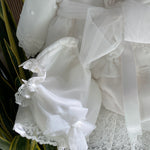 Taufkleid mit langen Ärmeln aus weißer Spitze, mit Rüschenkragen und pfirsichfarbenem Taillenband mit seitlicher Blume.