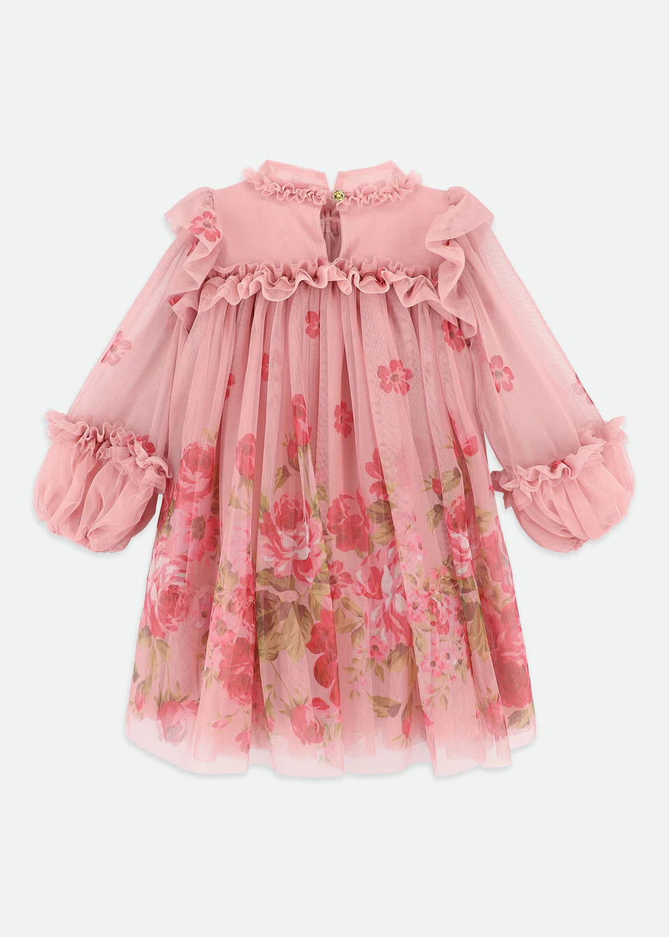 Splendido abito da neonata in tulle floreale rosa. Questo voluminoso abito in tulle è perfetto per feste o occasioni speciali. Maniche lunghe a sbuffo con polsini elasticizzati, volant lungo il carré e la scollatura e morbide arricciature creano una silhouette elegante. Interamente foderato in morbido misto cotone elasticizzato. L'abito è completato dal nostro fiocco esclusivo, con chiusura sul retro con un bottone dorato.