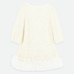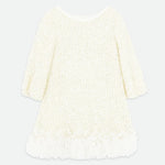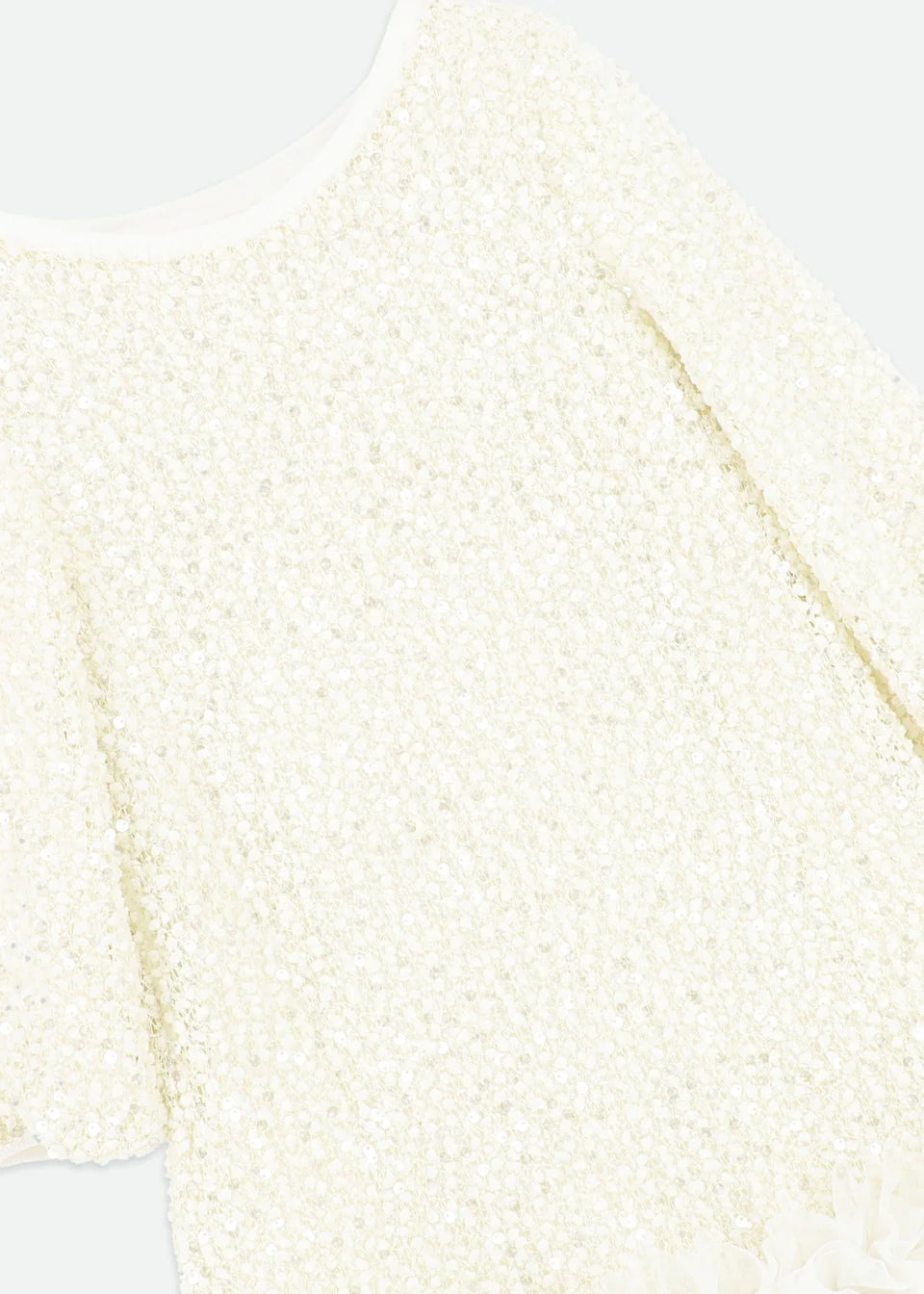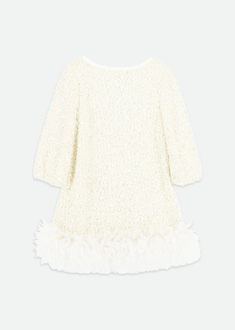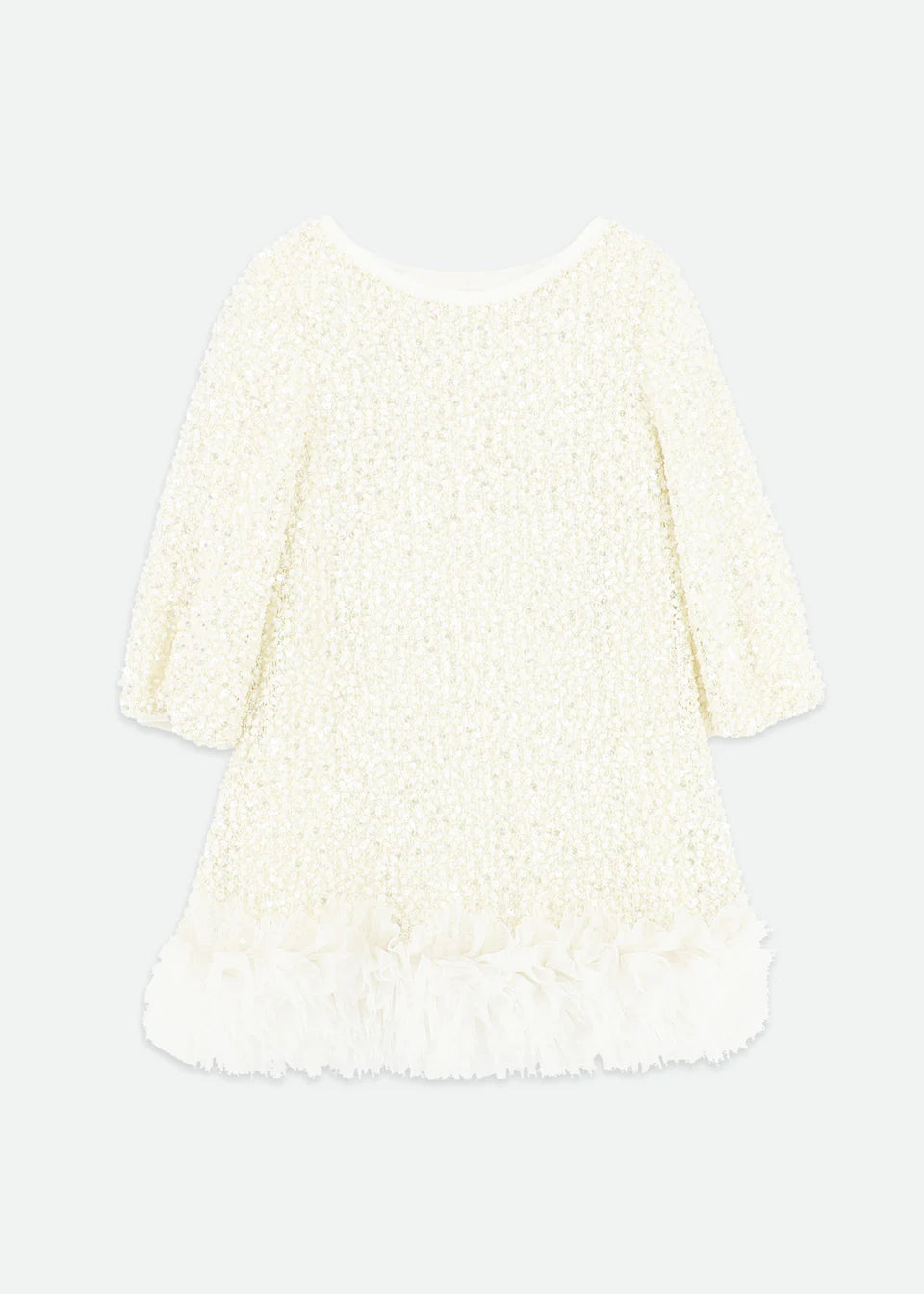 Fai il tuo ingresso con questo scintillante abito di paillettes per bambine. Ricoperto interamente di scintillanti paillettes bianche, questo elegante abito presenta maniche lunghe e un voluminoso orlo in morbido tulle per un tocco di stile e movimento in più. Un piccolo fiocco in gros-grain con il nostro caratteristico ciondolo a forma di cuore dorato decora il lato, aggiungendo un tocco di dolcezza. Completamente foderato in morbido cotone per il massimo comfort sulla pelle, questo capo sfarzoso è perfetto per feste e occasioni speciali.