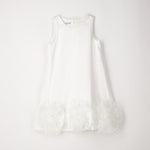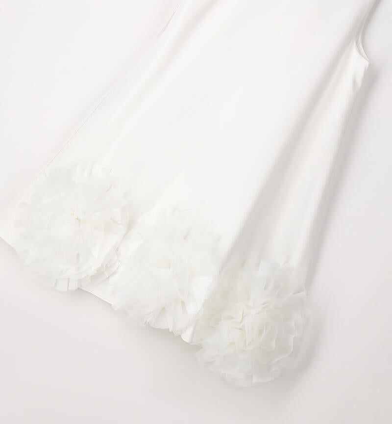 Abito elegante per ragazza Sarabanda realizzato in satin con applicazione sul fondo in organza. Inserto in tulle nel sotto gonna. Fodera in cotone. Apertura dietro con zip invisibile e fiocco dietro. Lunghezza sopra al ginocchio. Il modello fa parte della collezione Sarabanda Premium pensata per vestire le cerimonie più formali.