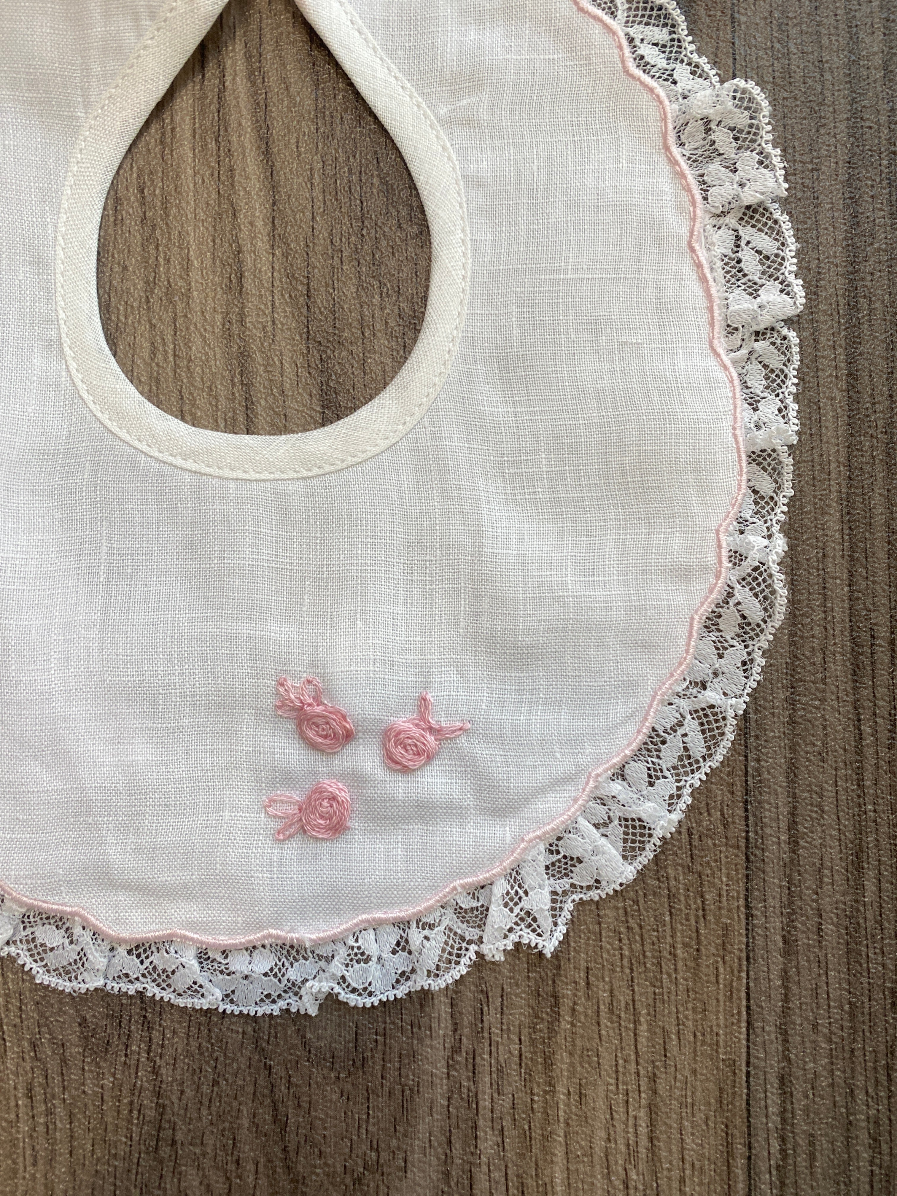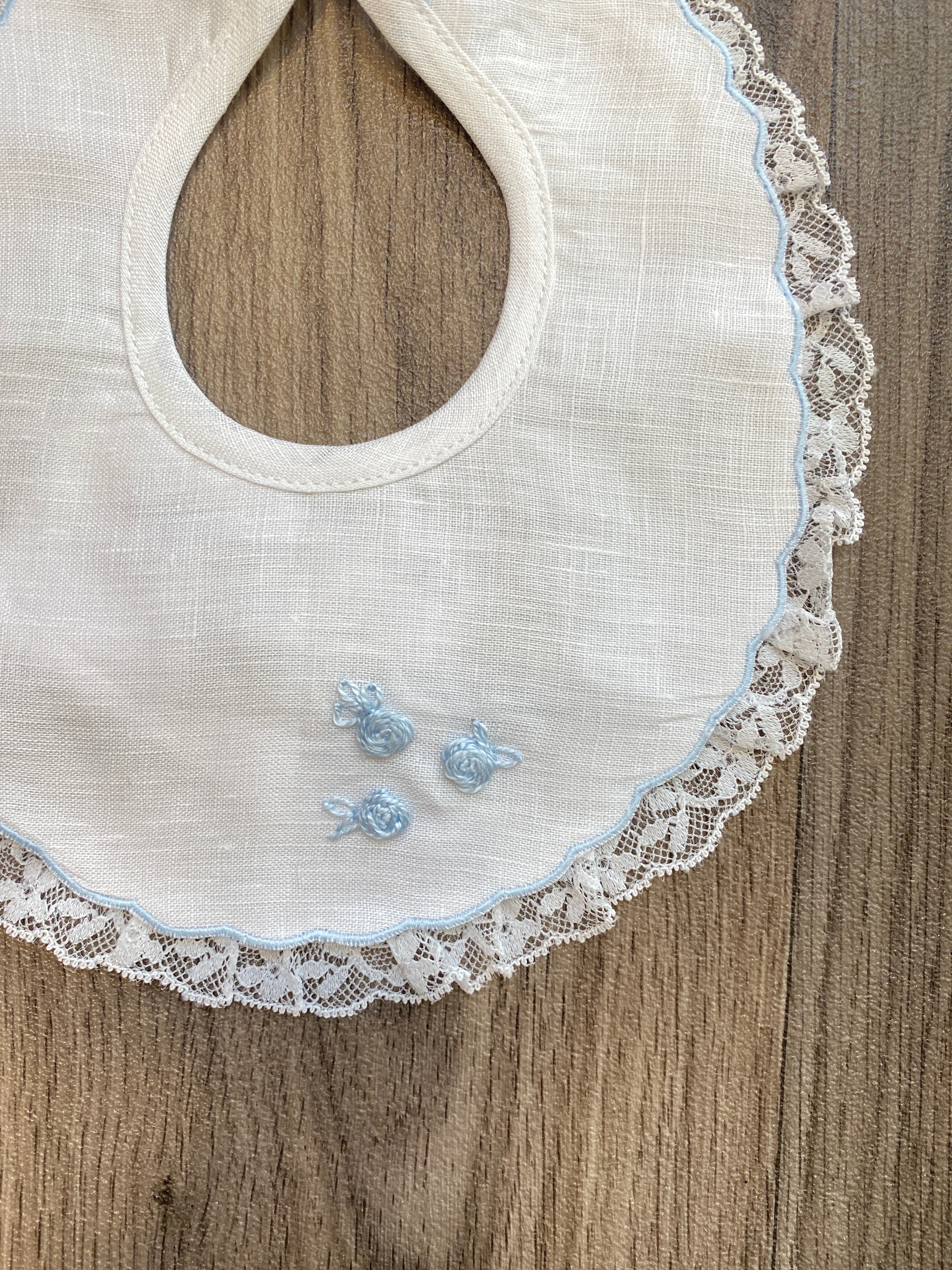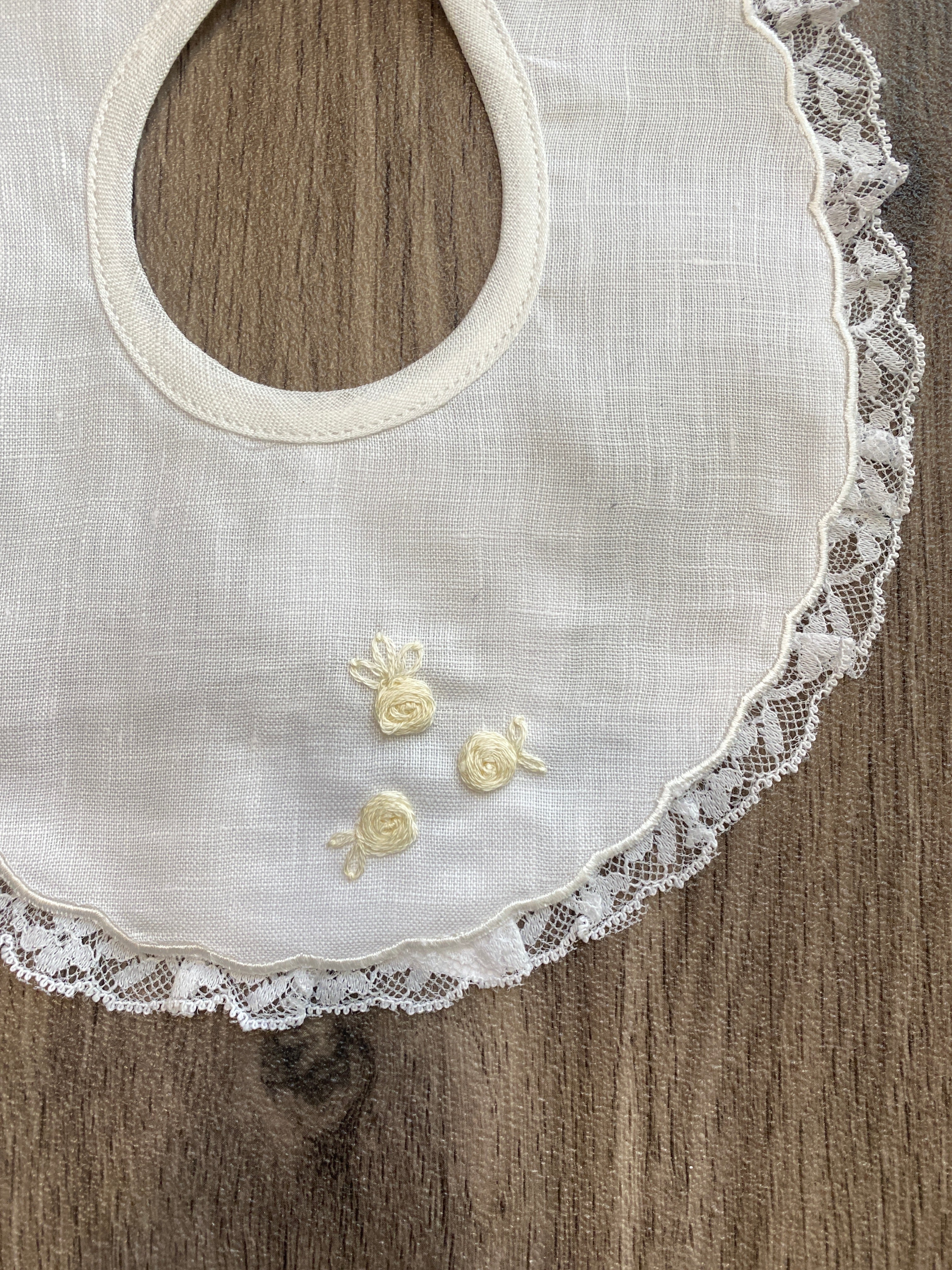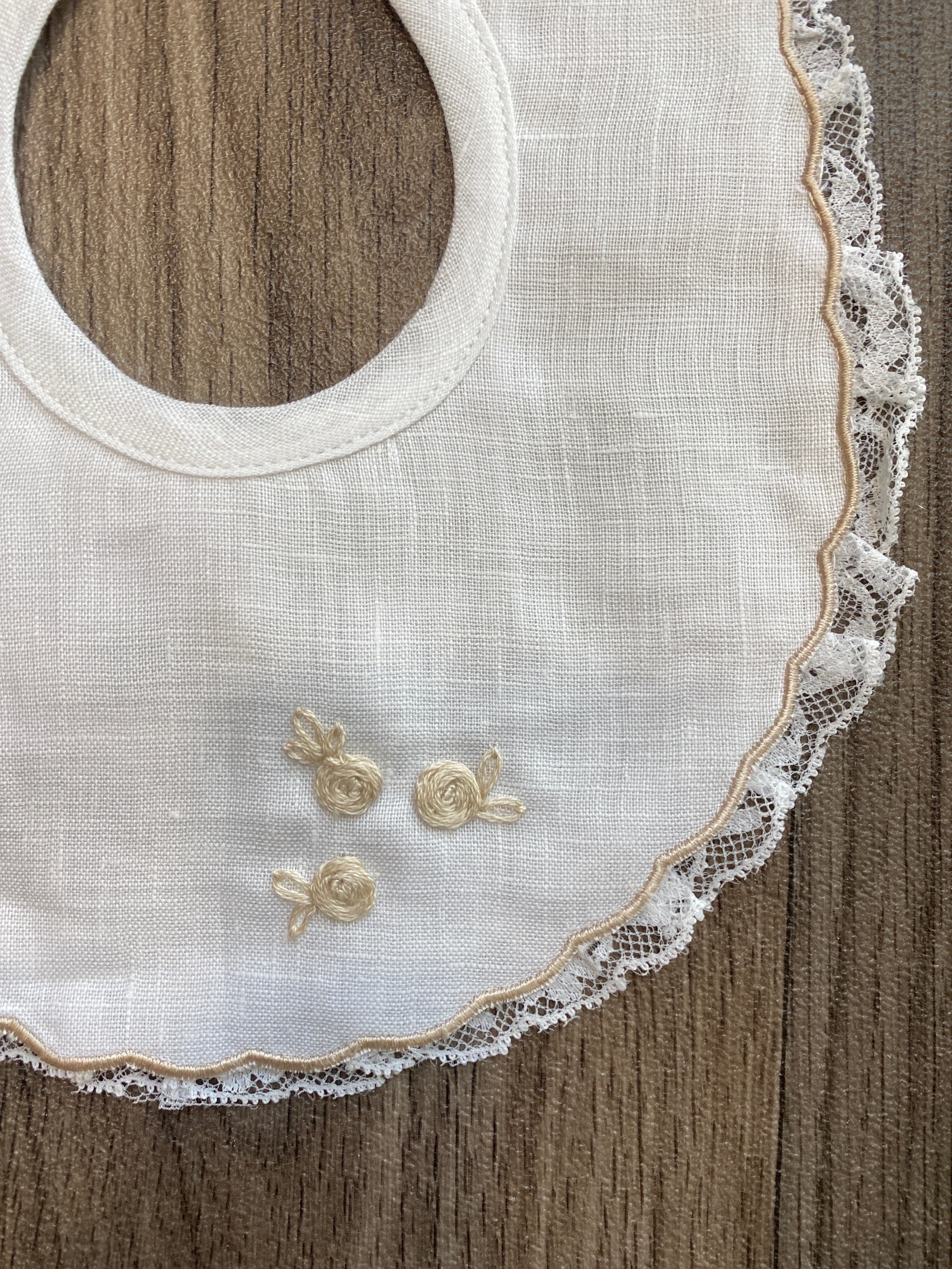 Questa bavetta in lino con ricamo e pizzo valencienne è perfetta per i neonati. Il lino è un materiale naturale e traspirante, ideale per la pelle delicata dei neonati. Il ricamo a mano di roselline aggiunge un tocco di eleganza e dolcezza. Disegnata e realizzata con cura dalla Sartoria dei Piccoli.