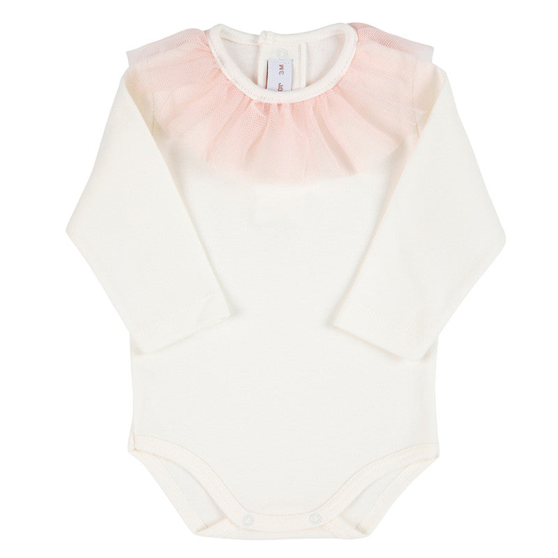 Questo body in caldo cotone per neonata, completo di collo a rouche in tulle, unisce stile e comodità. Ideale per completare ogni look, offre un comfort ottimale grazie al tessuto caldo e morbido, perfetto per mantenere la pelle delicata della tua piccola sempre protetta e avvolta. Pratico da indossare, è una scelta esperta per vestire la tua bambina con eleganza e cura.