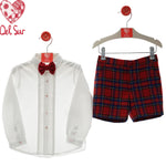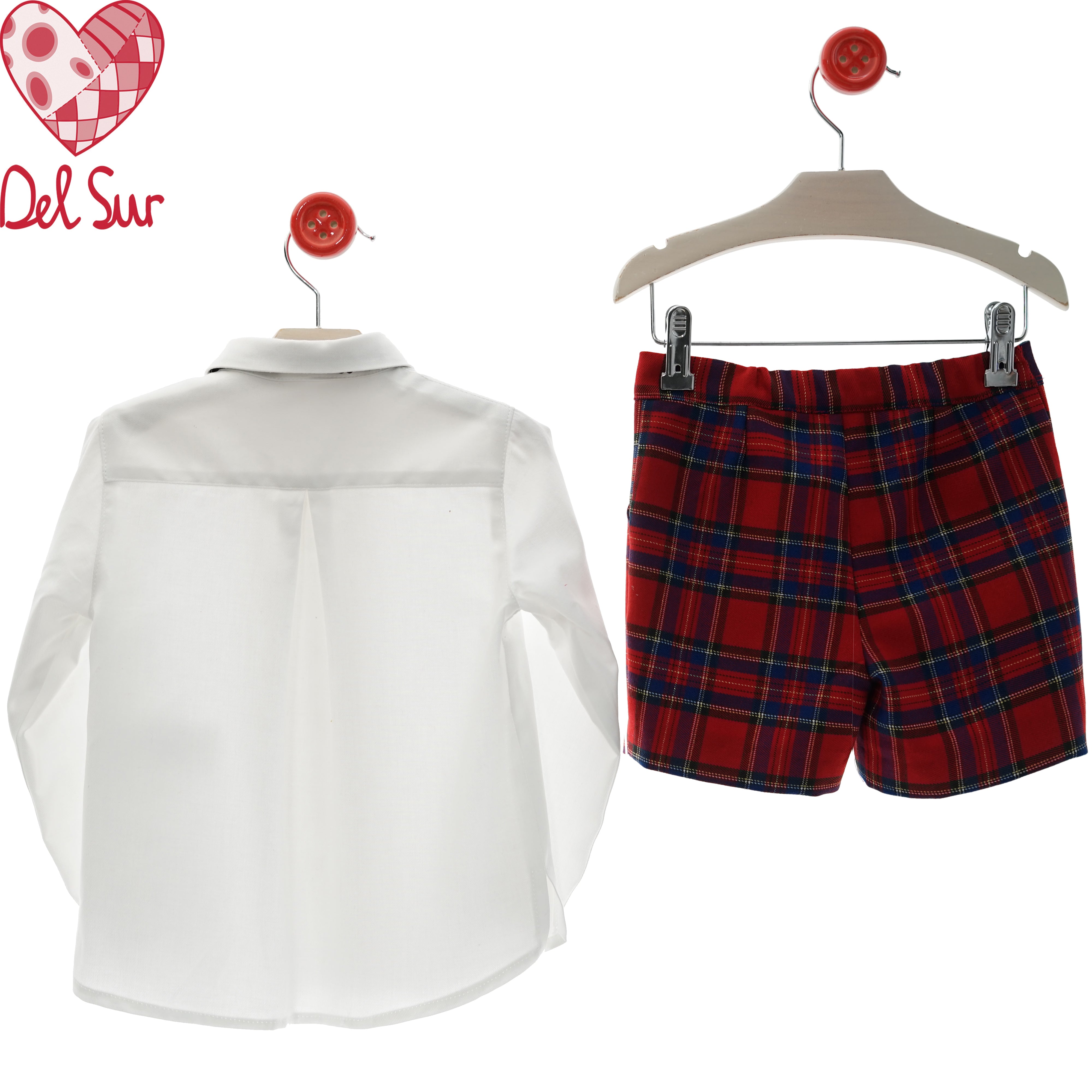 Questo completo da bambino DEL SUR è perfetto per le festività natalizie, offrendo stile e comfort in caldo cotone. La bermuda a motivo scozzese si abbina con eleganza alla camicia bianca tinta unita, impreziosita da un papillon in velluto rosso, rendendo l’outfit raffinato e adatto a occasioni speciali. Un capolavoro di moda infantile pensato per garantire un look curato e confortevole nei momenti di festa.