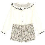 Questo completo due pezzi per bambina unisce eleganza e comfort grazie ai shorts in tessuto operato con effetto gonna e alla camicia in caldo cotone con collo a rouches. Perfetto per un look alla moda e casual, garantisce morbidezza e vestibilità ideale per ogni occasione.