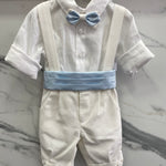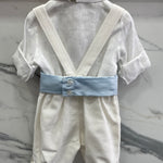 Questo completo elegante, perfetto per neonati, è ideale per occasioni speciali. La camicia in lino è arricchita da una graziosa fascia azzurra in vita e il papillon doppiato aggiunge un tocco di eleganza. Il pantalone alla zuava, realizzato in morbido cotone effetto lino, garantisce il massimo comfort per il tuo piccolo.