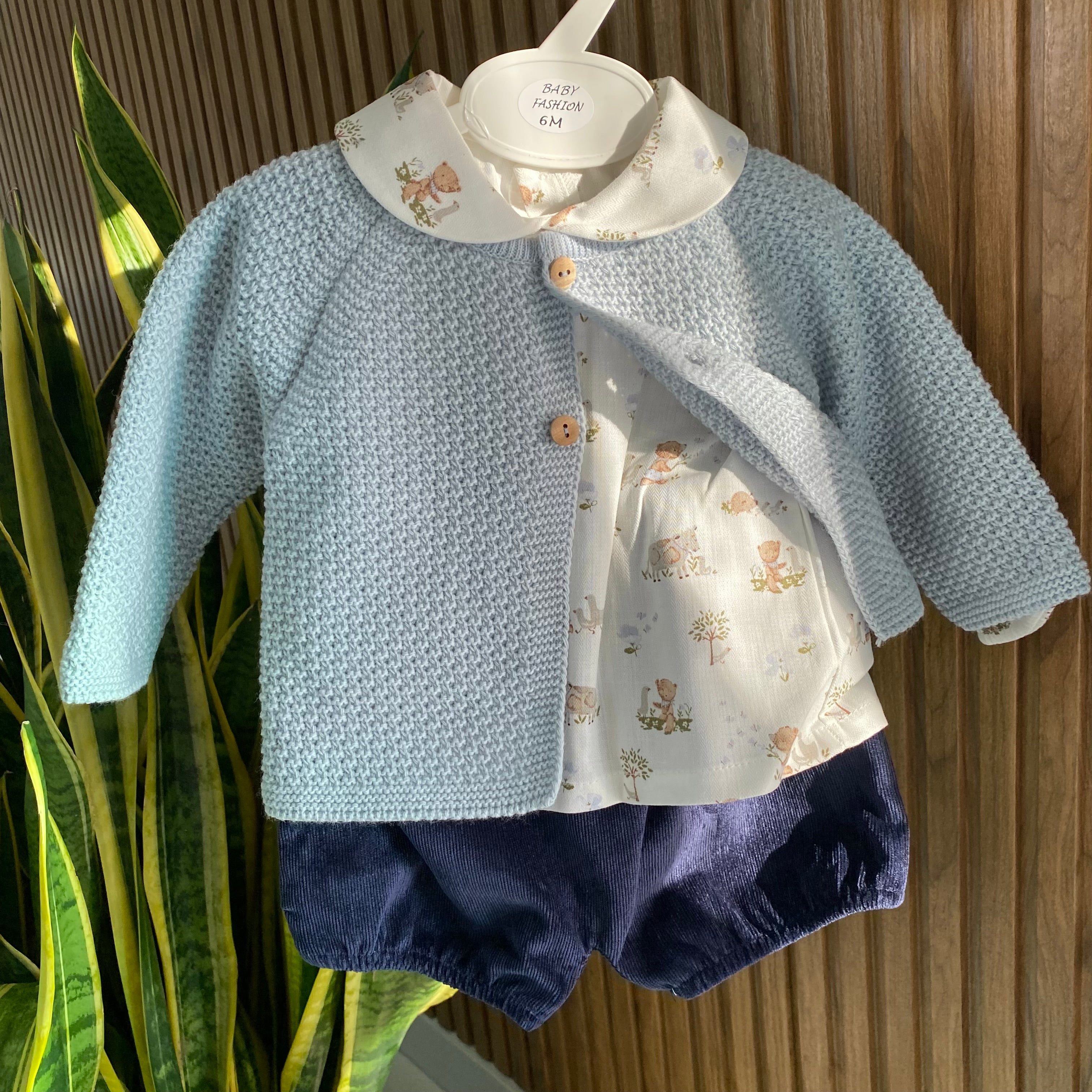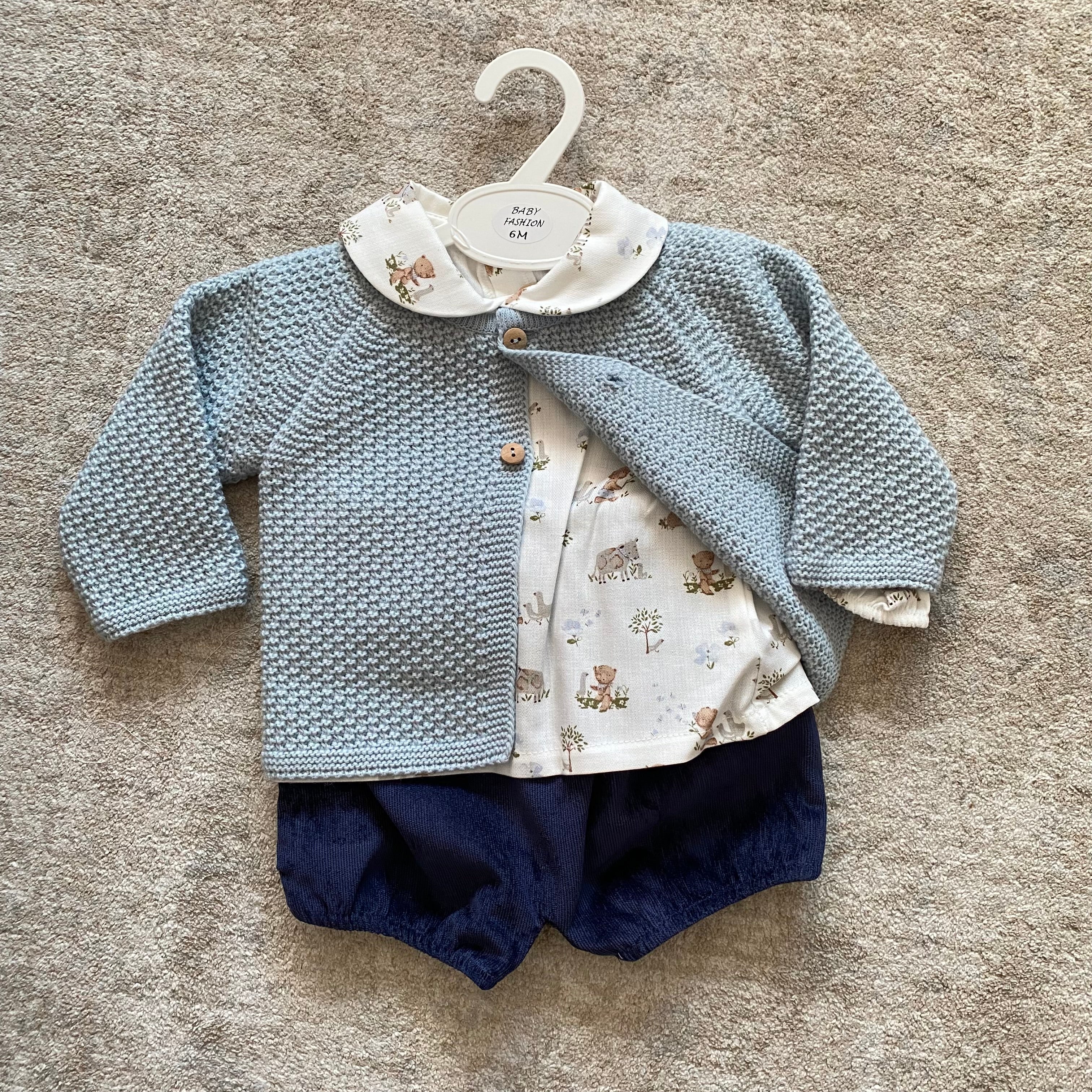 Esclusivo e alla moda, il completo tre pezzi BABY FASHION è perfetto per il tuo neonato. Con bermuda in morbido velluto millerighe, camicia bianca stampata con collo tondo e cardigan in tessuto anallergico acrilico, il tuo bambino sarà sempre elegante e comodo per ogni occasione.