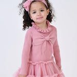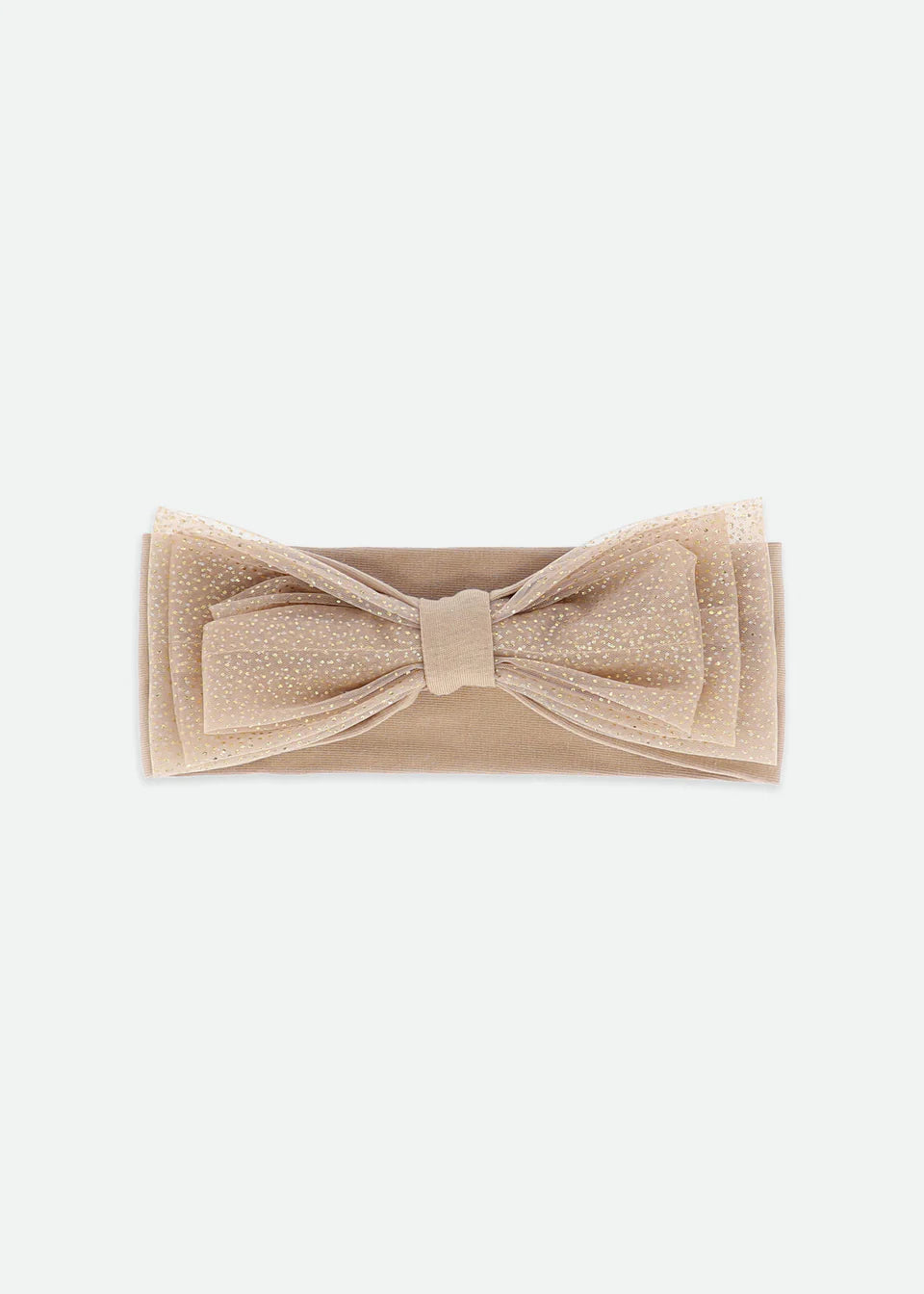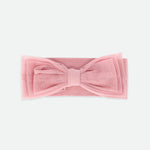 Fascia per capelli con fiocco per neonata, color rosa tea, impreziosita da strati di morbido tulle. La fascia è realizzata in morbidissimo cotone elasticizzato per una vestibilità comoda e confortevole.