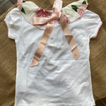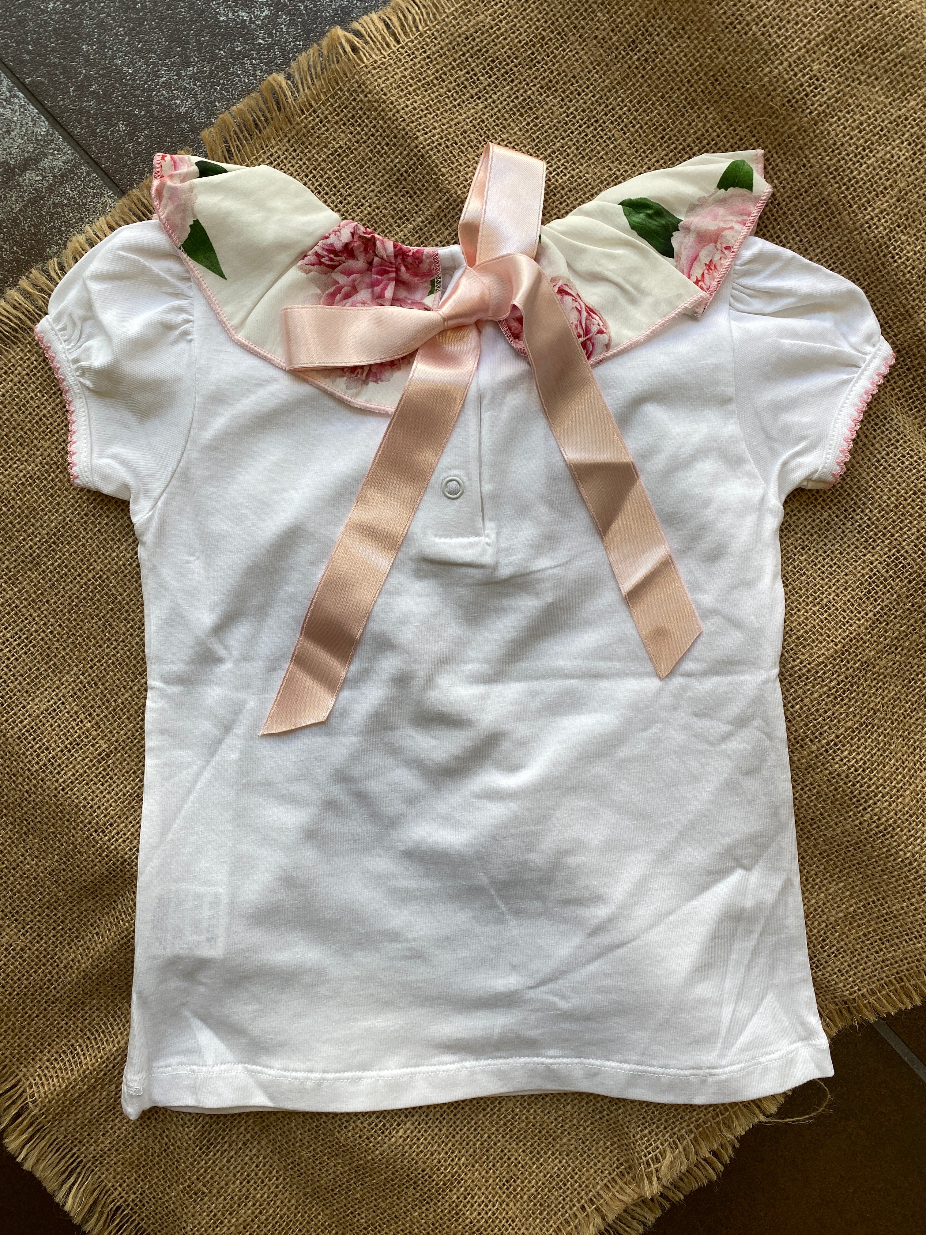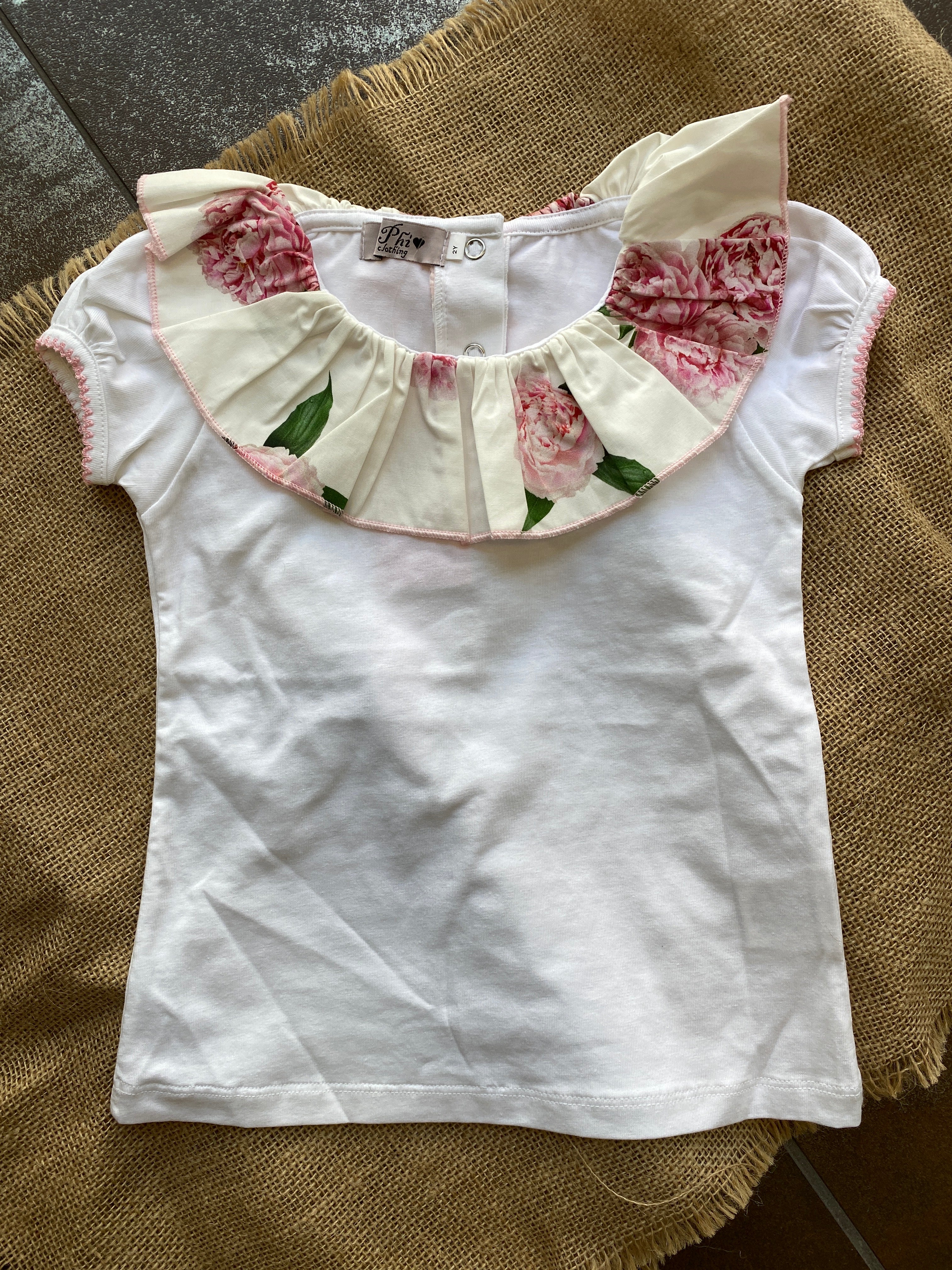 Am Kragen zeigt die Rüschen mit der Fantasie von rosa Pfingstrosen.