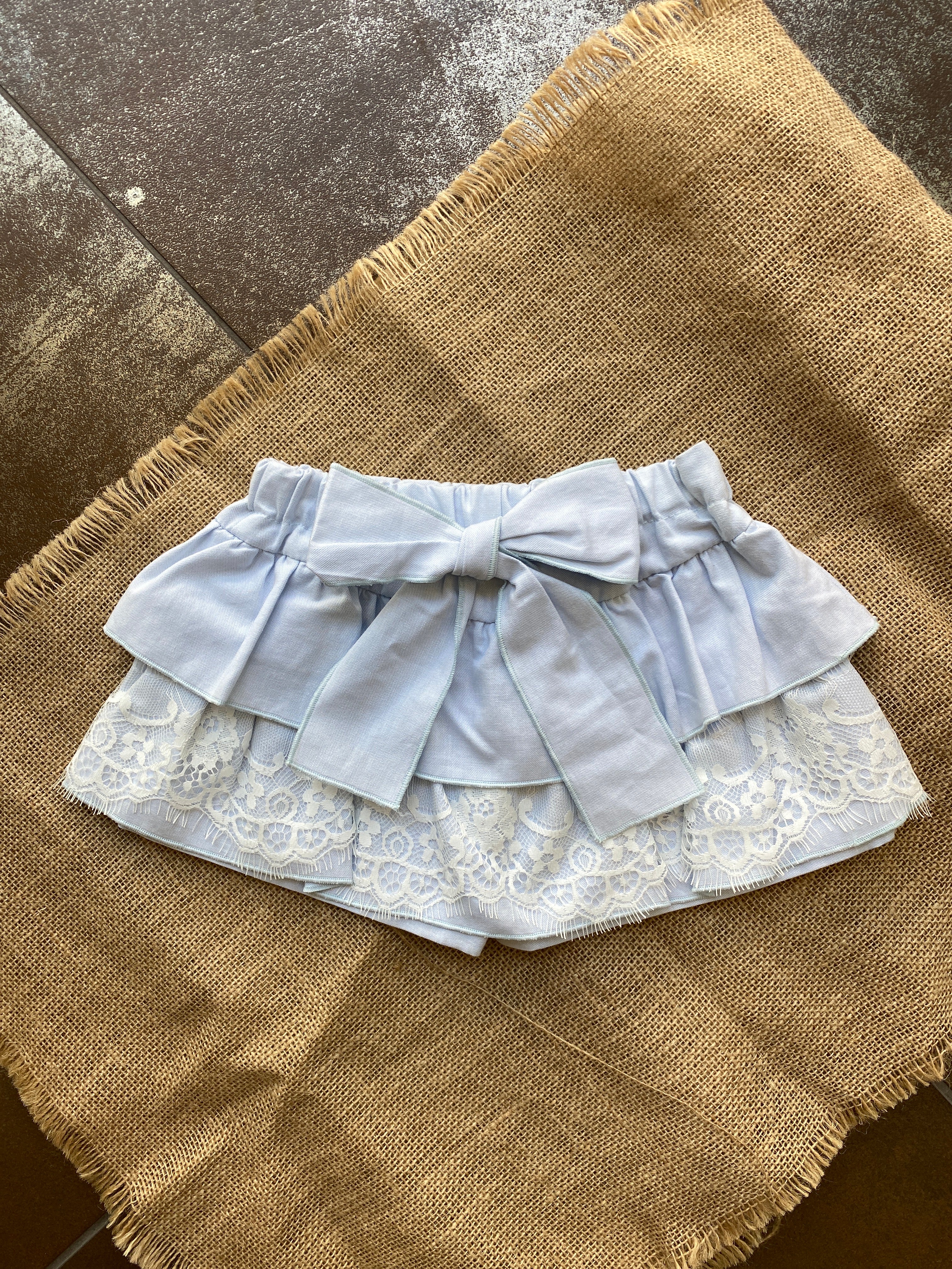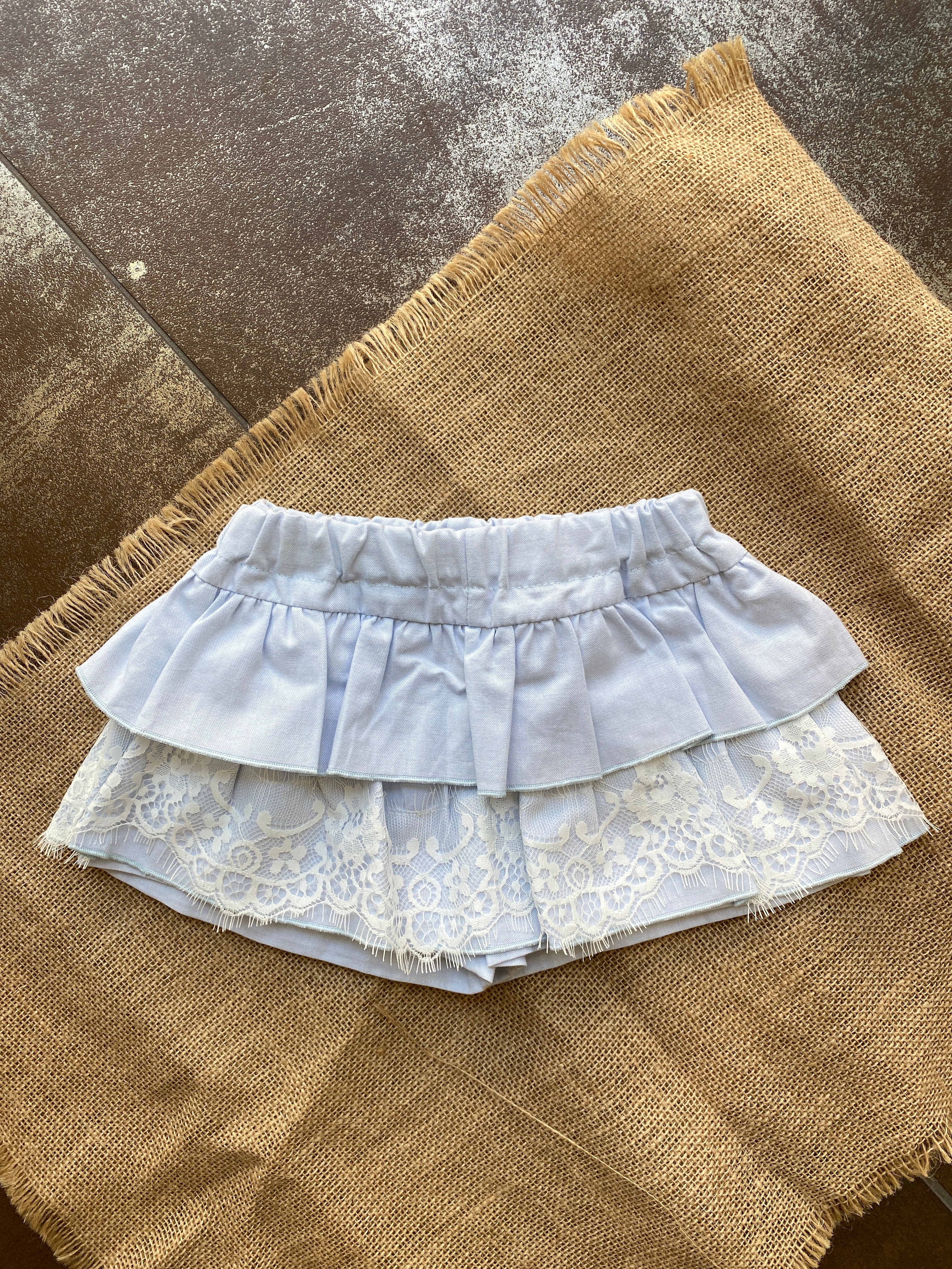 Hellblaue Baumwollshorts mit Rockeffekt und Volants, die mit weißer Spitze verziert sind.