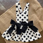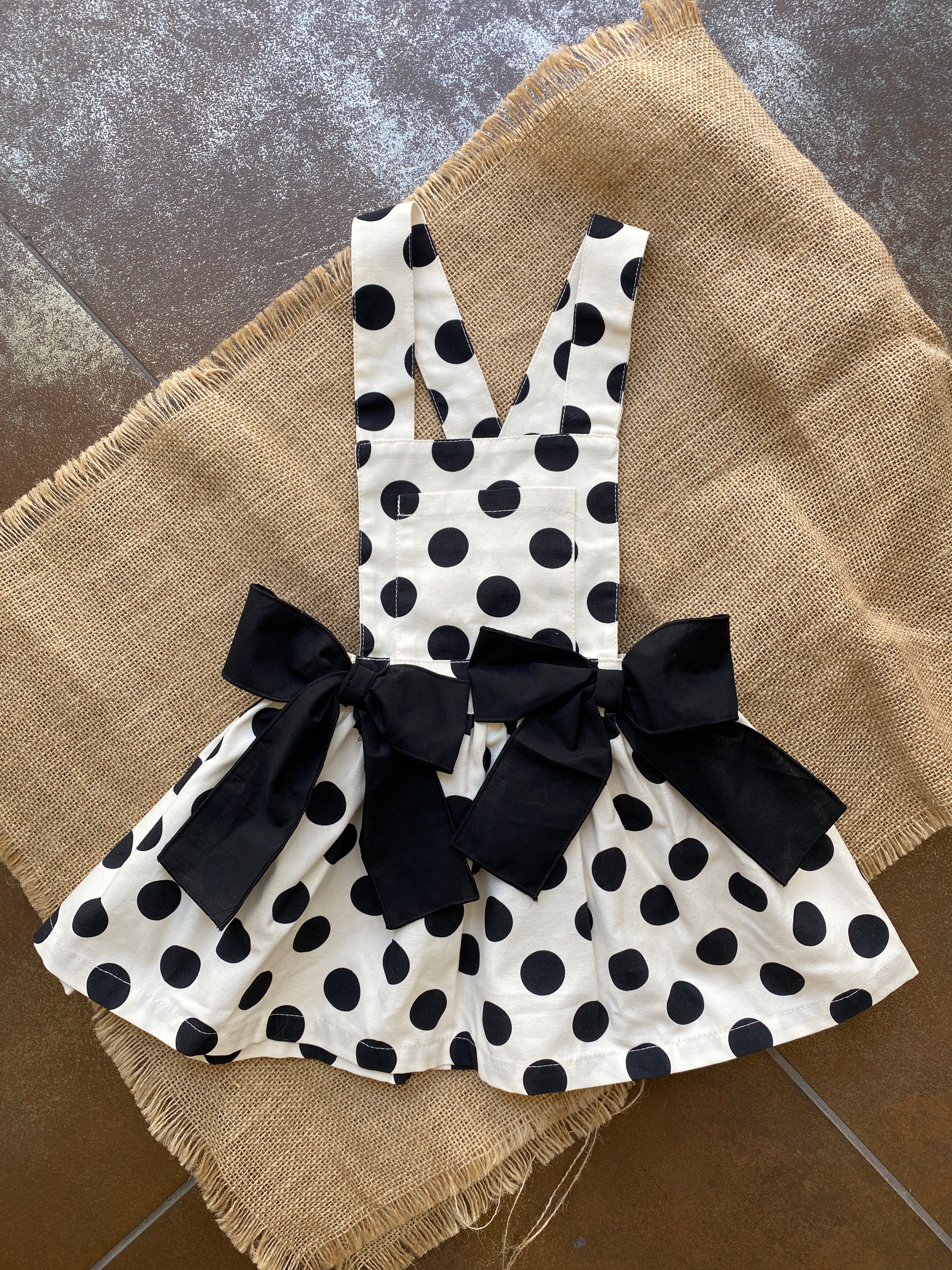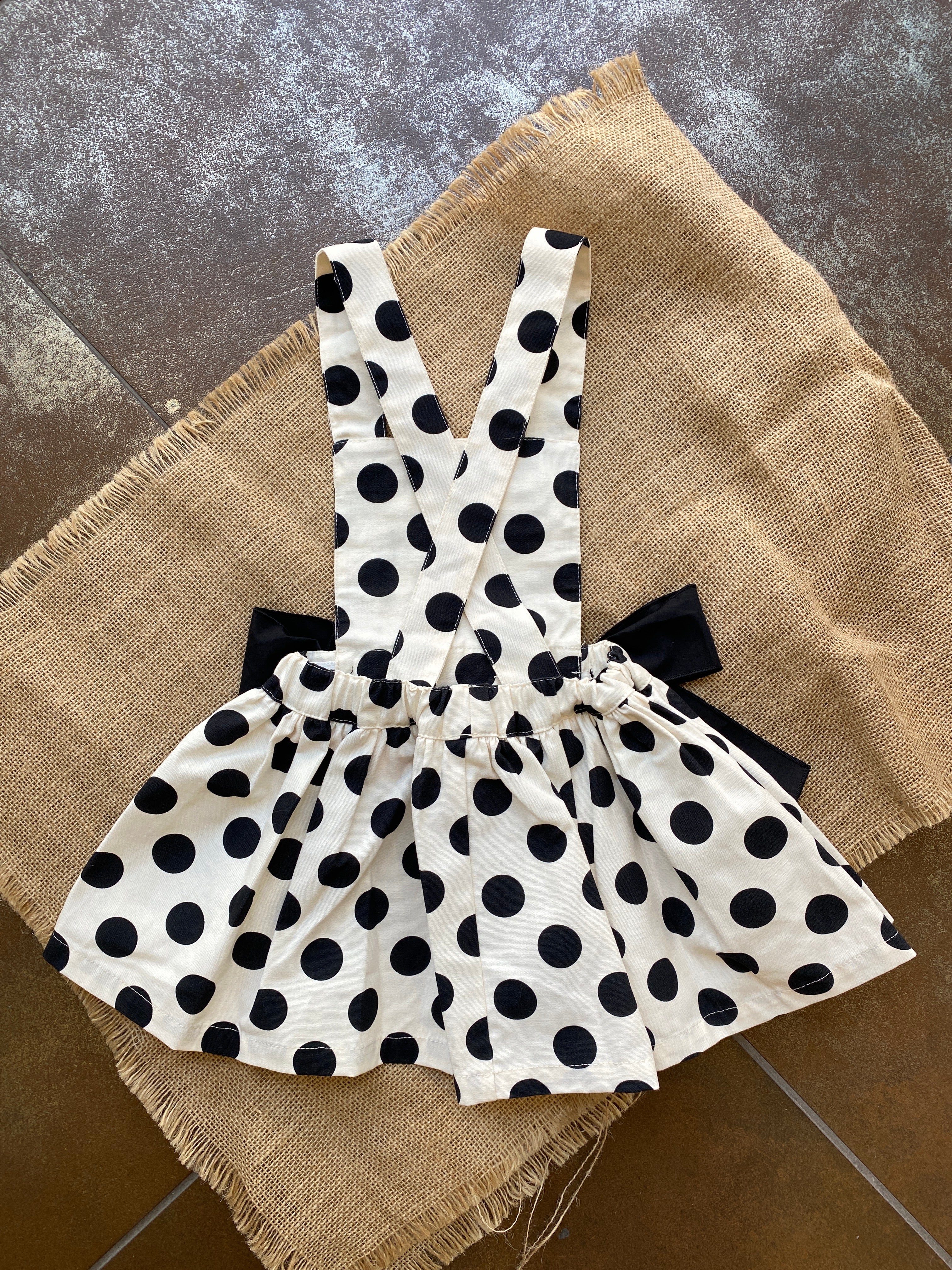Rock-Latzhose mit Poise-Muster (weiße Basis und schwarze Poise) aus Baumwolle.