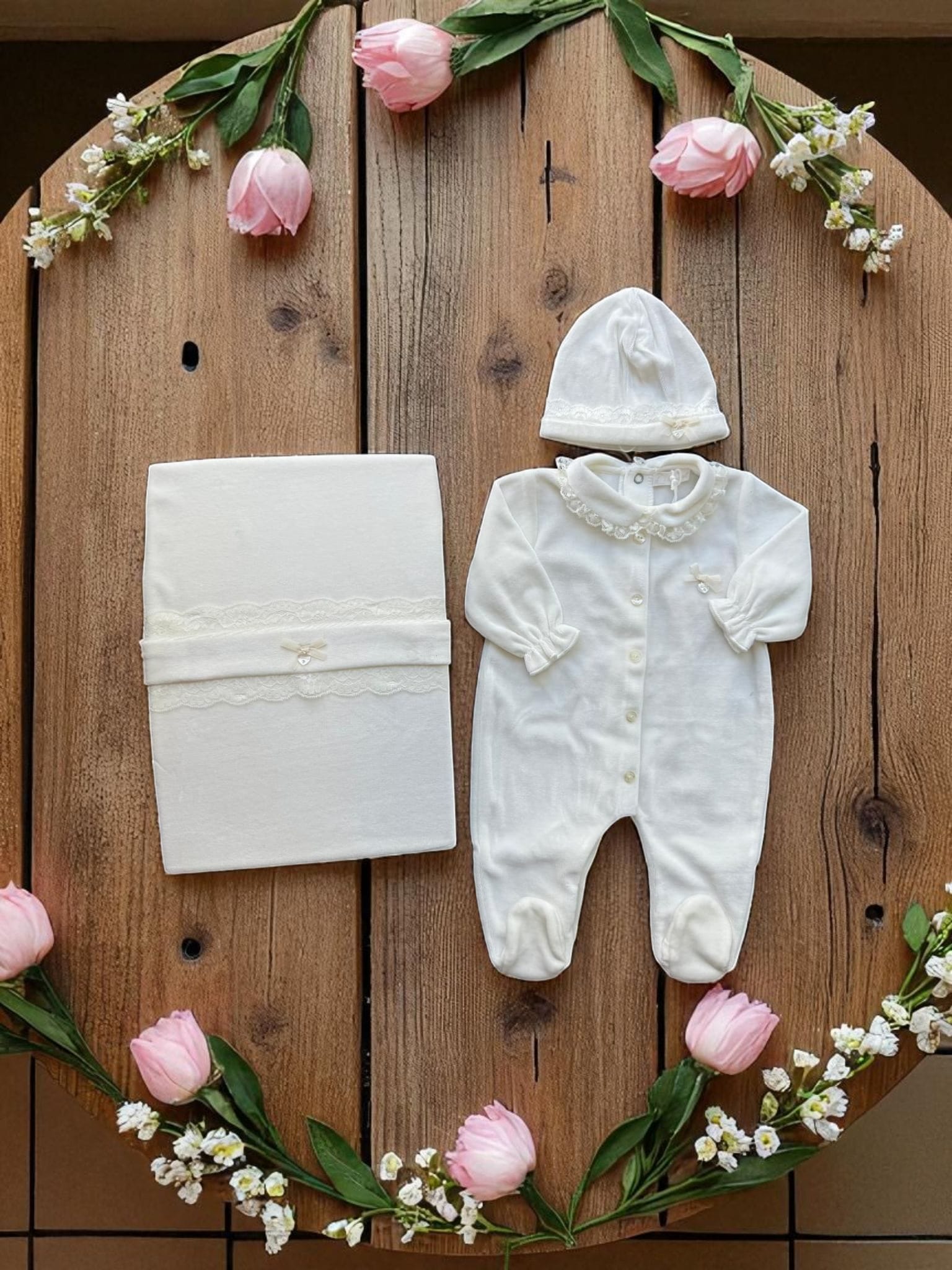 Set in ciniglia 100% Made in Italy ,non può mancare nel suo corredino è composto da 3 pezzi:
