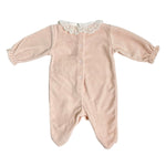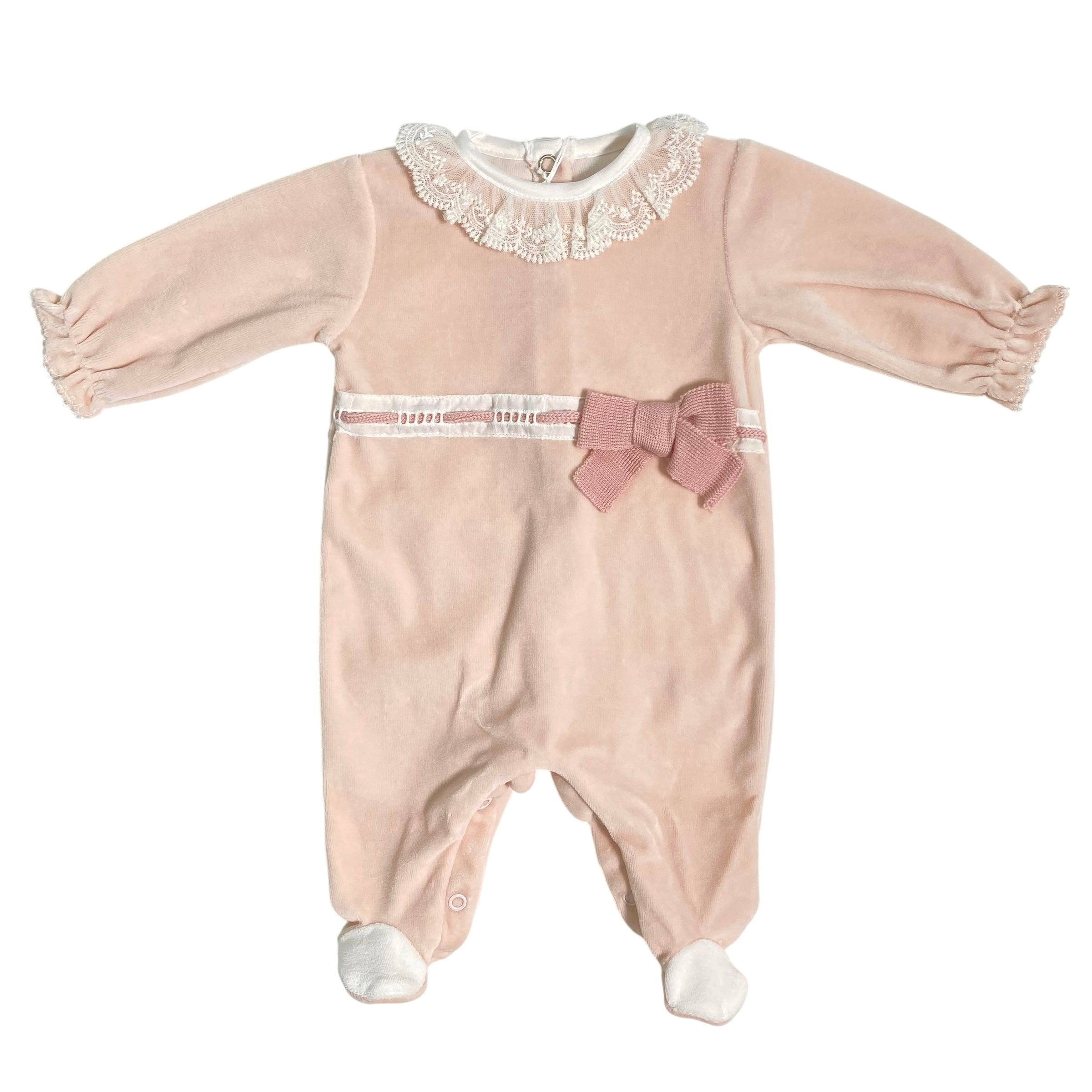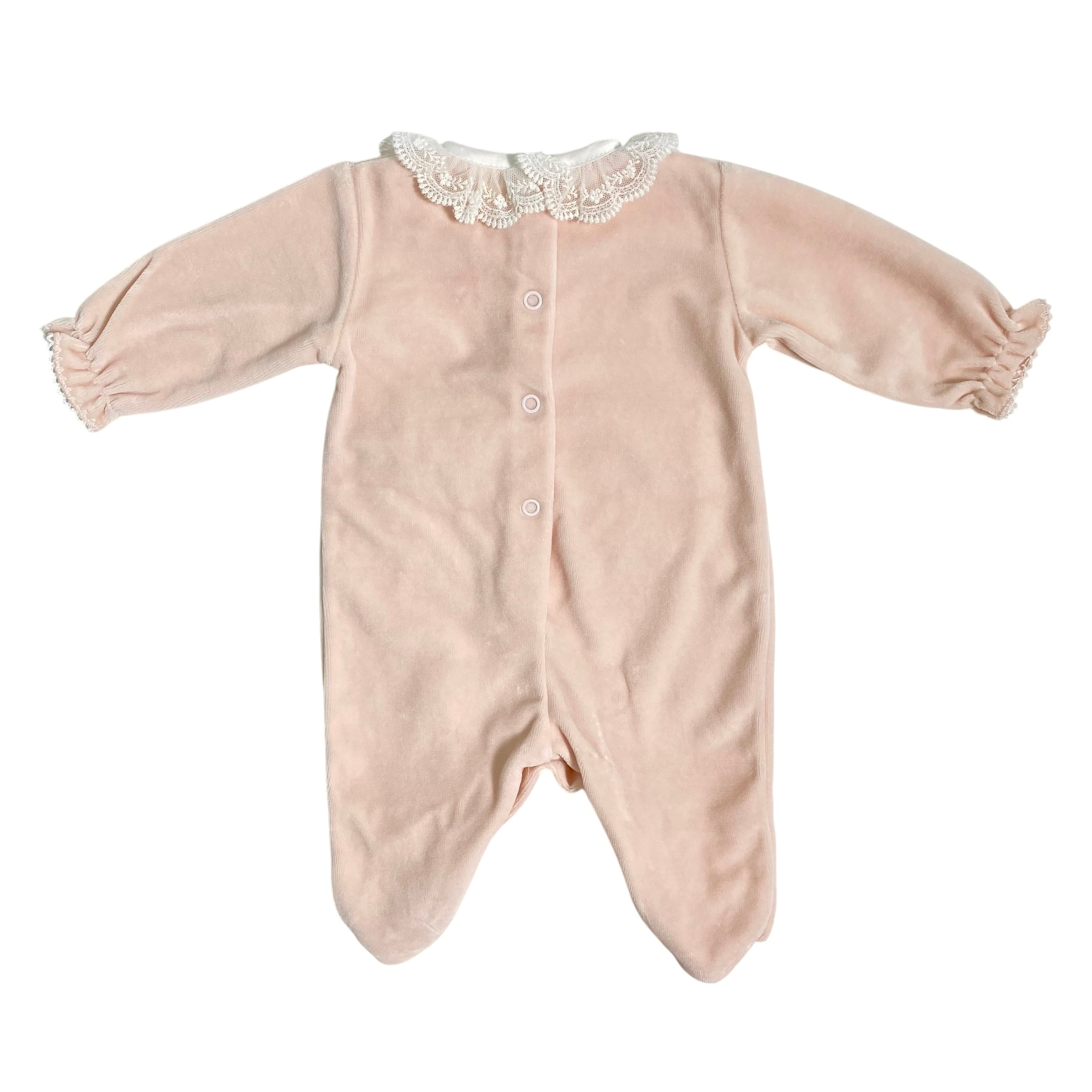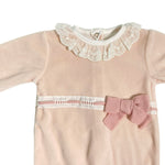 Questa tutina intera in ciniglia, arricchita da collo in rouche in pizzo sul davanti, è ideale per i primi giorni della neonata. Realizzata con materiali morbidi e caldi, assicura comfort e protezione delicata sulla pelle sensibile del bambino. Un capo elegante e funzionale, perfetto per completare il corredino essenziale.