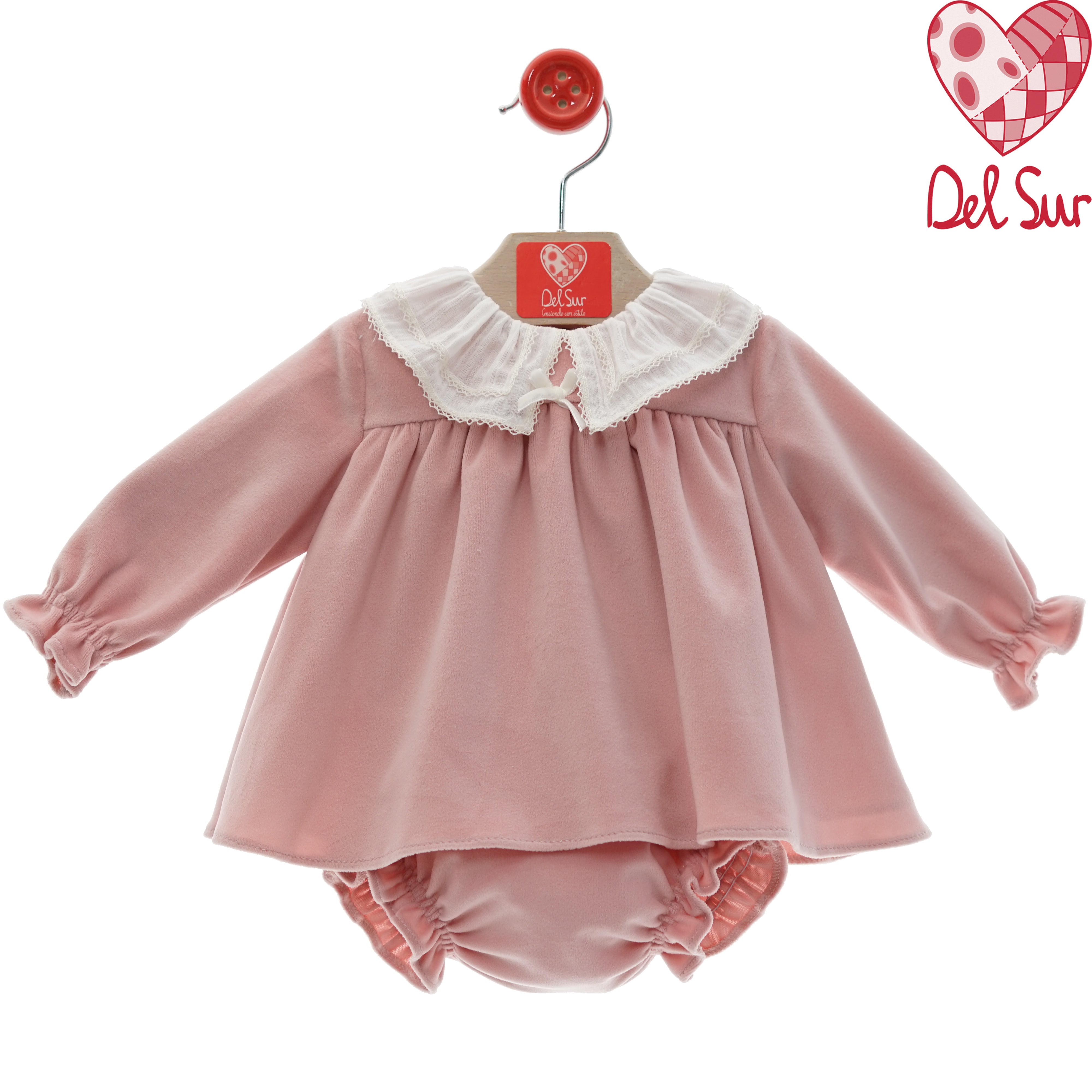 Questo elegante abito con culotte in velluto è perfetto per la neonata moderna. Il morbido velluto assicura comfort e calore, mentre il collo con ruches in cotone aggiunge un tocco raffinato e di classe. Un capo alla moda che unisce praticità e stile per occasioni speciali o momenti quotidiani di grande charme.