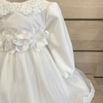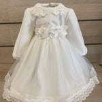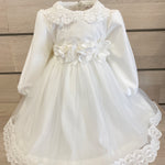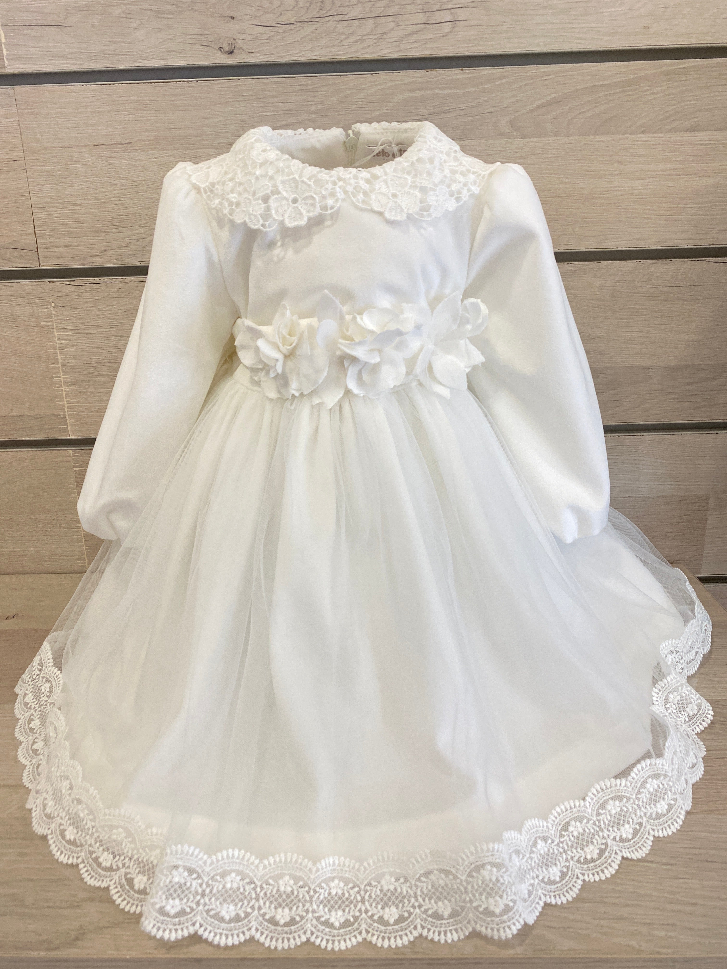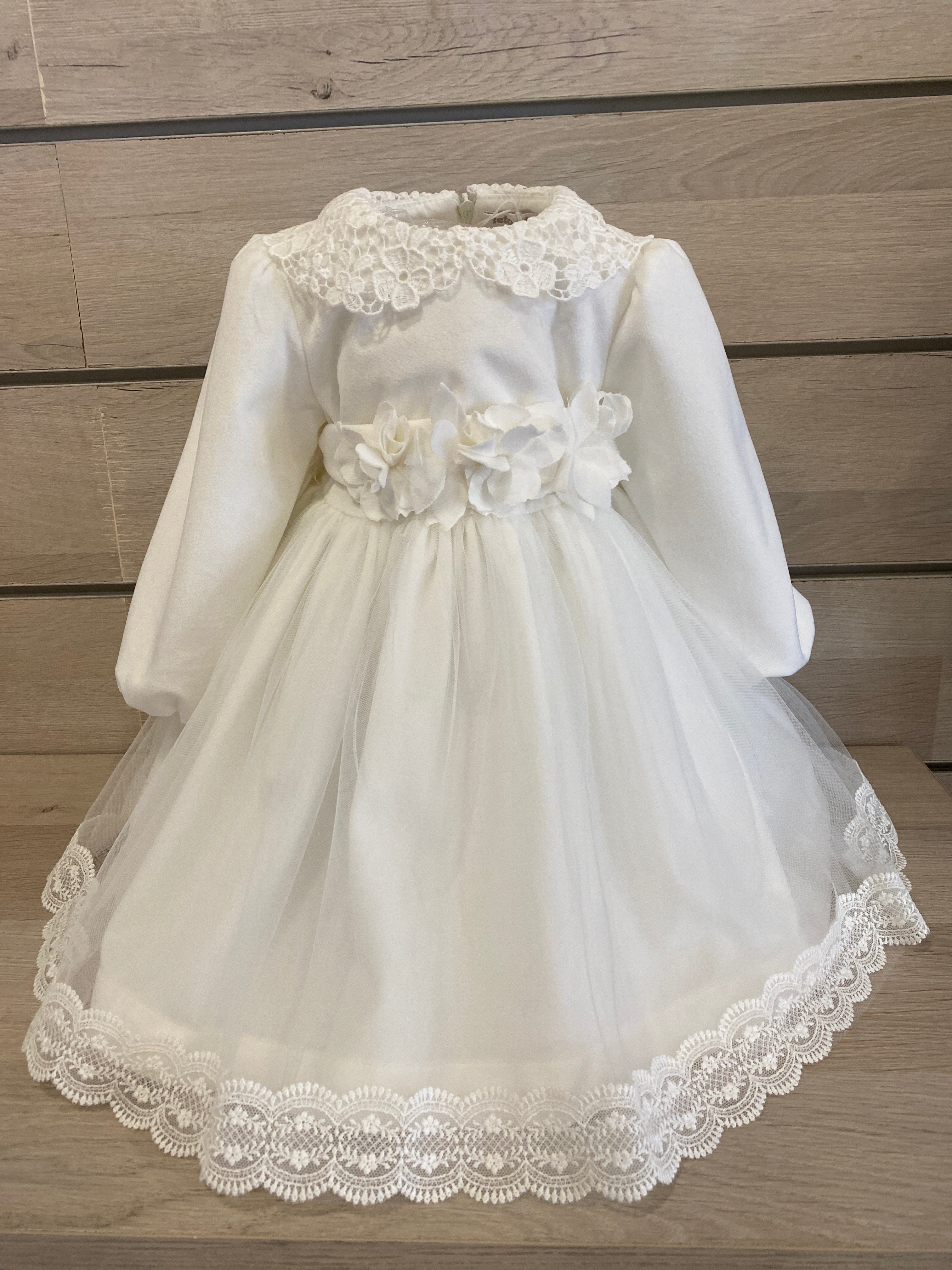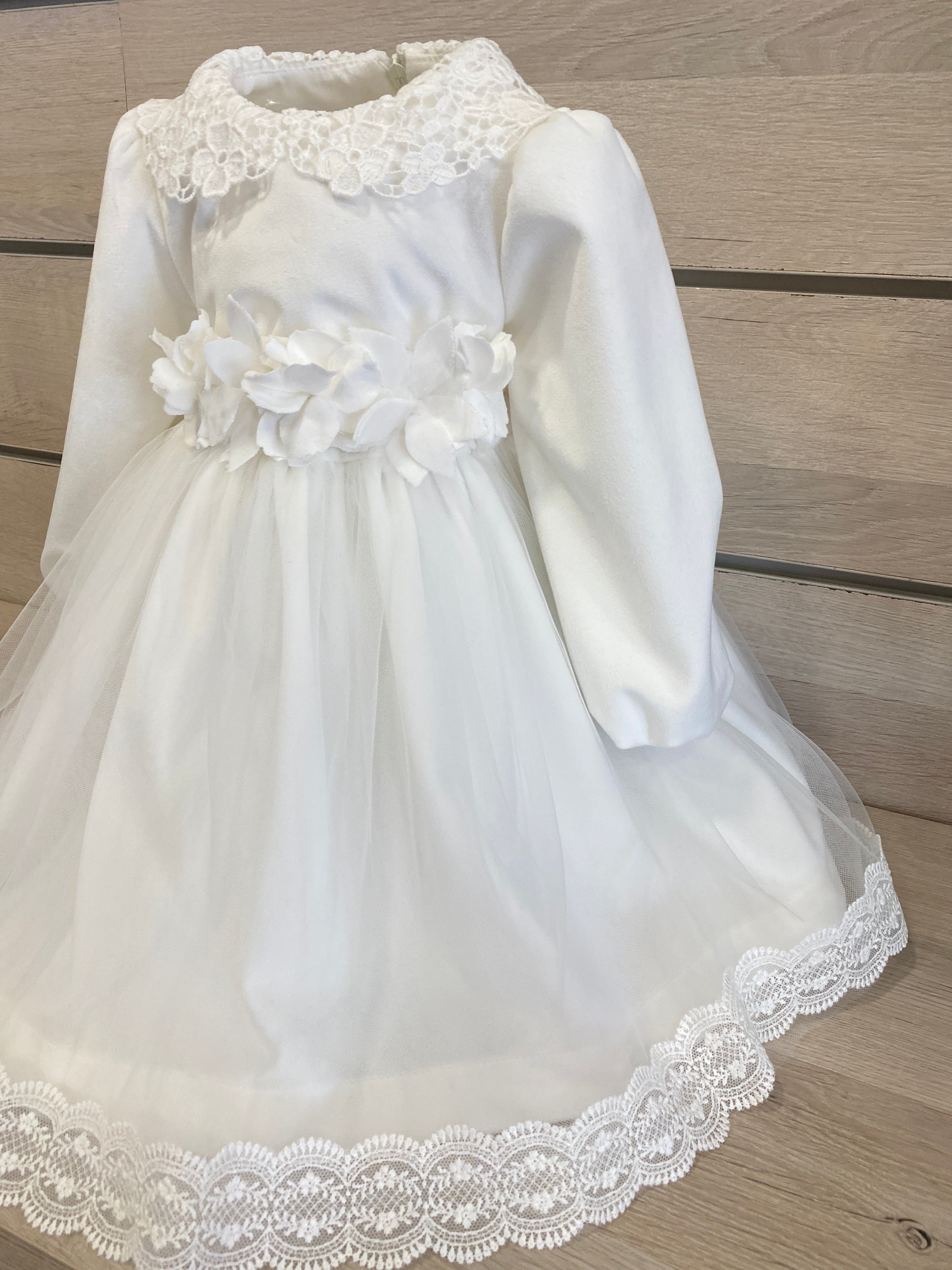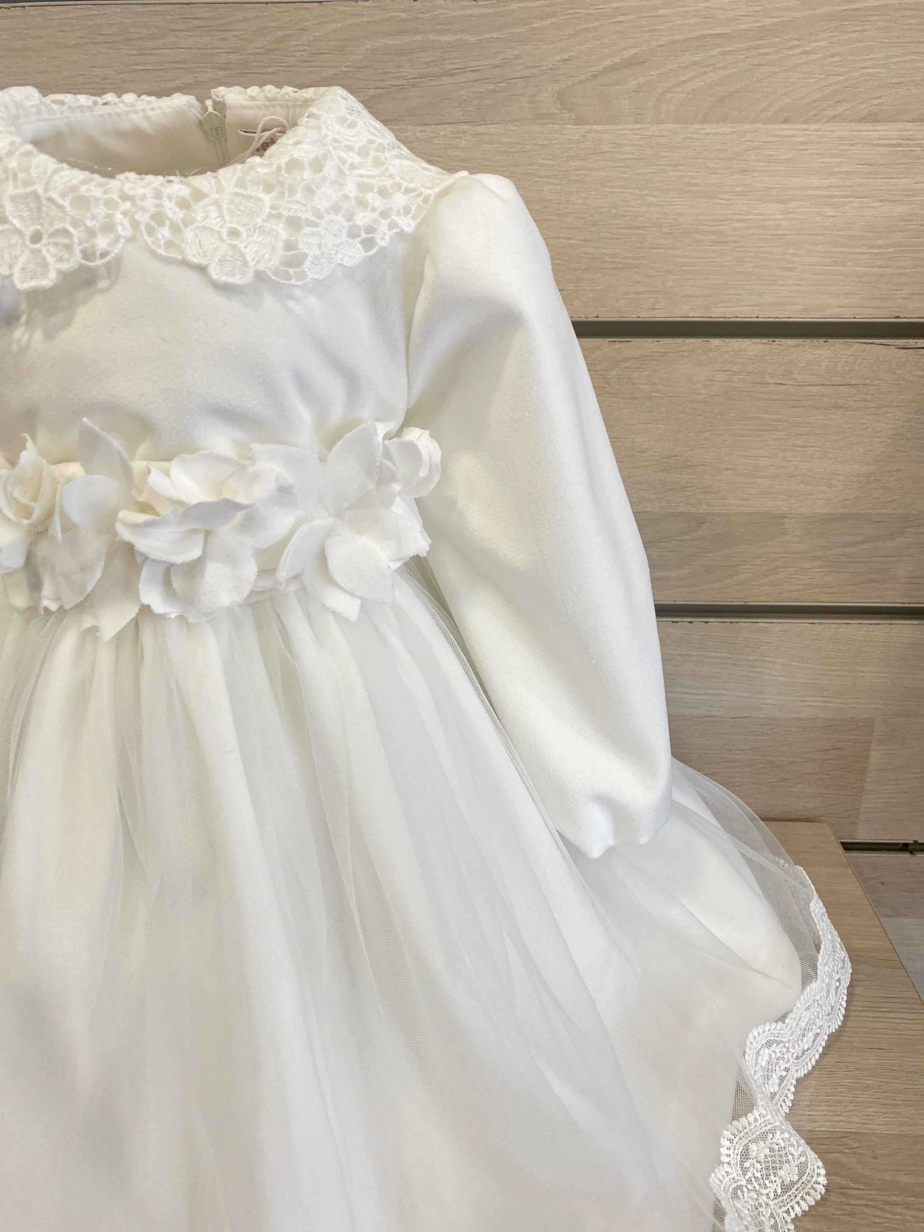Questo abito elegante battesimale per neonata combina velluto pregiato e un raffinato strato di tulle e pizzo, garantendo un look delicato e sofisticato. La fascia in vita con dettagli floreali aggiunge un tocco di charme, mentre la chiusura posteriore con zip invisibile assicura una vestibilità comoda e pulita. Perfetto per un’occasione speciale, offre comfort e stile senza compromessi.