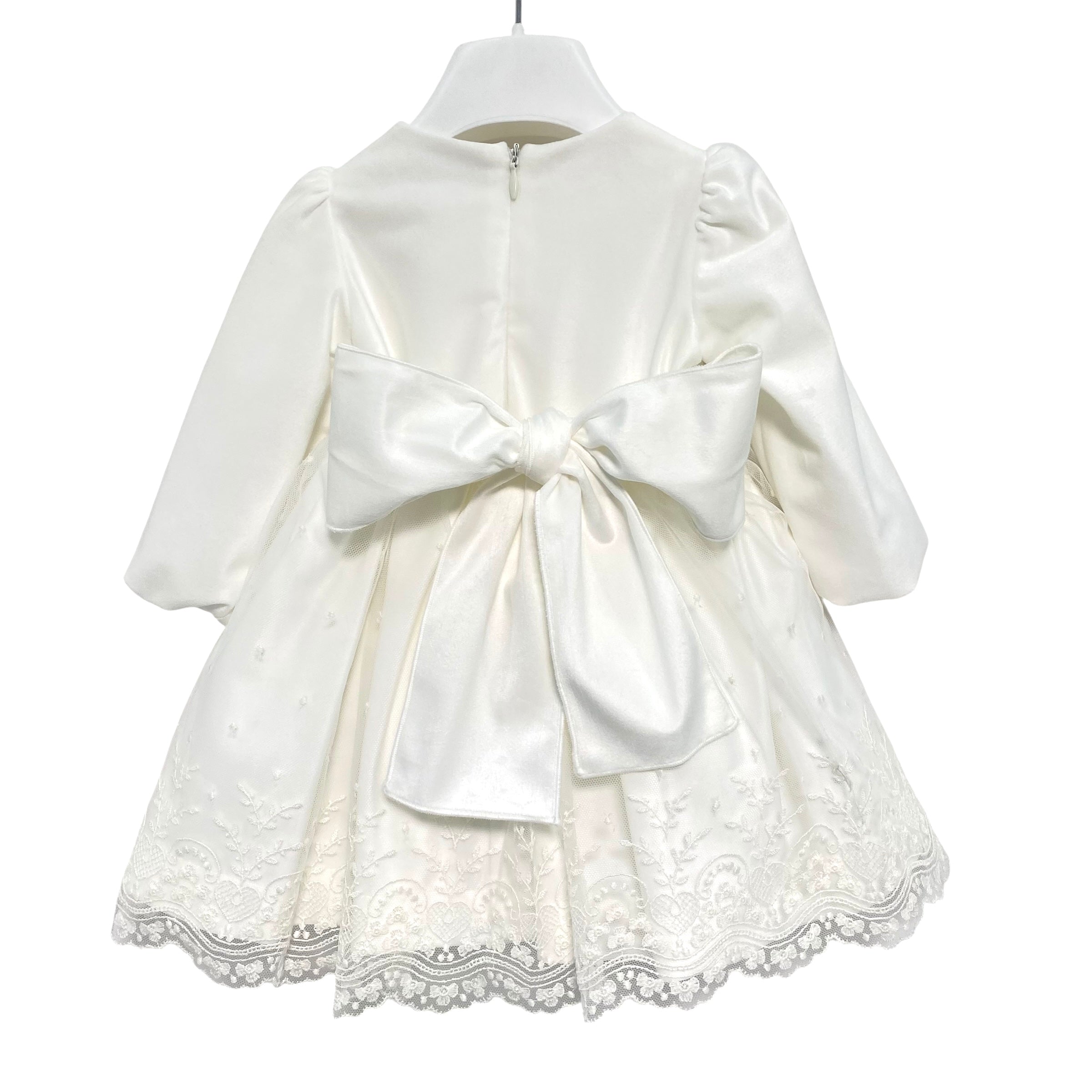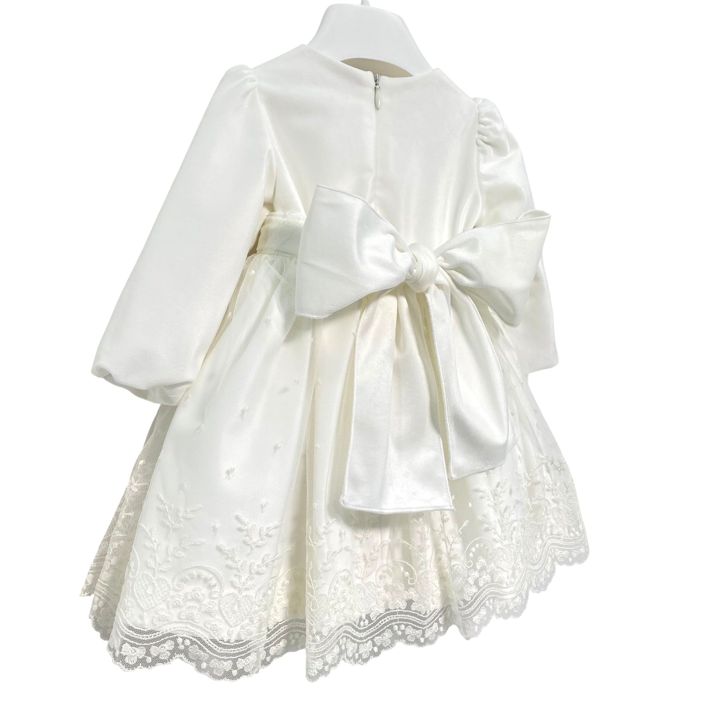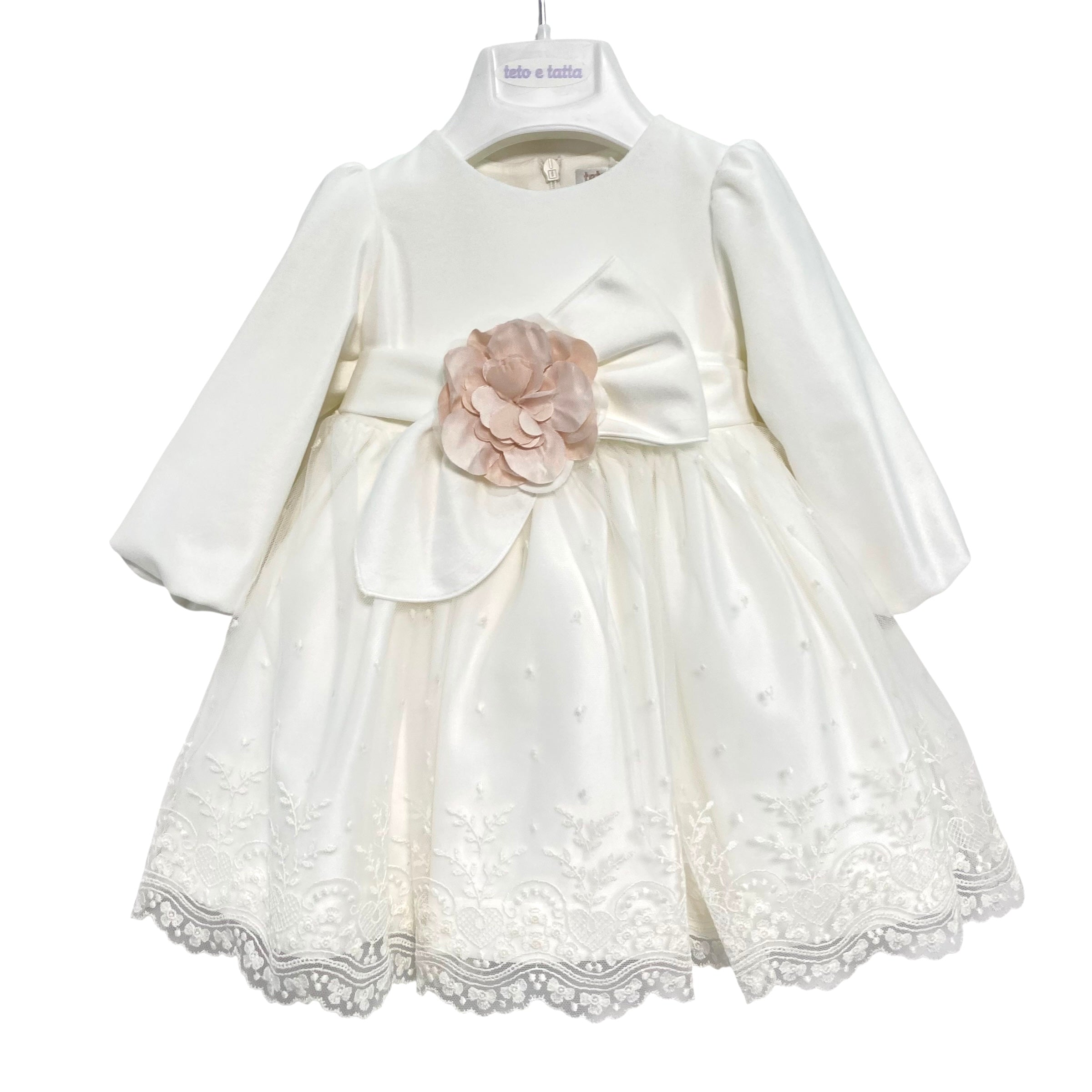 Questo abito elegante battesimale per neonata combina velluto pregiato e un raffinato strato di pizzo, garantendo un look delicato e sofisticato. La fascia in vita con dettagli floreali aggiunge un tocco di charme, mentre la chiusura posteriore con zip invisibile assicura una vestibilità comoda e pulita. Perfetto per un’occasione speciale, offre comfort e stile senza compromessi.
