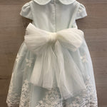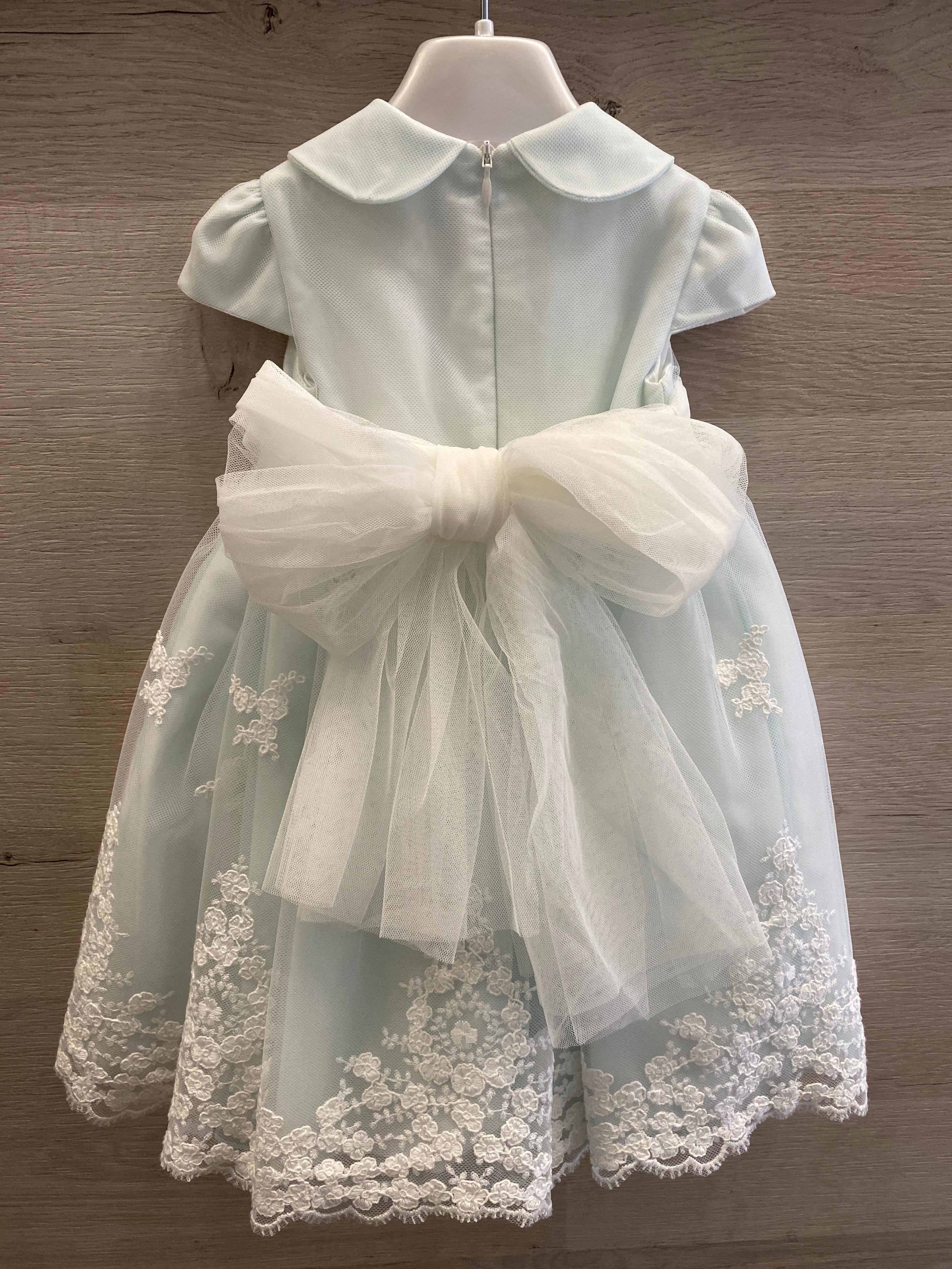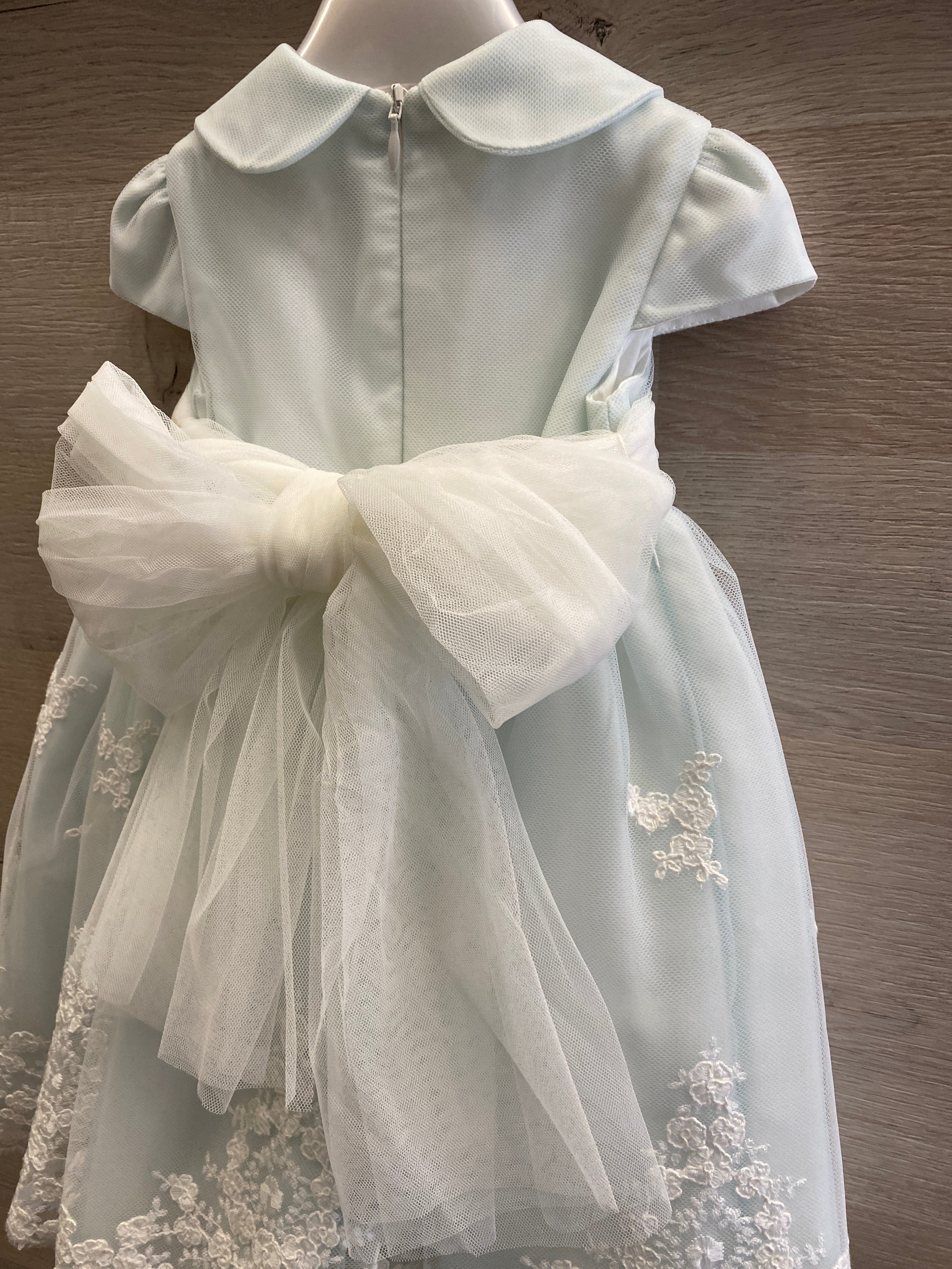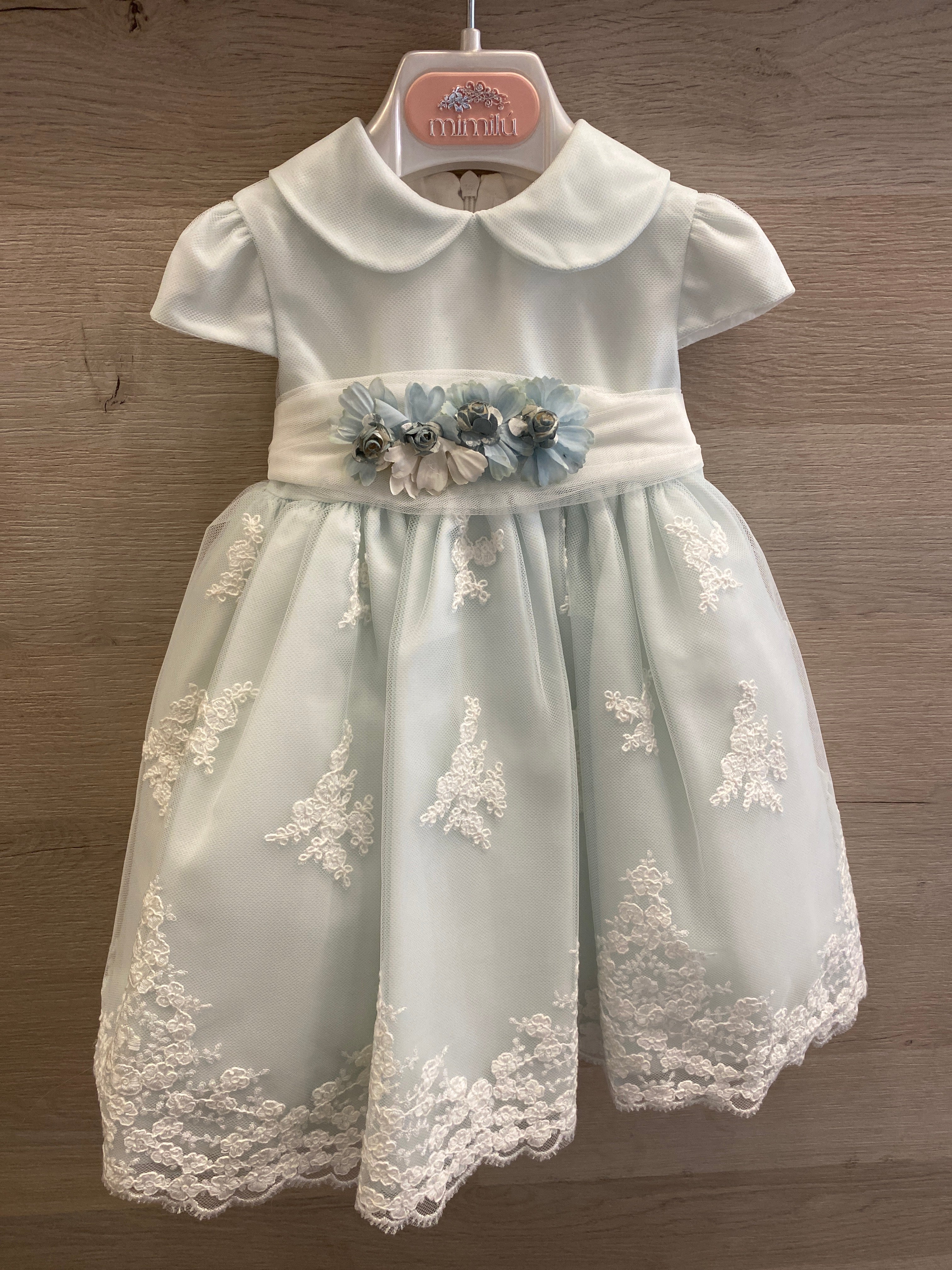 Elegant ceremony dress with smooth bodice and wide skirt in embroidered tulle.
