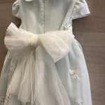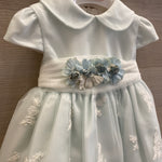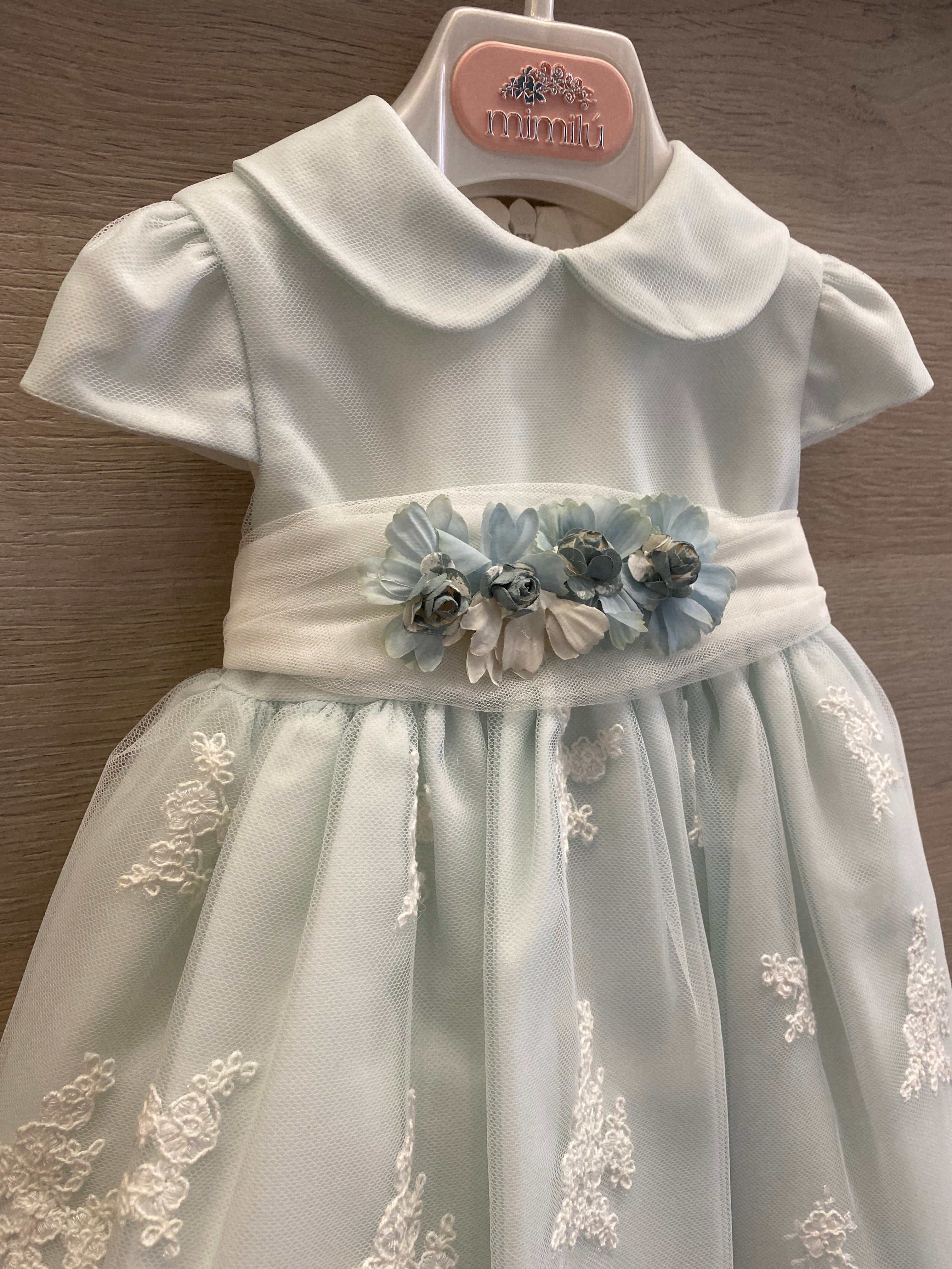 Cream tulle band at the waist, with flower brooch application, which closes at the back with a bow.