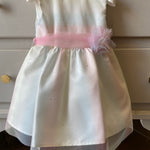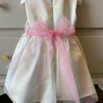 Wear a pink waistband and a beautiful bow on the back to close it. a flower on the band with the same pattern as the dress.