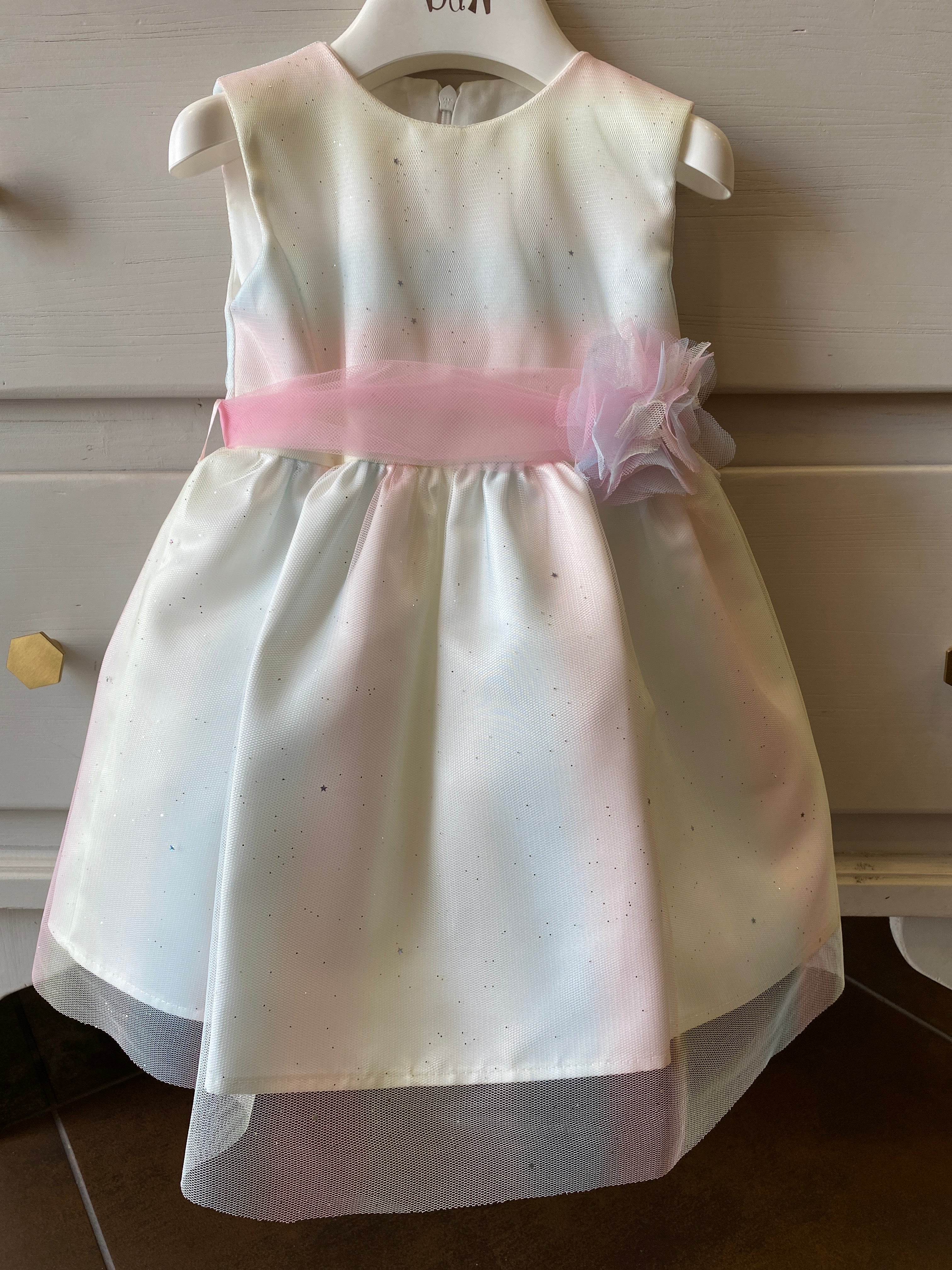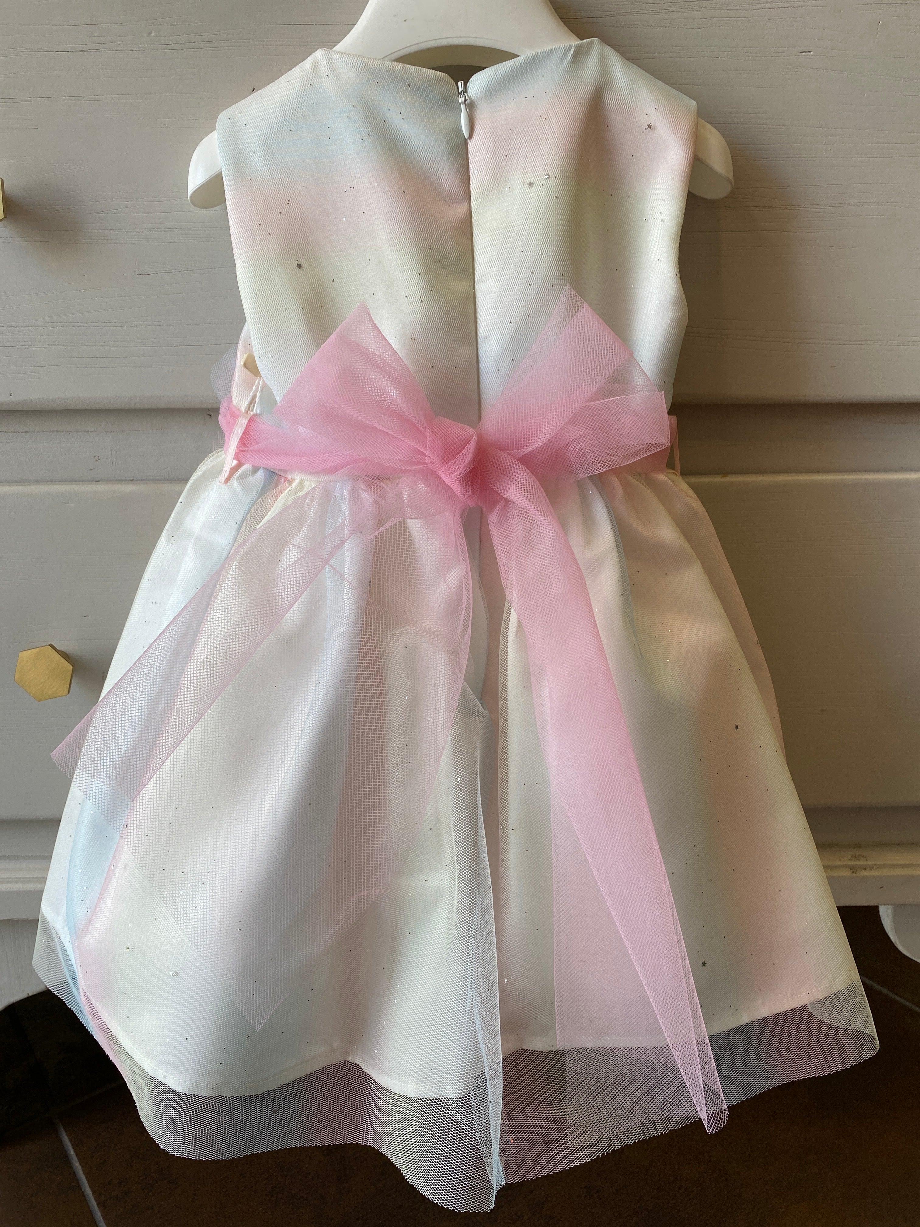 The dress is covered with pastel rainbow tulle (light blue, pink, yellow and green) and embellished even more with tiny silver stars.