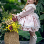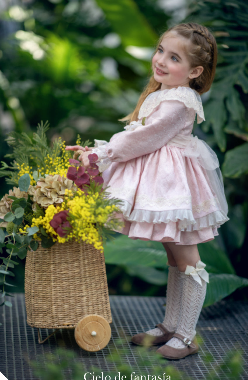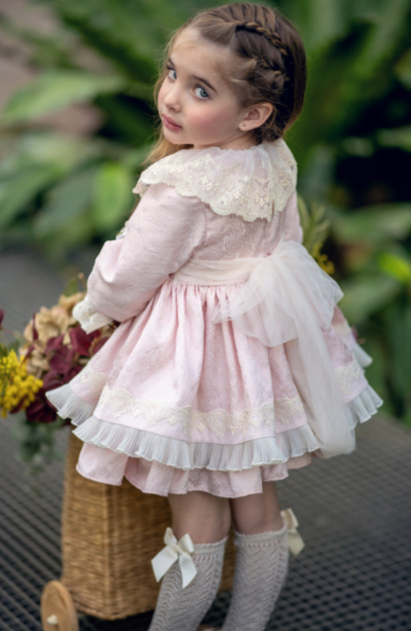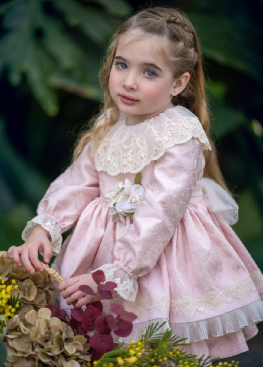 Questo raffinato abito da neonata unisce un tessuto damascato di alta qualità con dettagli in pizzo delicato, offrendo un look sofisticato e confortevole. Il collo con volant aggiunge un tocco di eleganza, mentre la spilla floreale applicata sul davanti impreziosisce il capo, rendendolo perfetto per occasioni speciali e feste importanti. Ideale per chi cerca uno stile unico e curato nei minimi dettagli.