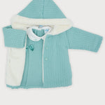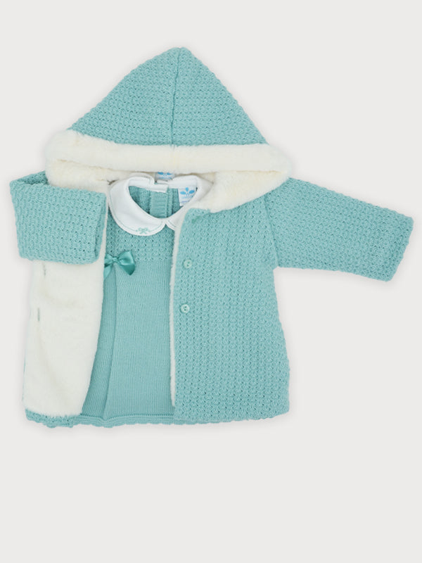 Questo elegante abito manica lunga in tessuto anallergico acrilico assicura il massimo comfort e delicatezza sulla pelle sensibile della neonata. Il colletto bianco tondo in piquet ricamato aggiunge un tocco raffinato e tradizionale, perfetto per occasioni speciali. Il cappottino abbinato con cappuccio e pelliccia interna completa l’insieme, offrendo calore e stile coordinato. Una scelta ideale per vestire con eleganza e cura le più piccole.
