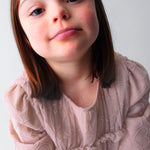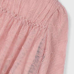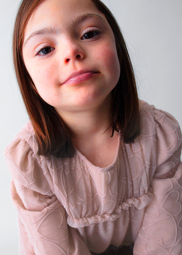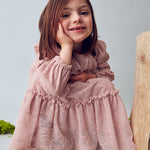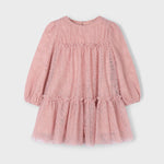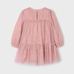 Vestito manica lunga per bambina. Piccola apertura sulla schiena con chiusura con bottone per facilitare la vestibilità del capo. Confezione in tulle leggero e vaporoso. Modello con riccio.