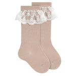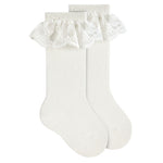 Queste calze lunghe per neonata, realizzate in caldo cotone, garantiscono comfort e calore delicato sulla pelle sensibile dei più piccoli. Il bordo in pizzo aggiunge un tocco di eleganza senza rinunciare alla praticità quotidiana, rendendole ideali per completare outfit raffinati con funzionalità. Perfette per mantenere le gambe della tua bambina avvolte in morbidezza durante le stagioni più fresche.
