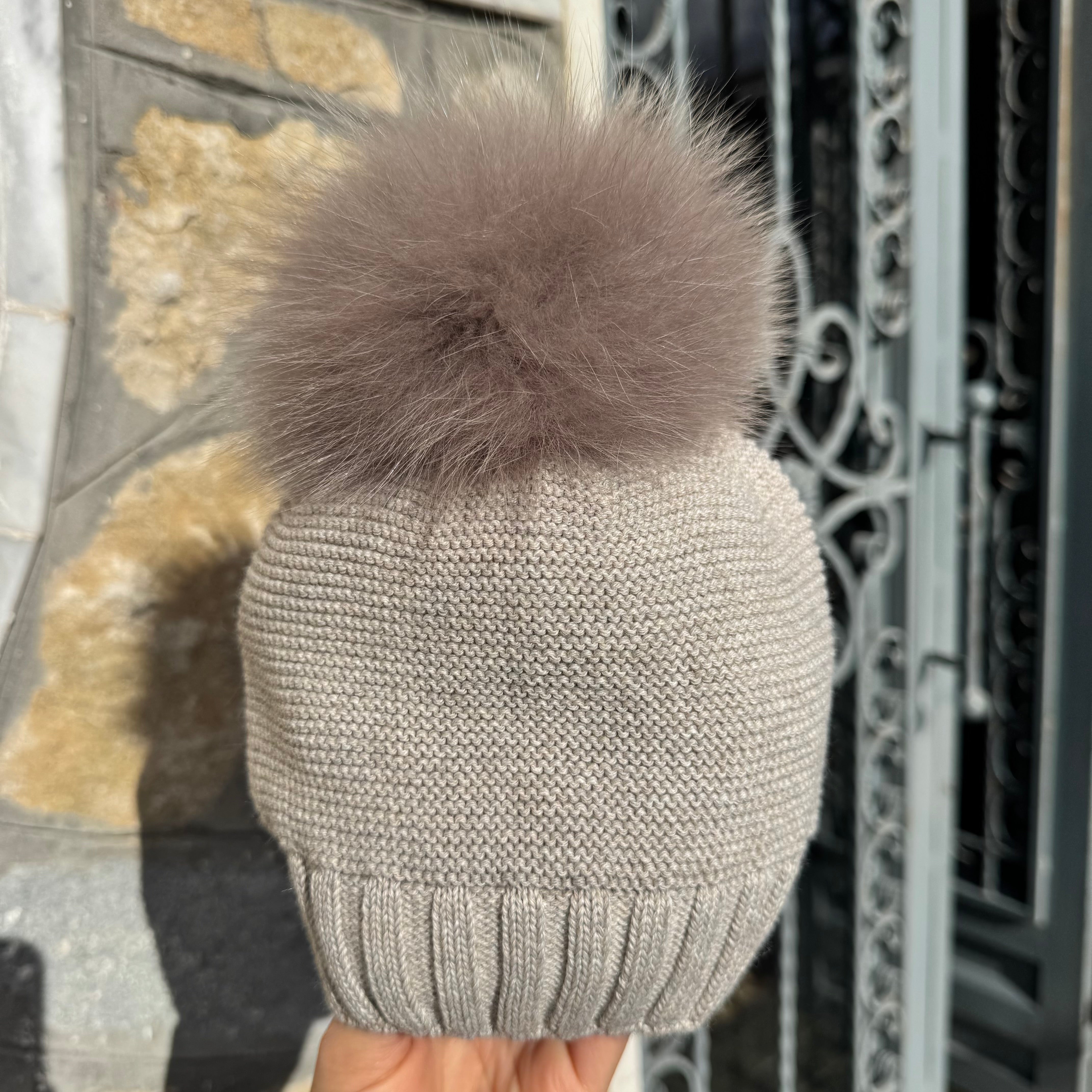 Cappello in misto lana liscio con pom pon in pelliccia di volpe originale.