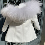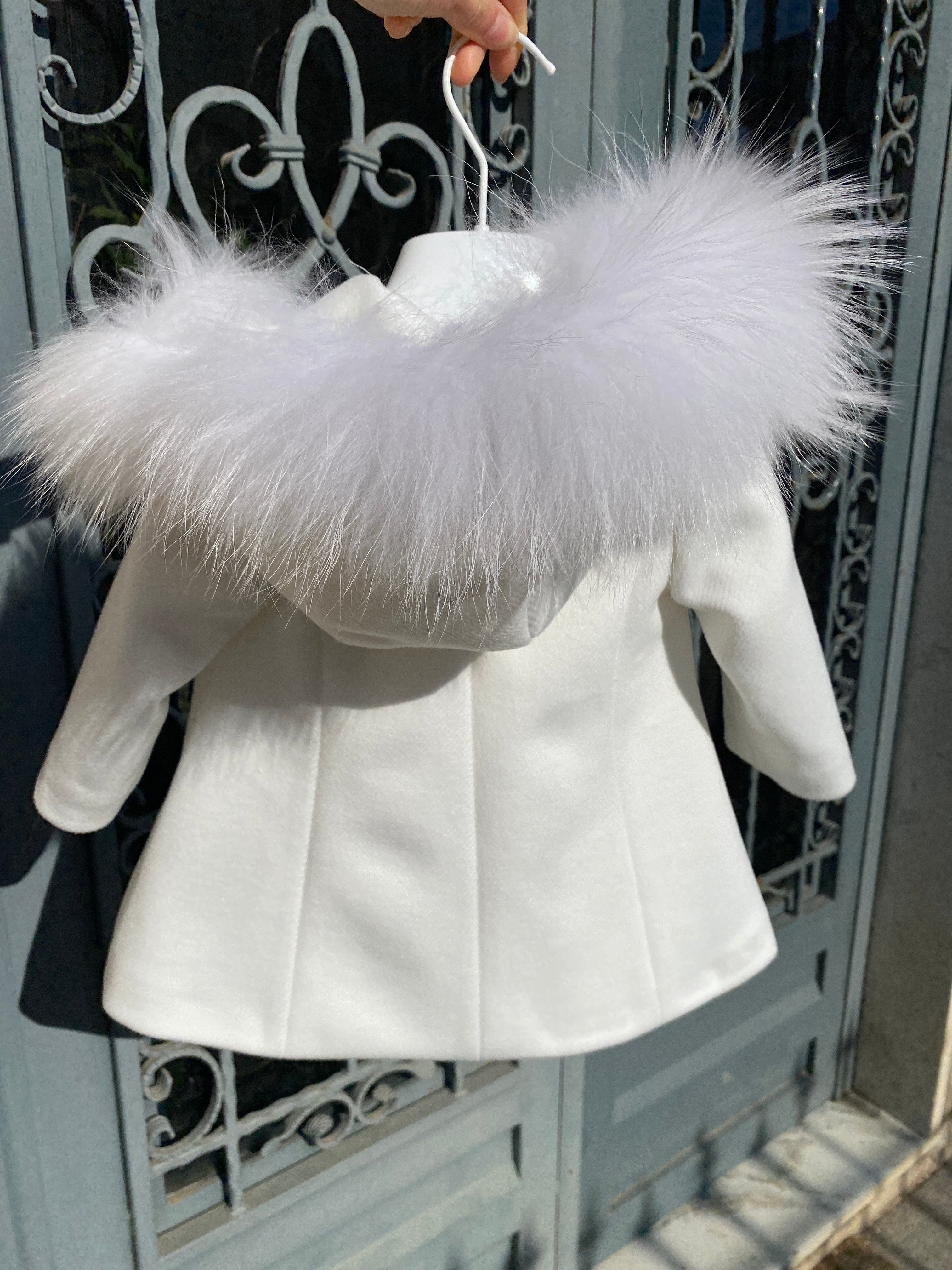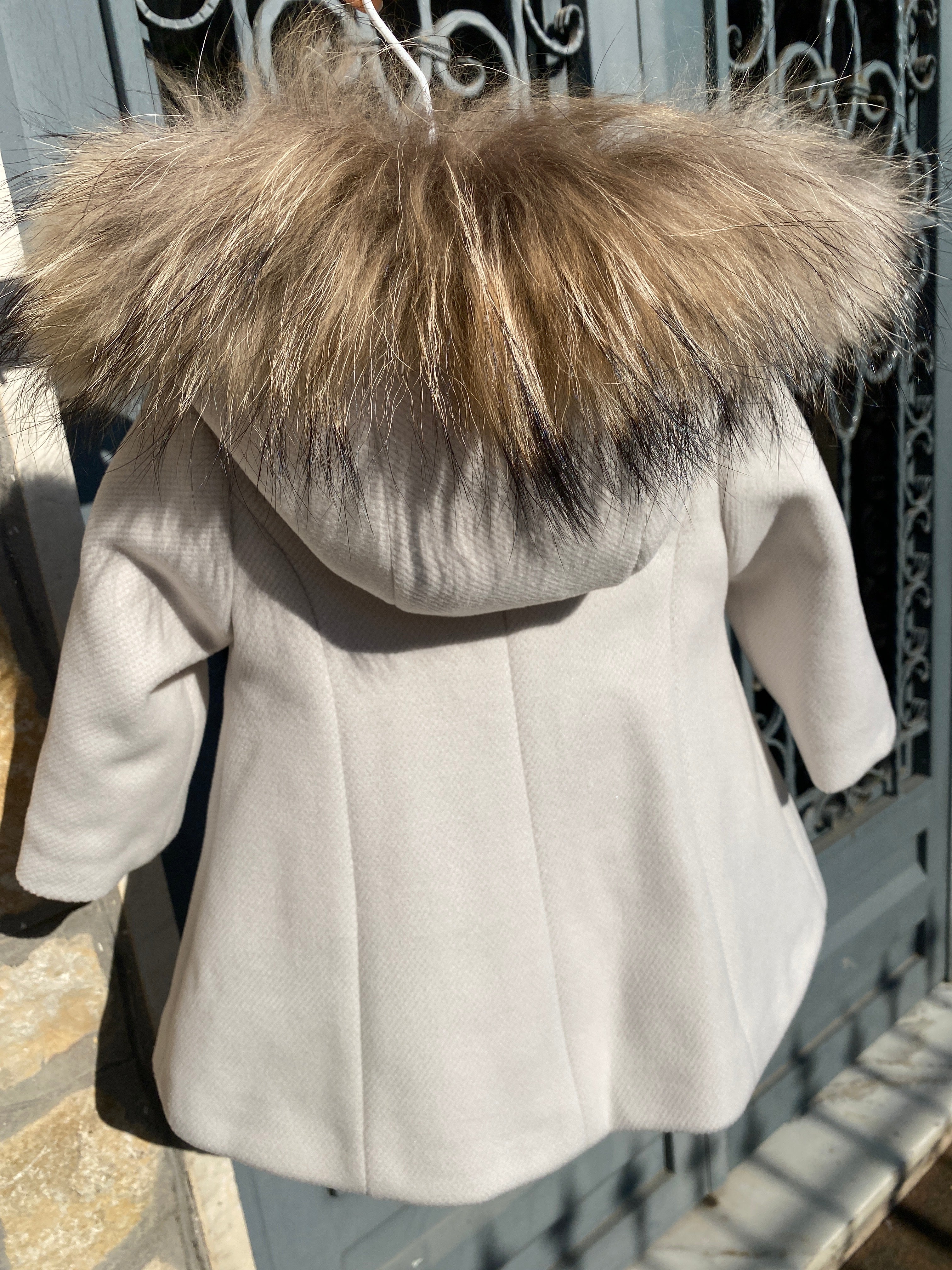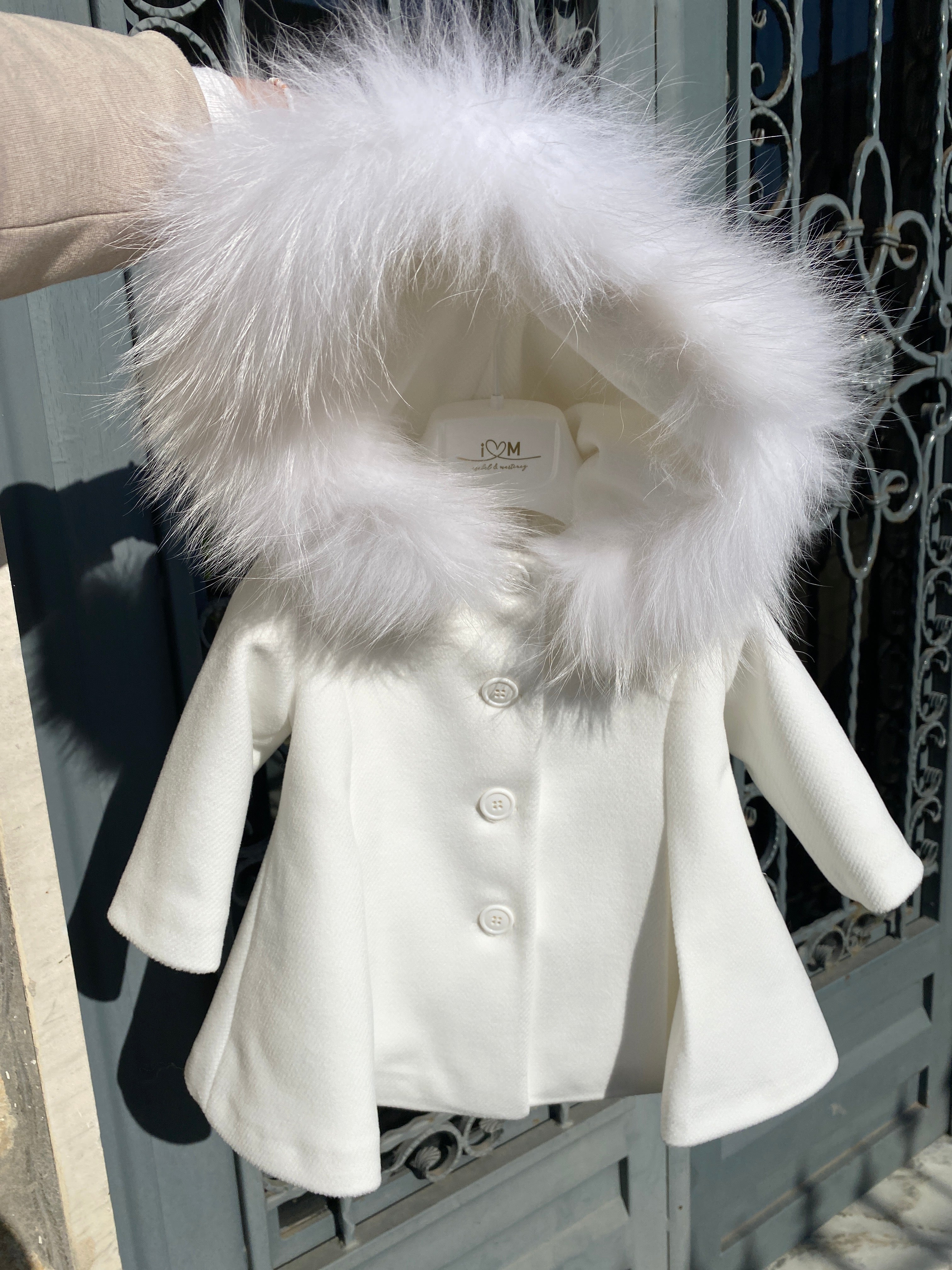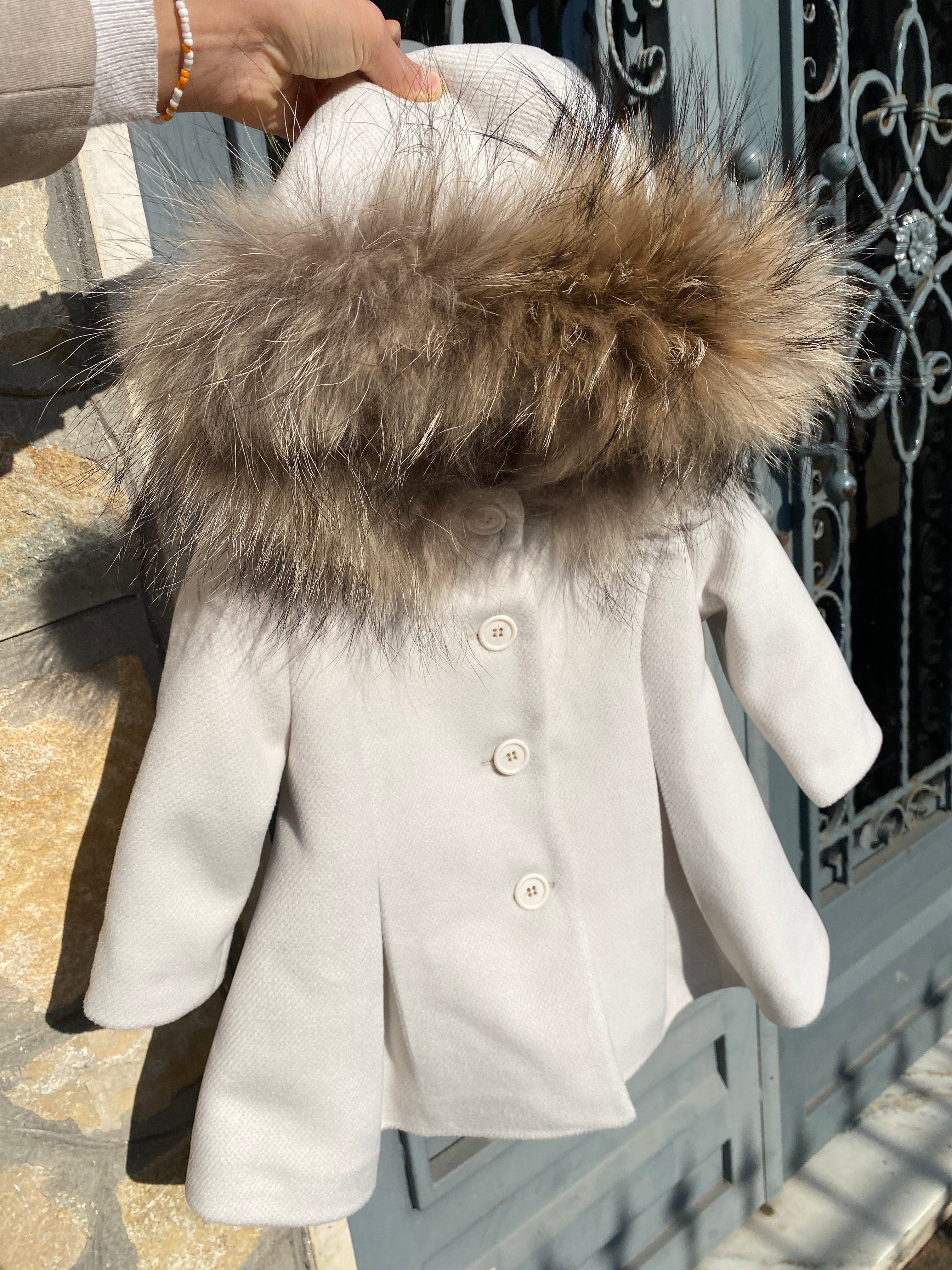 Questo elegante cappotto svasato in panno rappresenta la scelta ideale per completare l'outfit invernale della vostra neonata con stile raffinato. Il design svasato garantisce libertà di movimento, mentre il cappuccio foderato in morbida pelliccia offre protezione e un tocco di lusso. Realizzato con materiali di qualità superiore, il cappotto combina praticità e eleganza, perfetto per occasioni speciali e uso quotidiano. Un capo essenziale che eleva qualsiasi look con sofisticatezza e charme.