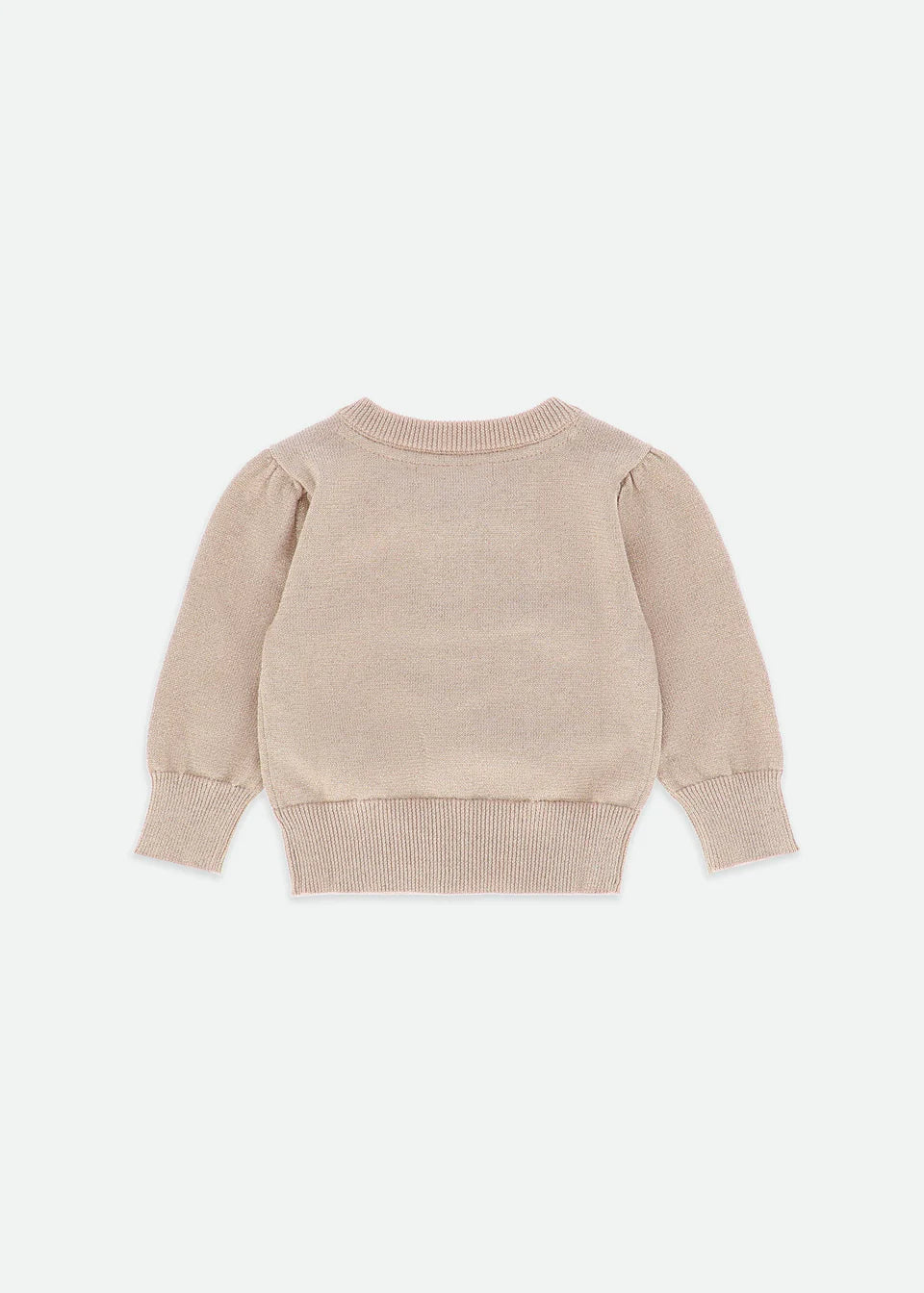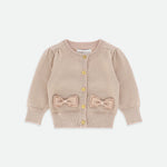 Cardigan in maglia fine in misto cotone argentato con un tocco di brillantezza. Cardigan girocollo con chiusura frontale con bottoni in cristallo argentato. Le delicate arricciature su maniche e spalle lo rendono il capo perfetto da indossare sopra qualsiasi abito. Polsini e orli a coste, rifinito con due dei nostri fiocchi distintivi e borchie dorate a forma di cuore sopra la vita.