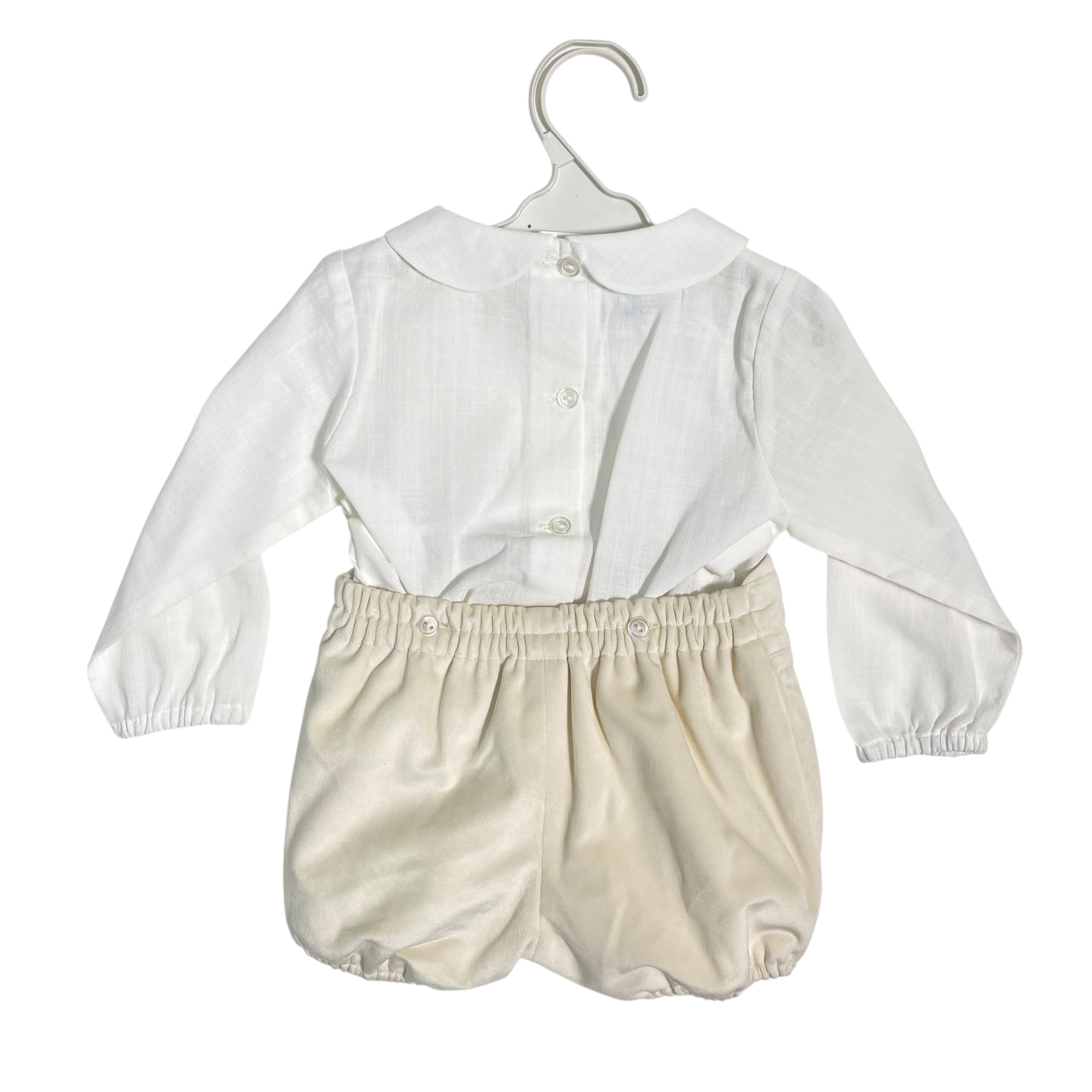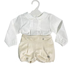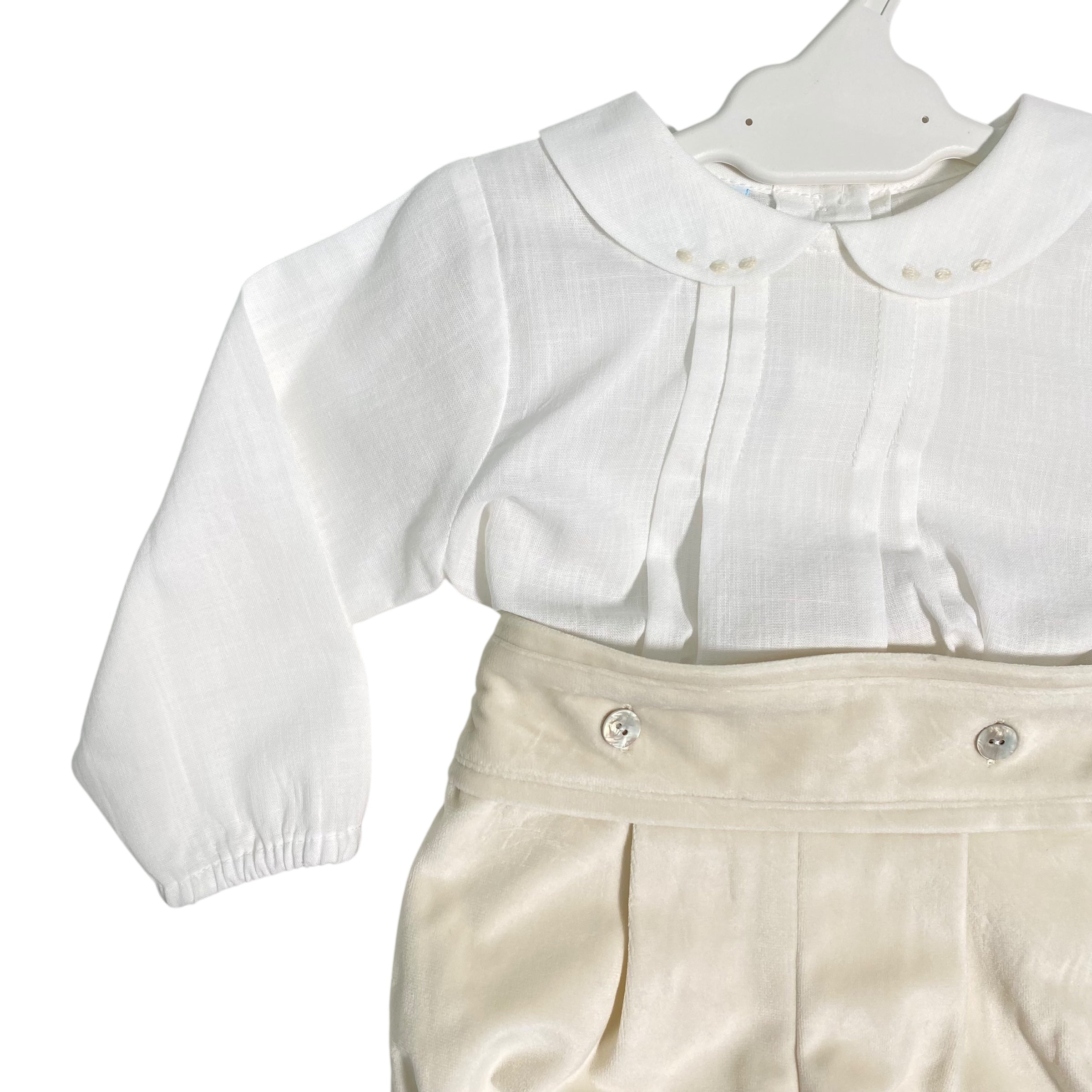 -Camicia manica lunga (panna) in caldo cotone con colletto tondo, elastico ai polsini, pieghe sul davanti con ricamo in tono su tono ,chiusura sul retro con bottoni.