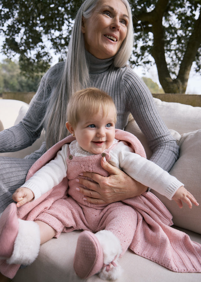 Maglione manica lunga per neonata. Colletto con onde. Chiusura con bottoni a pressione nella parte posteriore.