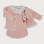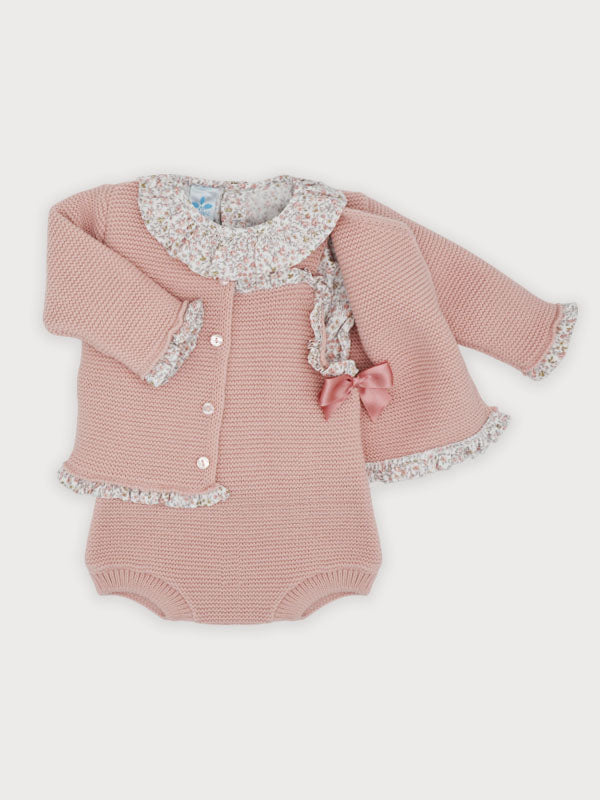 Questo completo invernale da neonato è composto da tre pezzi: una salopette calda e confortevole, un cardigan in acrilico morbido e una camicia elegante con collo volant floreale. Perfetto per mantenere la tua piccola al caldo con stile, combina praticità e tendenze moda in un outfit raffinato e adatto alle occasioni speciali.