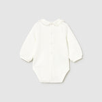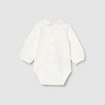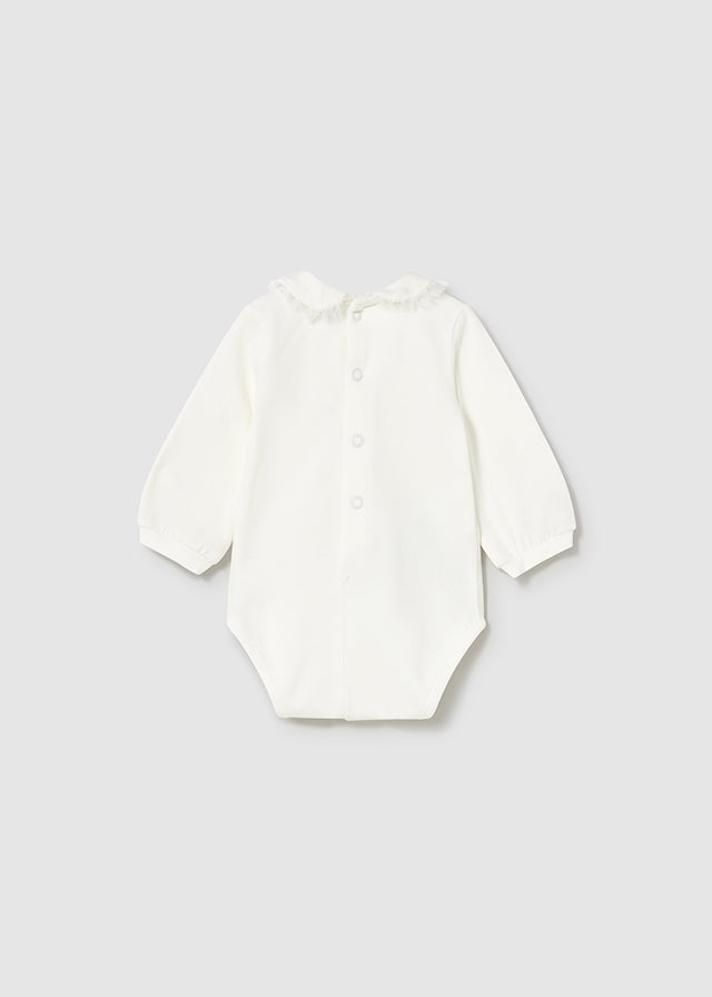 Body manica lunga per neonata con polsini elasticizzati. Colletto bebè. Chiusura con bottoni a pressione nella parte posteriore. Chiusura con bottoni a pressione nell'interno cosce per agevolare la vestibilità. Elementi decorativi: volant decorativo.