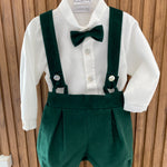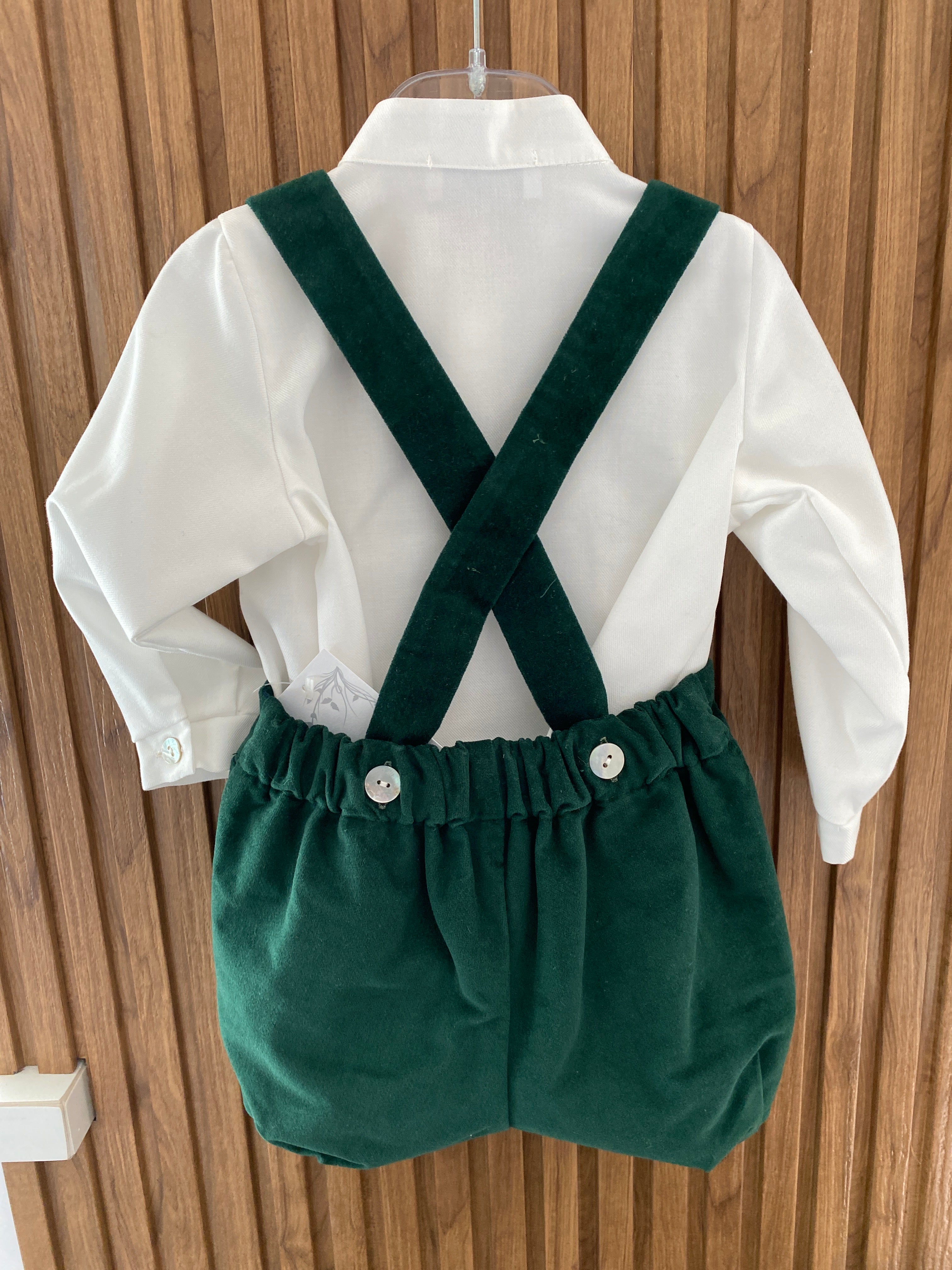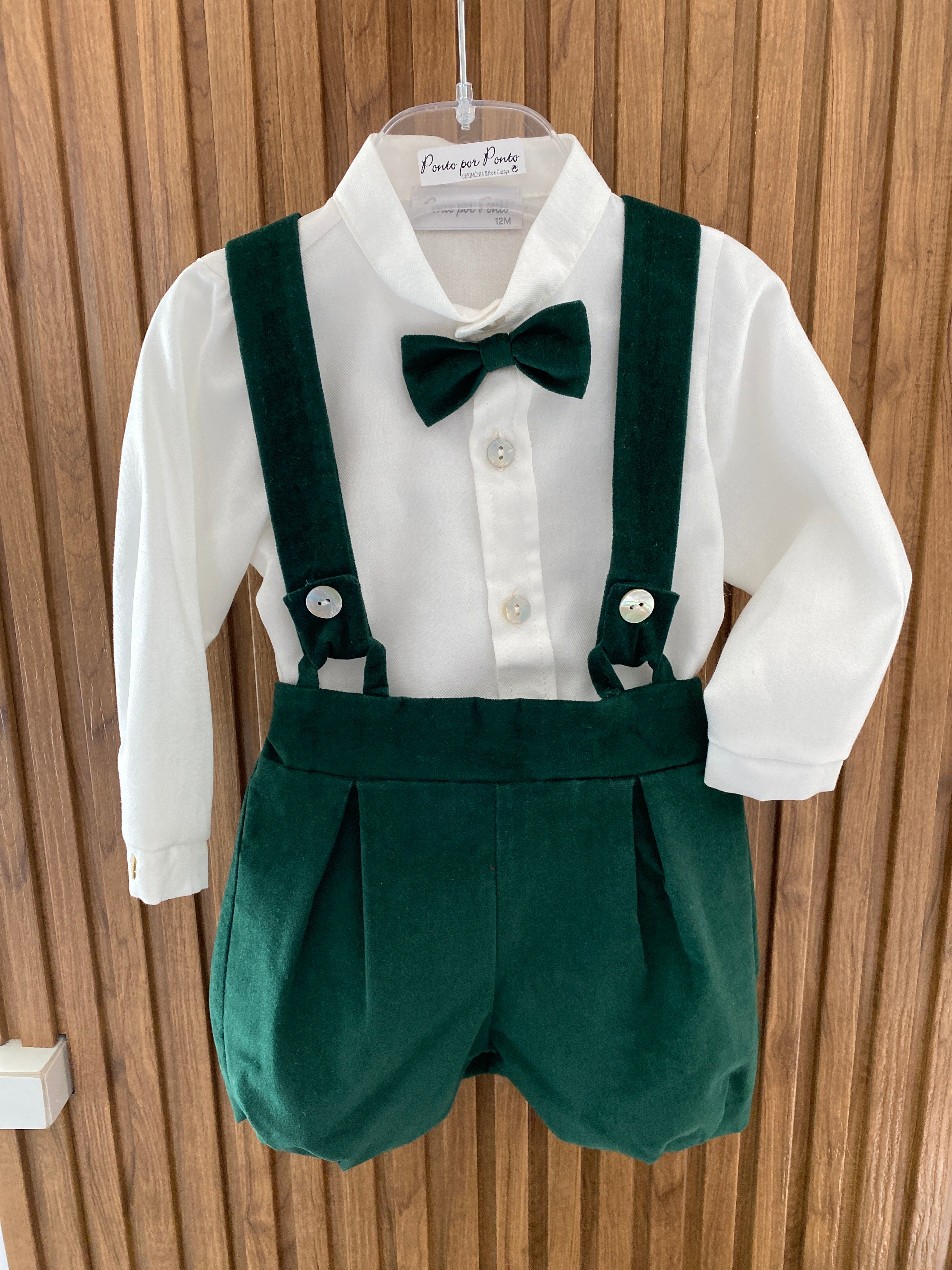 Completo cerimonia maschile elegante, composto da camicia a manica lunga in morbido cotone, bermuda corti in velluto con bretelle, e papillon realizzato nel medesimo tessuto dei bermuda. Elegante e chic per eventi importanti.