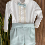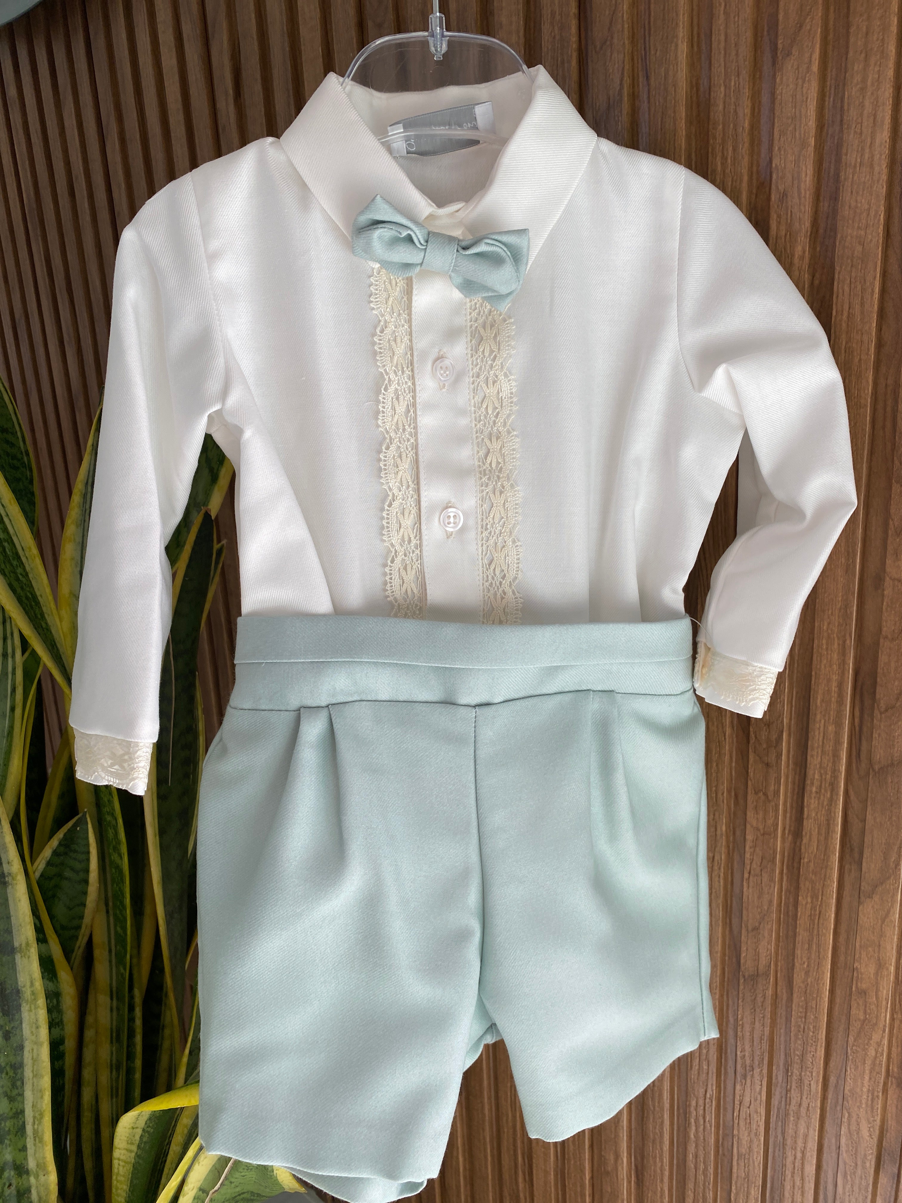 Completo cerimonia maschile elegante, composto da camicia a manica lunga in morbido cotone arricchita da un inserti di pizzo, bermuda corti in tessuto caldo cotone, e papillon realizzato nel medesimo tessuto dei bermuda. Camicia e bermuda sono uniti internamente tramite bottoncini per creare un pagliaccetto dallo stile raffinato.