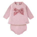 Questo completo elegante in caldo cotone è perfetto per rendere la tua neonata ancora più speciale in ogni occasione. Include una culotte e un maglioncino con fiocco in velluto per un tocco di classe. Ideale per un'occasione speciale o per un outfit quotidiano.