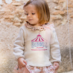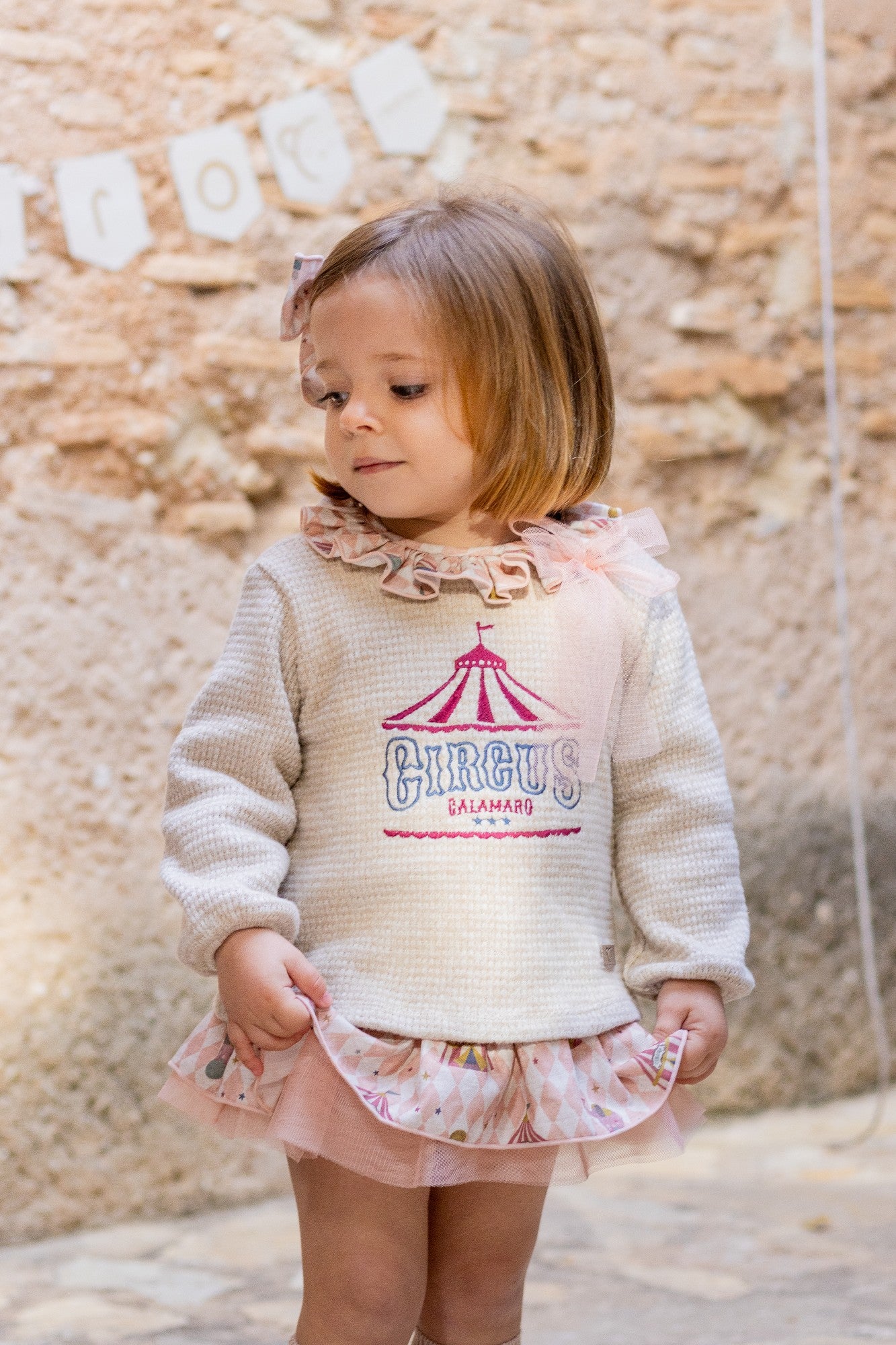 Questo completo per neonata unisce praticità ed eleganza, realizzato in caldo cotone per garantire comfort e calore. La culotte con balze effetto gonnellina aggiunge un tocco di stile raffinato, mentre la maglia presenta un delicato ricamo a tema circo e un collo con rouches, dettagli che rendono il capo alla moda e perfetto per ogni occasione. Ideale per chi cerca un outfit confortevole senza rinunciare a un design curato e sofisticato.