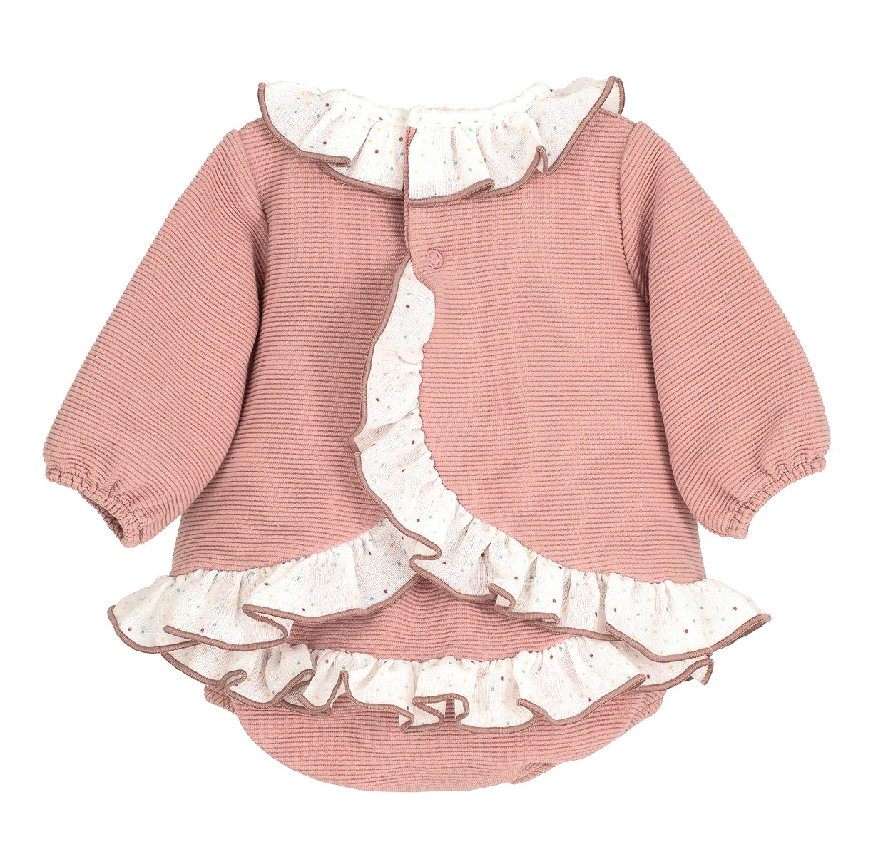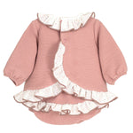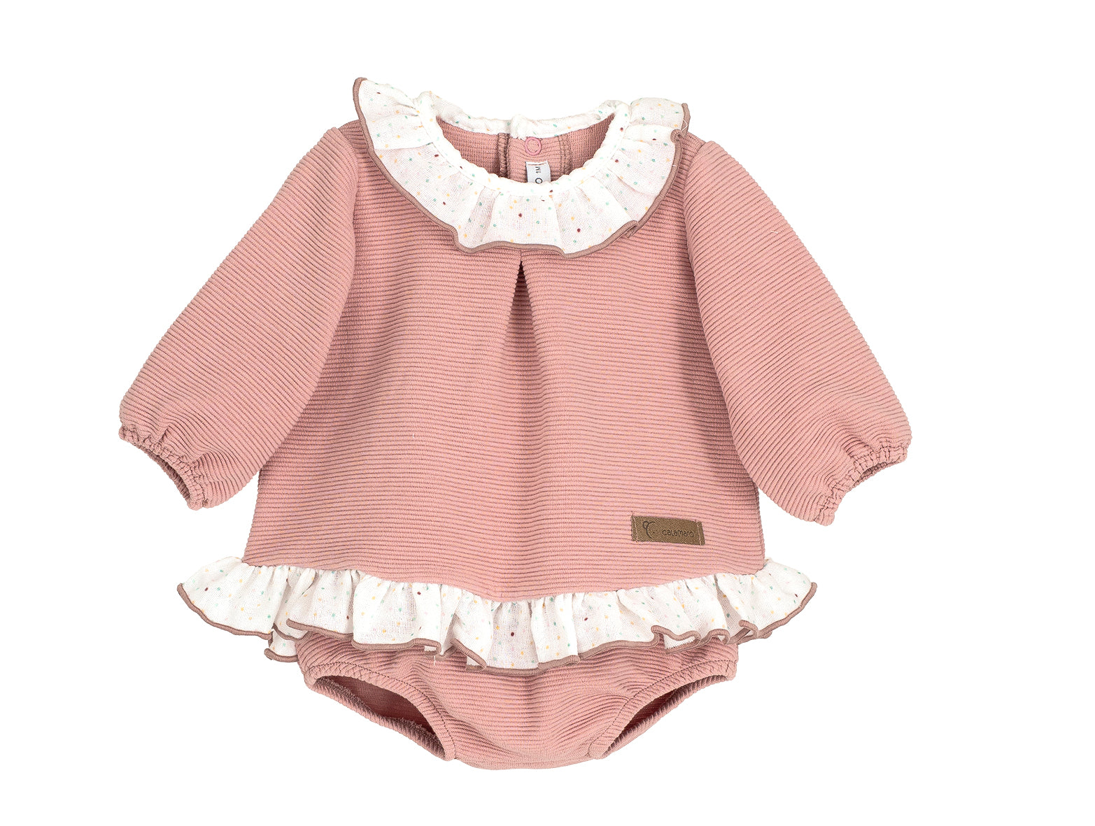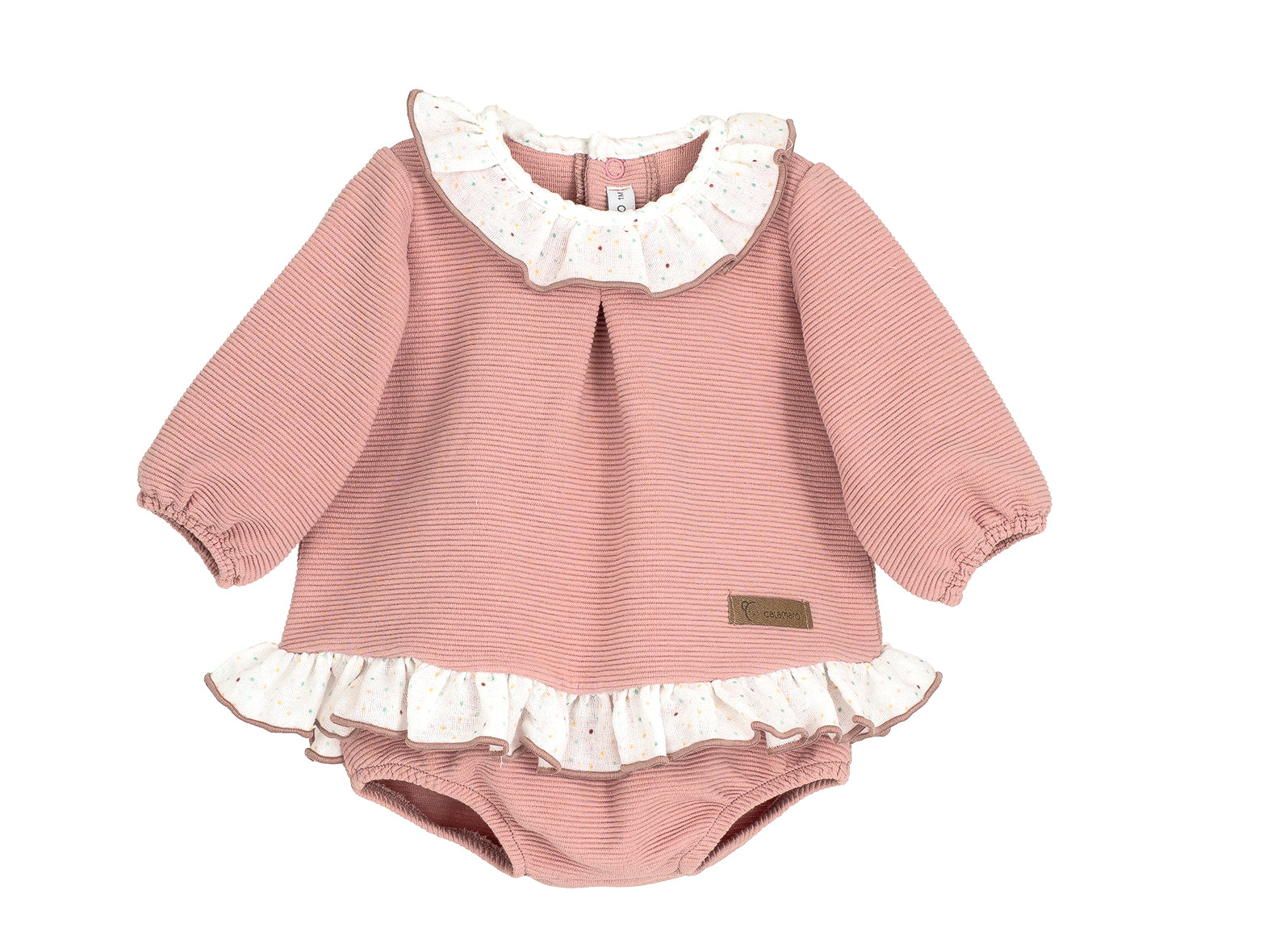 Questo completo per neonata, è realizzato in caldo cotone millerighe, garantendo comfort e morbidezza sulla pelle delicata. Il design elegante è arricchito da un collo rouches raffinato, che aggiunge un tocco di stile senza rinunciare alla praticità. La culotte abbinata completa l’outfit, ideale per mantenere la piccola comoda e alla moda in ogni occasione.