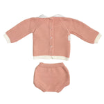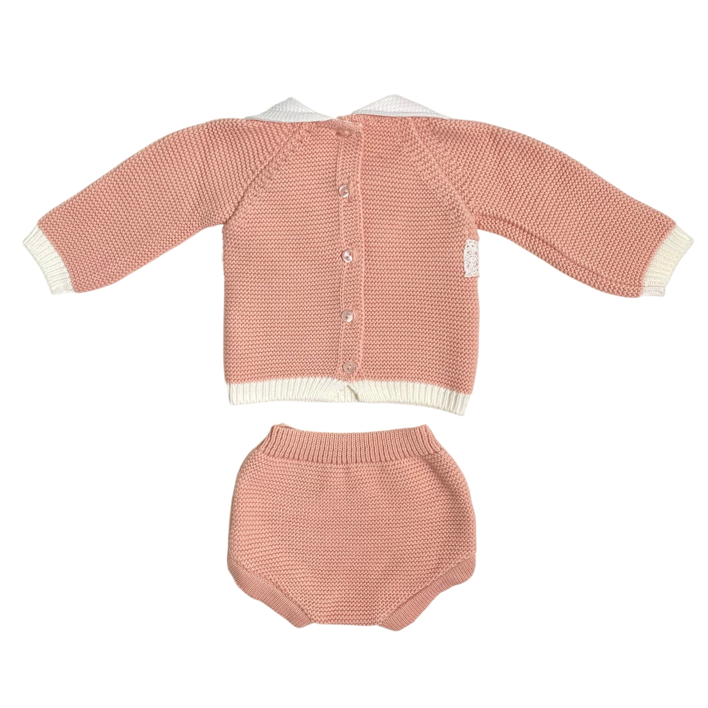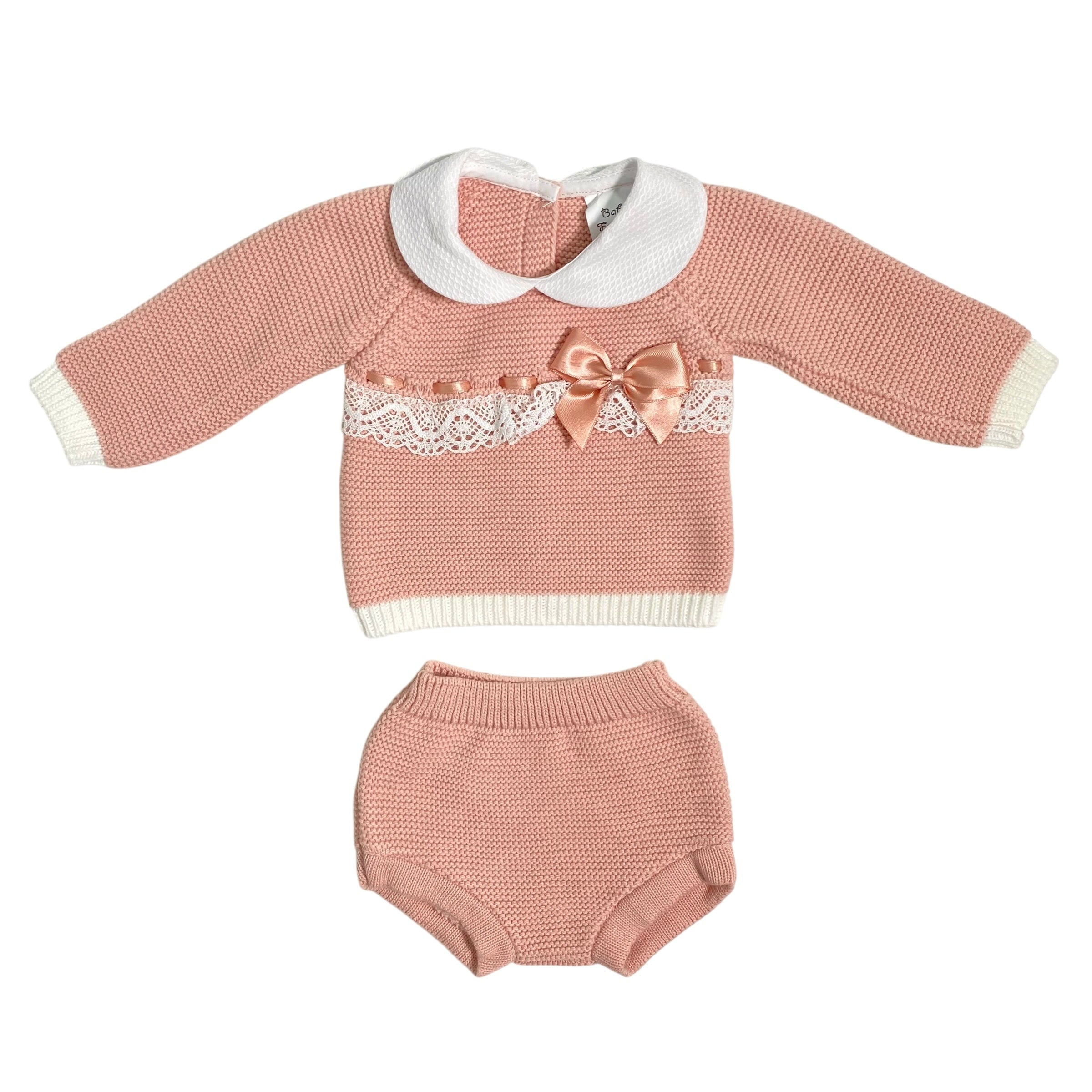 Questo completo invernale per neonata, composto da un maglioncino con collo piquet impreziosito da un delicato pizzo e un fiocco sul davanti, unisce eleganza e raffinatezza. La culotte in tinta unita completa il set, garantendo praticità e comfort per i più piccoli. Perfetto per mantenere la bambina calda senza rinunciare a uno stile ricercato.