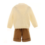 Questo completo elegante per neonato, composto da bermuda in panno con risvolto e bretelle, una camicia panna, papillon in tessuto a pois e cardigan a V, unisce stile raffinato e comfort. Perfetto per occasioni speciali, garantisce un look sofisticato e curato nello stile alla moda. La scelta dei materiali e le finiture garantiscono eleganza senza rinunciare alla praticità per il piccolo.