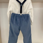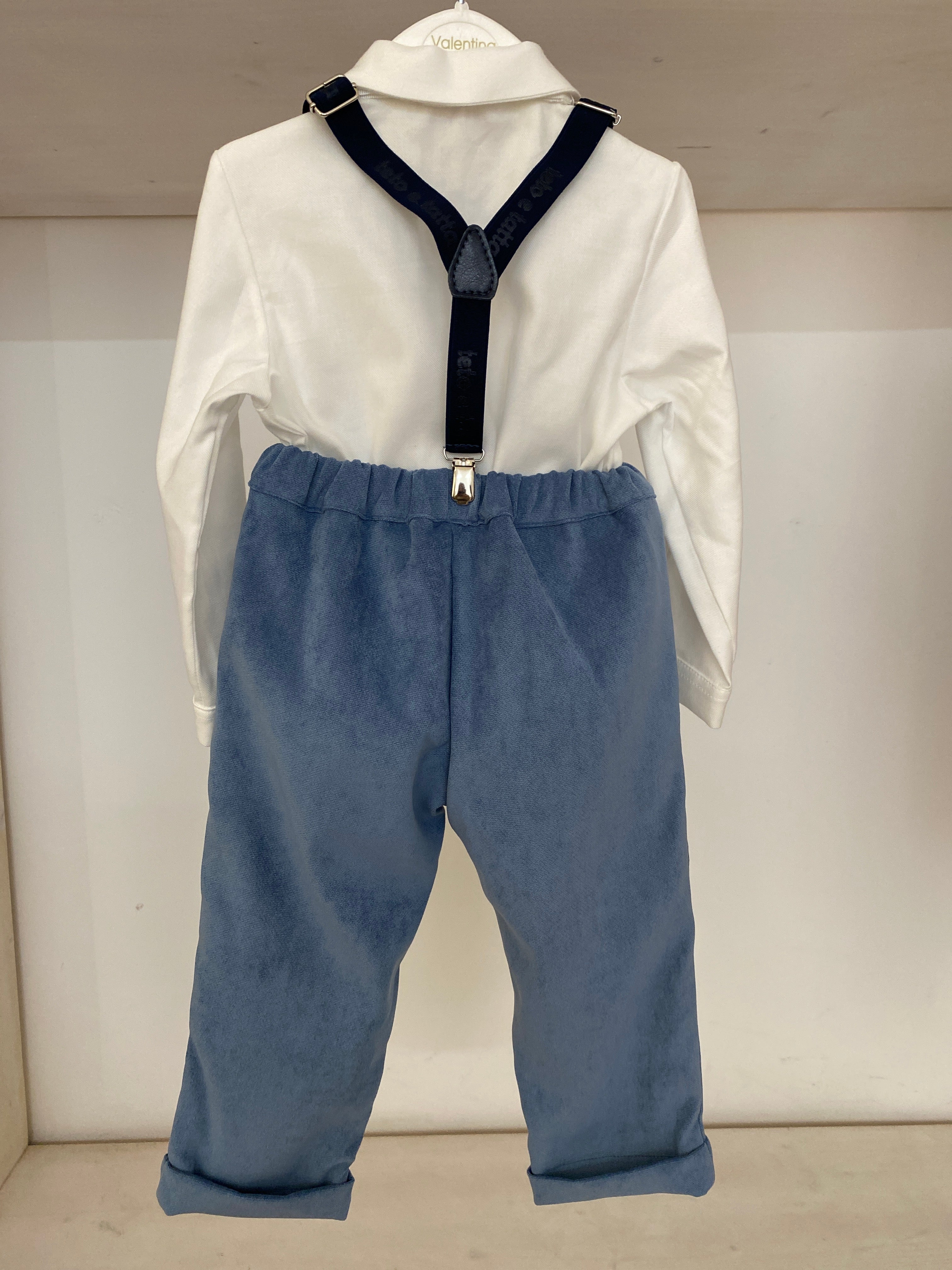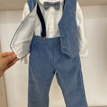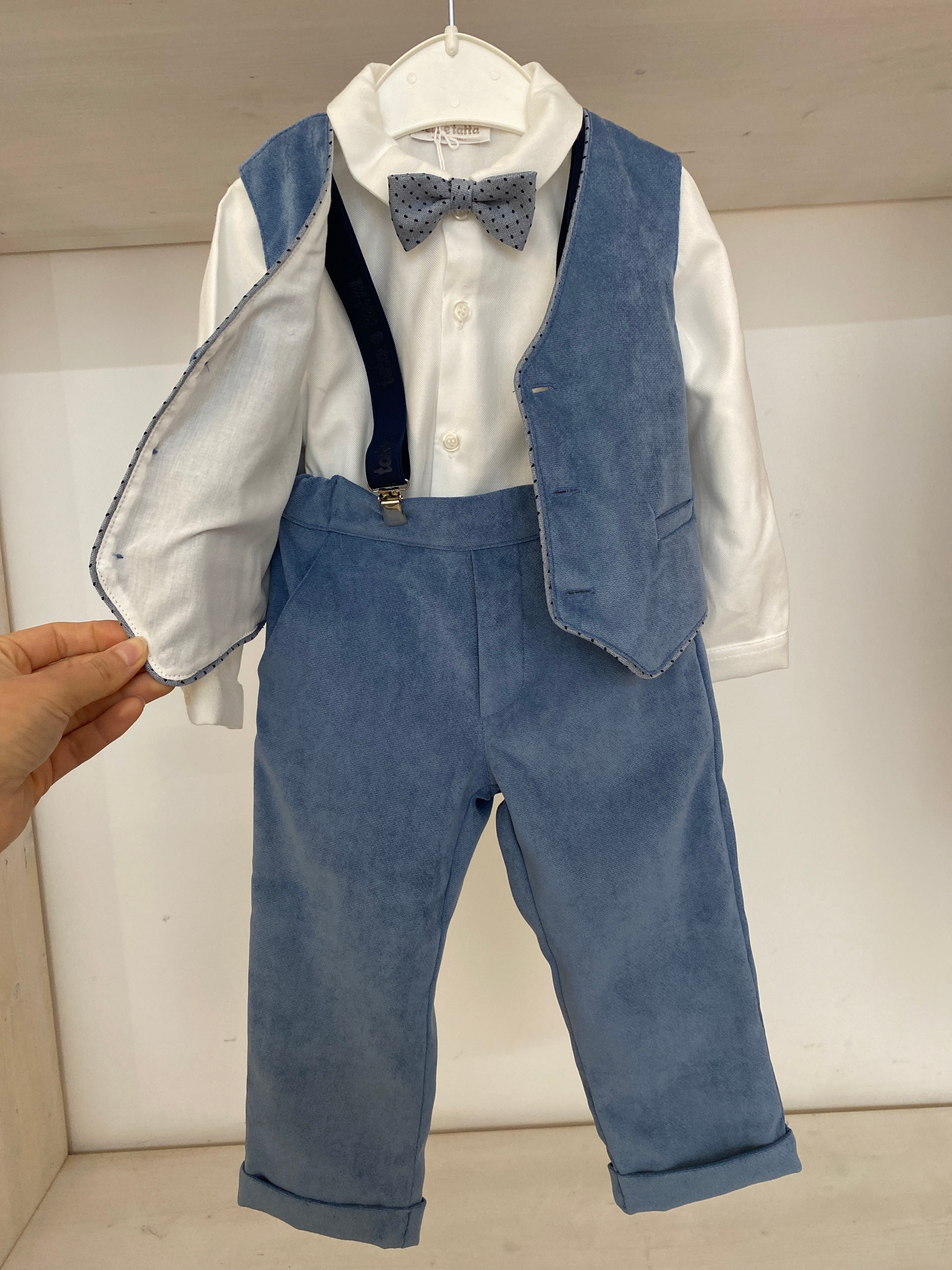 Questo completo elegante per neonato comprende una salopette in velluto con bretelle, una camicia a body, un panciotto coordinato in velluto e un papillon abbinato. Perfetto per occasioni speciali come battesimi, primo compleanno e cerimonie, unisce confort e stile raffinato, garantendo al bambino un aspetto impeccabile senza rinunciare alla comodità.