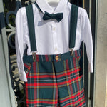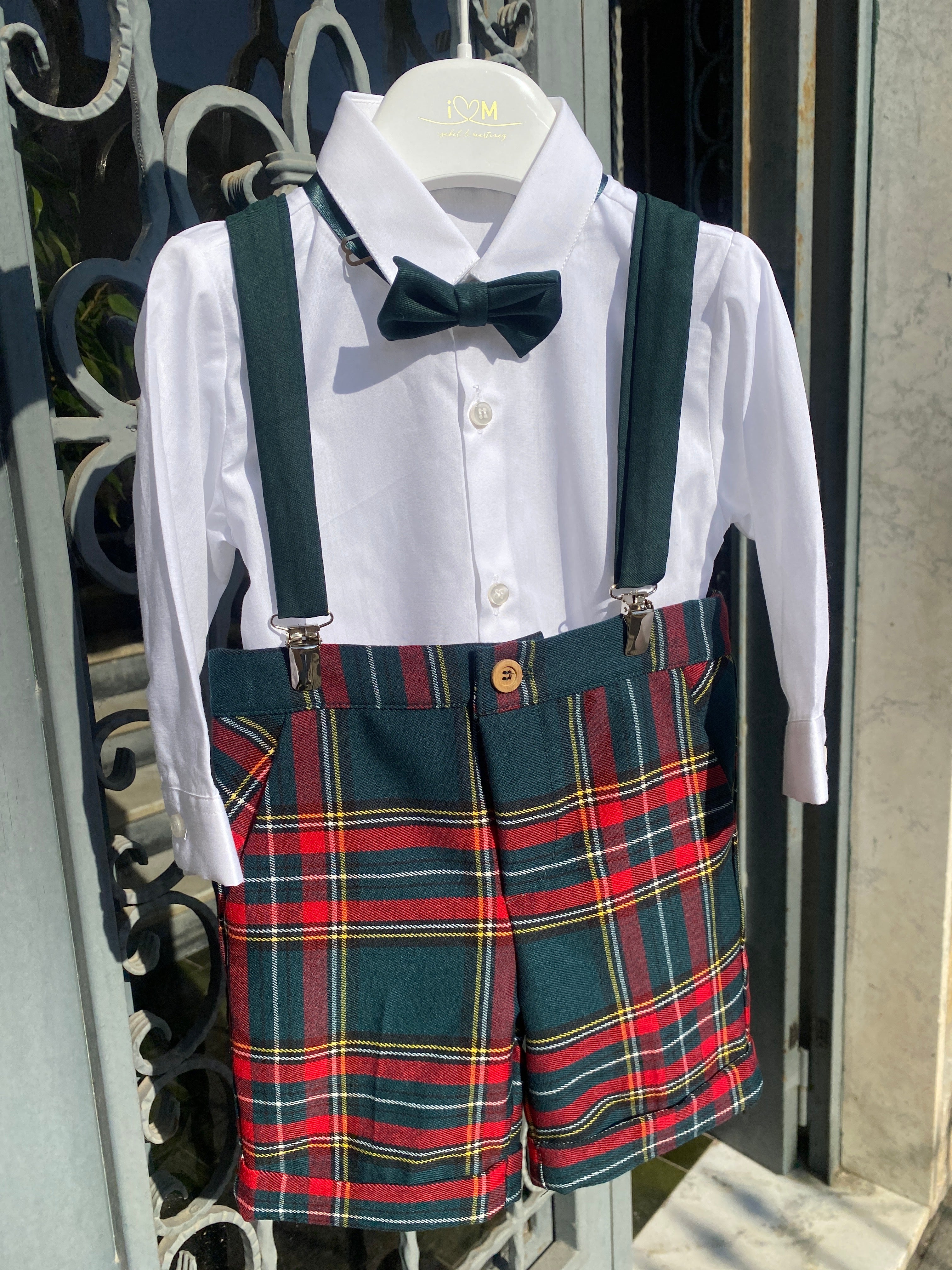 Completo natalizio raffinato per il vostro piccolo, realizzato con bermuda in tartan scozzese che cattura l'eleganza tradizionale delle festività. La camicia in cotone bianco puro garantisce comfort e traspirabilità, mentre papillon e bretelle coordinate completano un look sofisticato e versatile. Perfetto per occasioni speciali, fotografie di famiglia e celebrazioni natalizie, questo insieme unisce stile classico e praticità per i più piccoli.