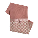 Coperta in lana vergine 100%, con applicazione di fascia centrale con fiocco in raso e lavorazione di tulle nella parte sottostante.