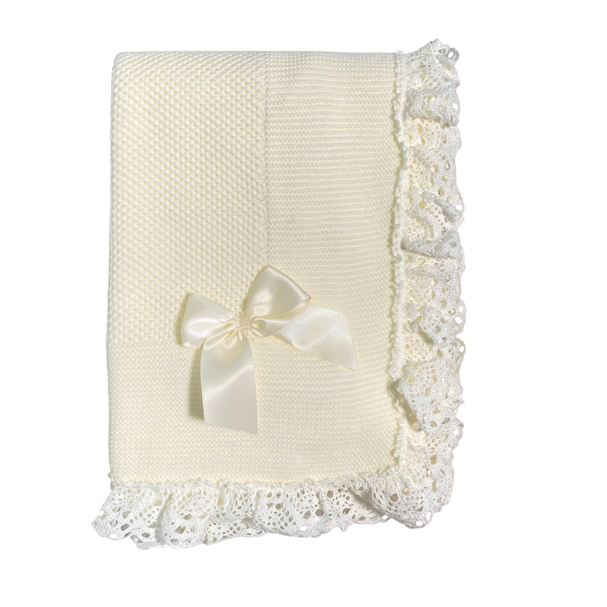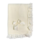 Questa coperta per neonato è realizzata in tessuto acrilico anallergico, arricchita da un bordo unico in pizzo e rifinita con un delicato fiocco in raso per un tocco di eleganza e comfort.