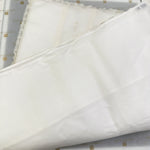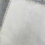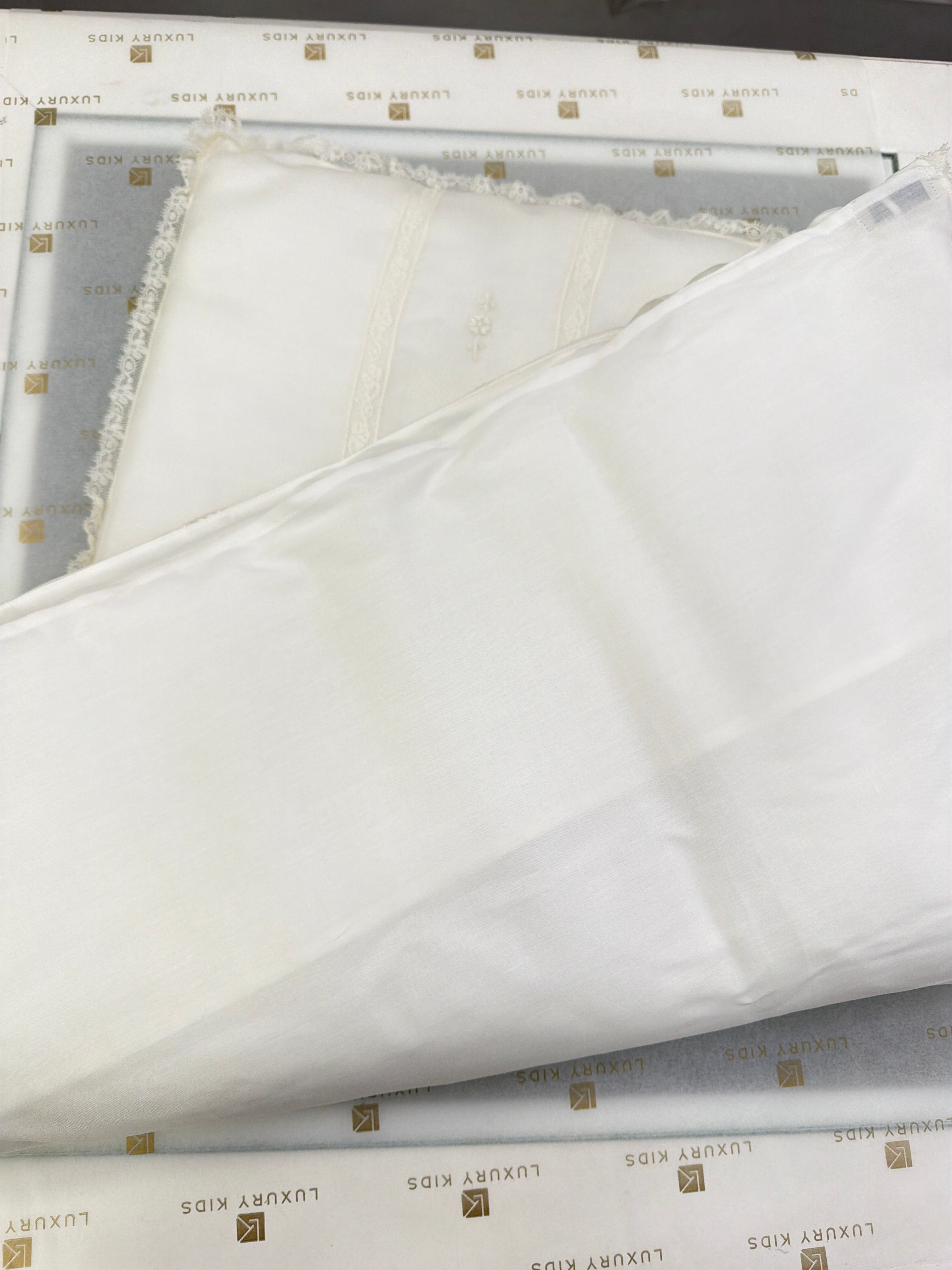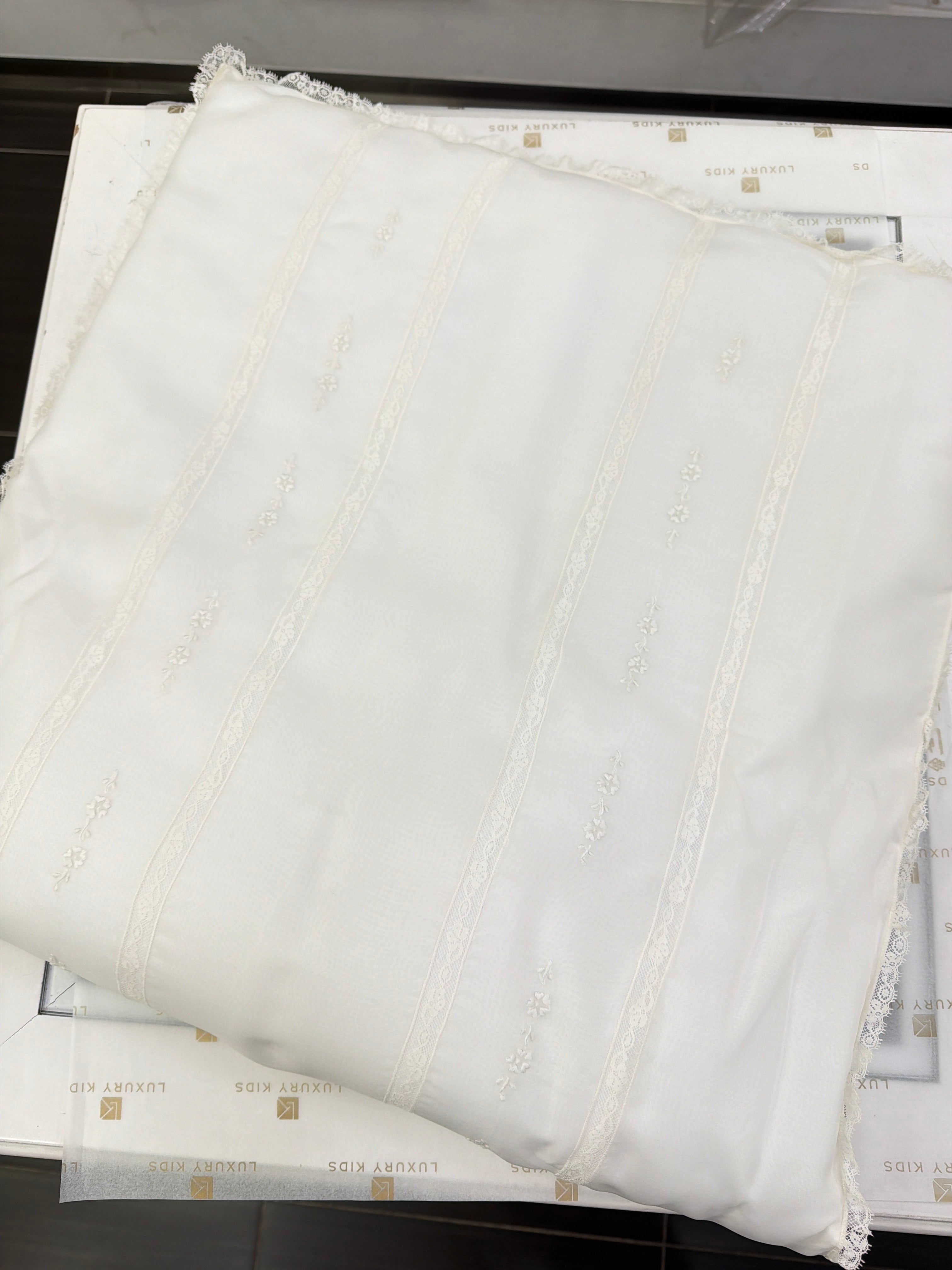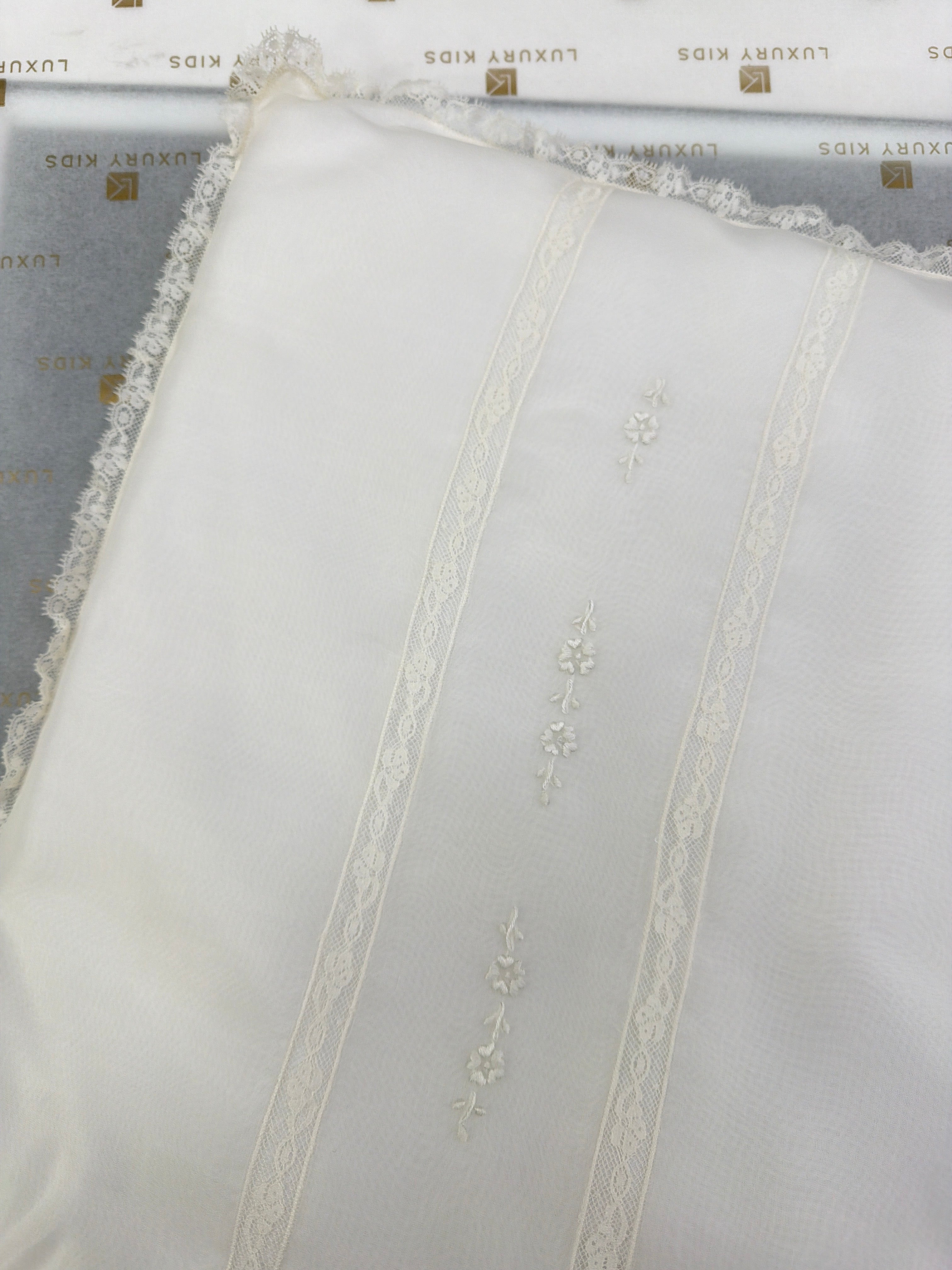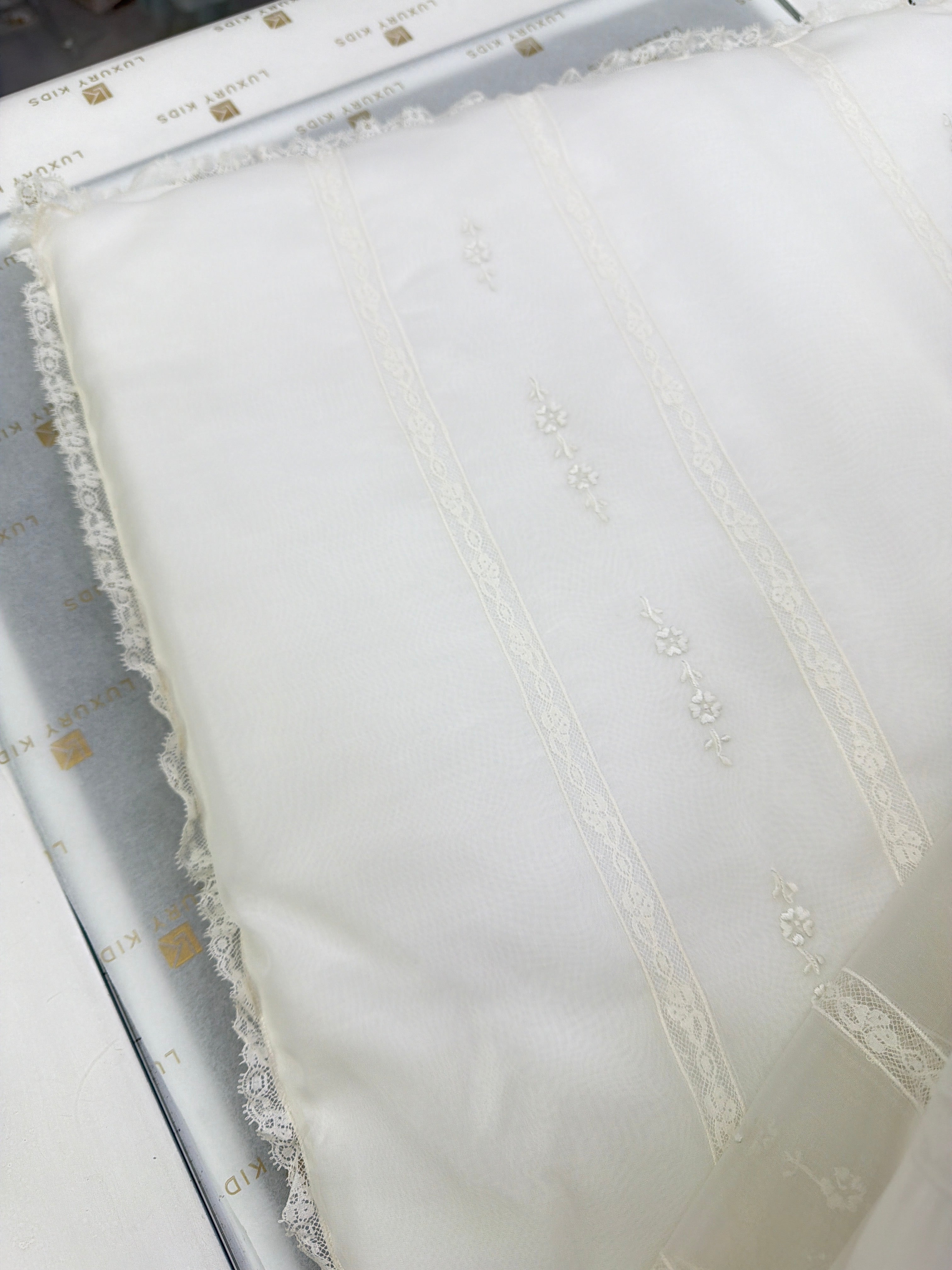 Copertina imbottita sfoderabile in organdis di seta, rifiniture in pizzo, e ricami sul davanti.