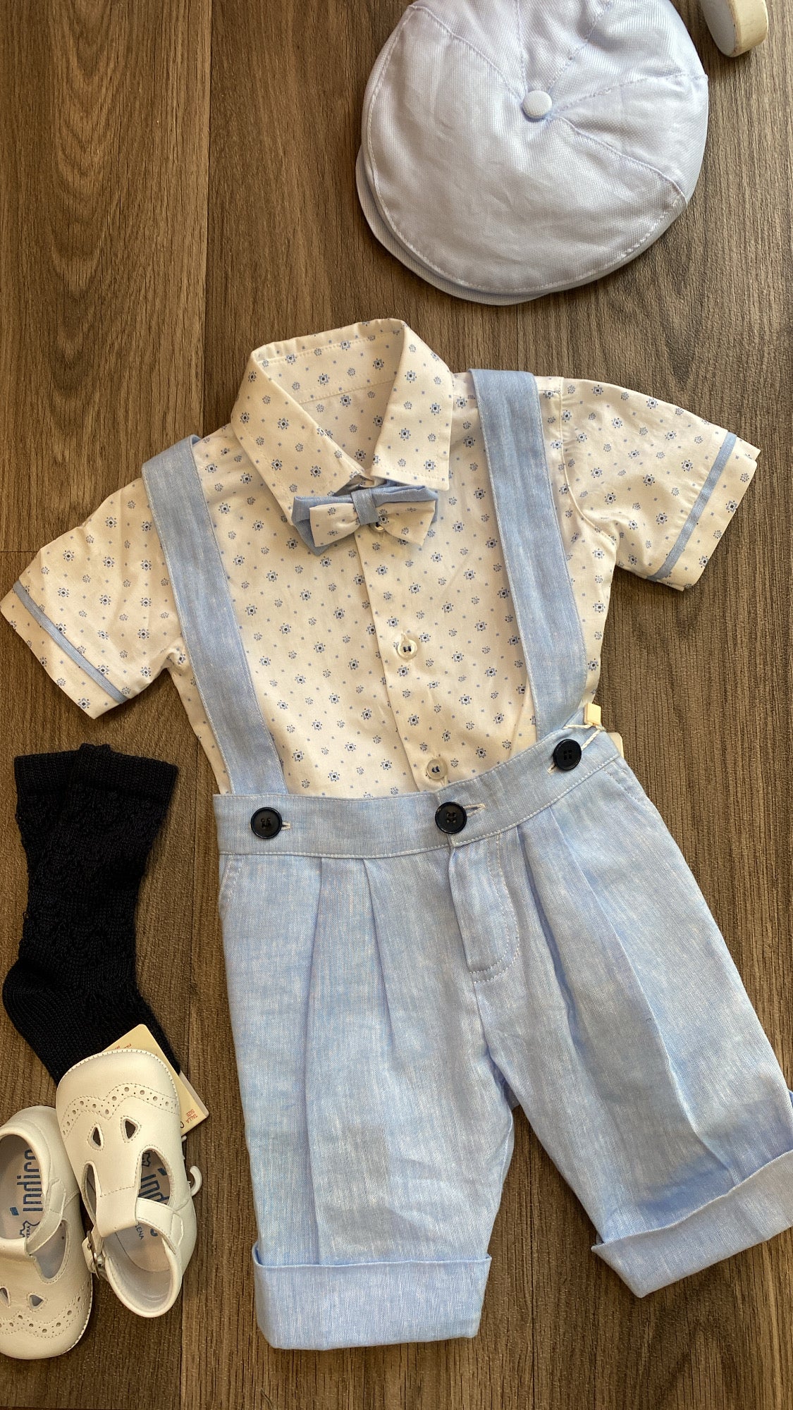 Completo composto da bermuda con bretelle in lino celeste, camicia mezza manica in cotone fantasia stampata e papillon.