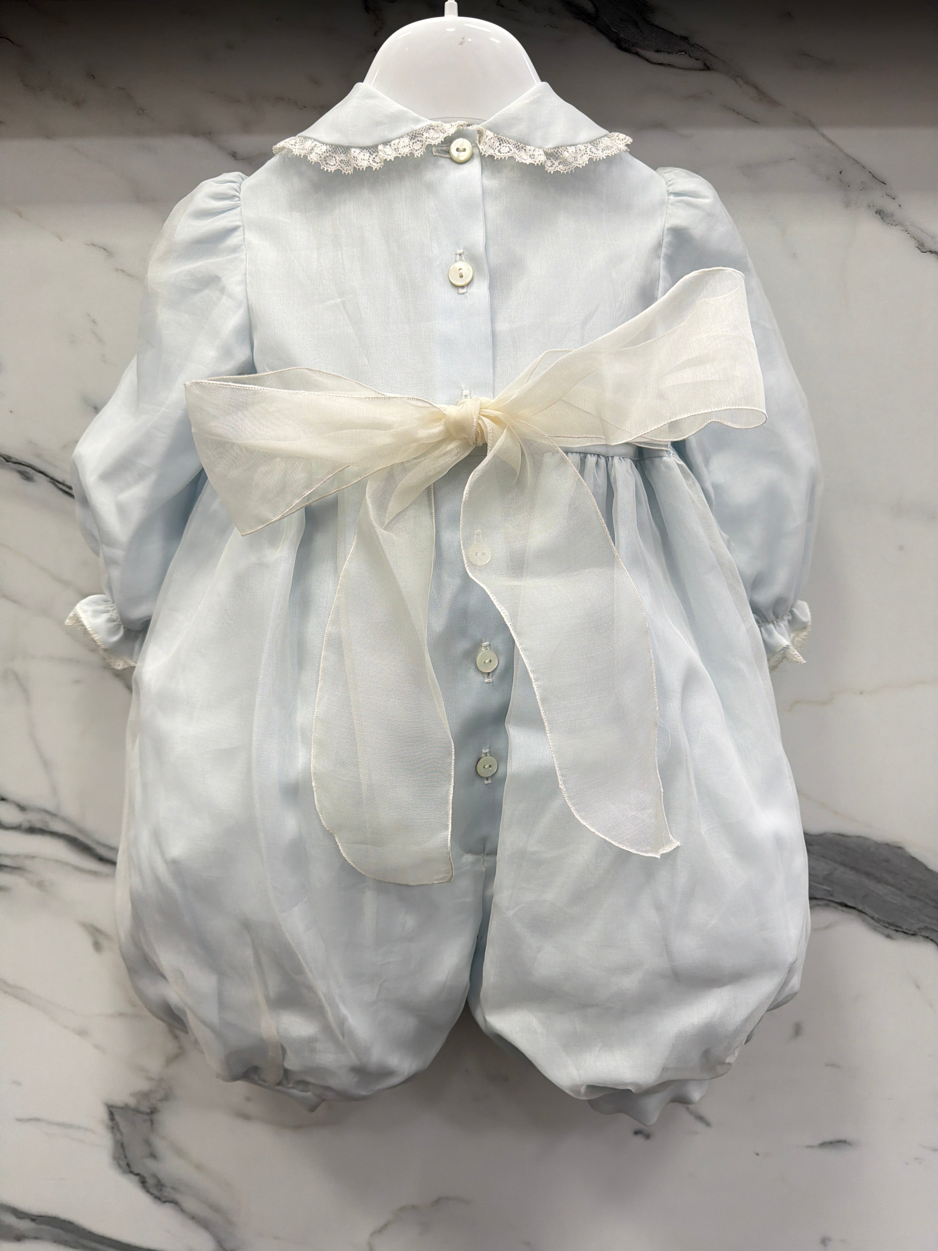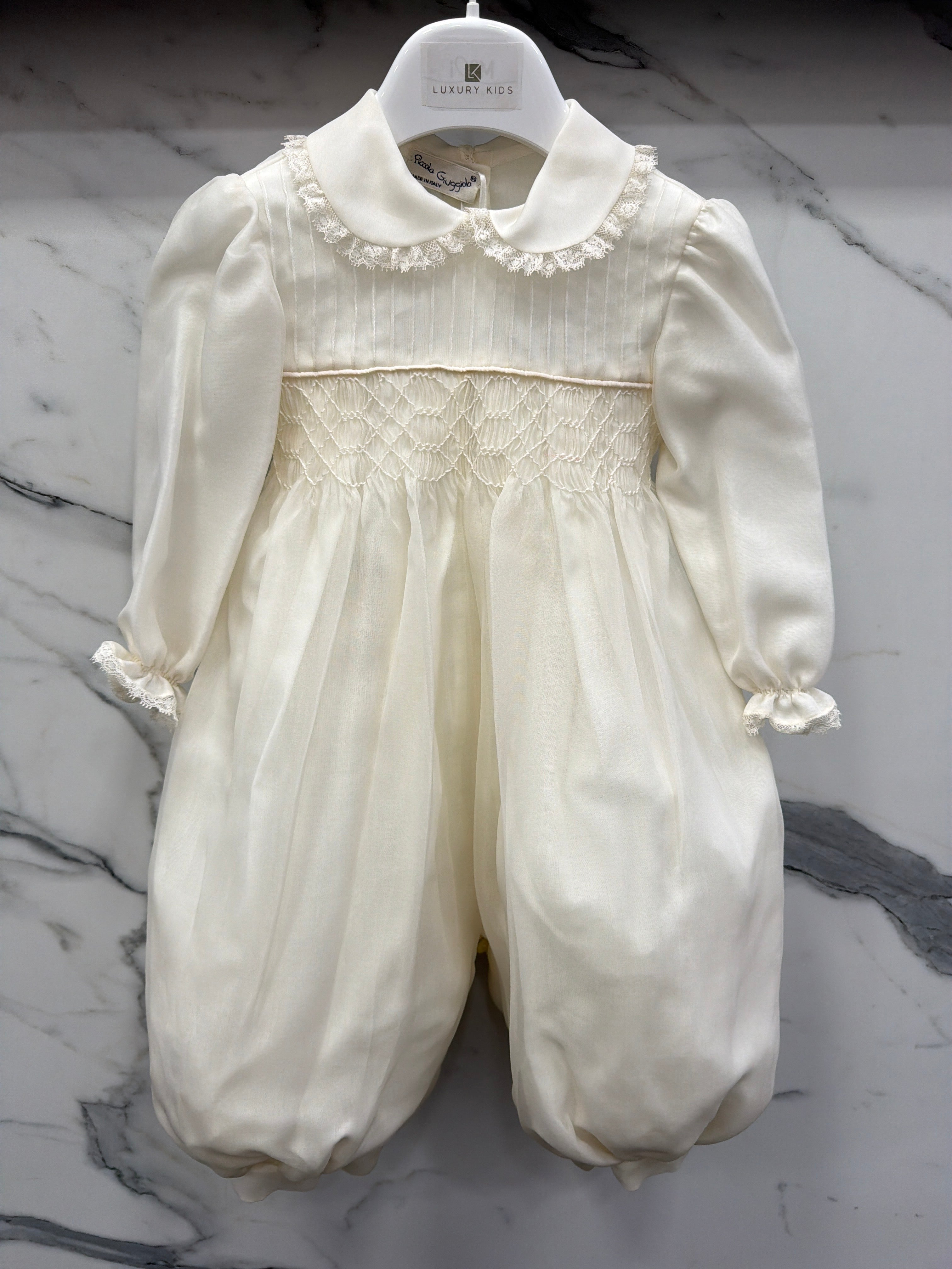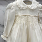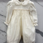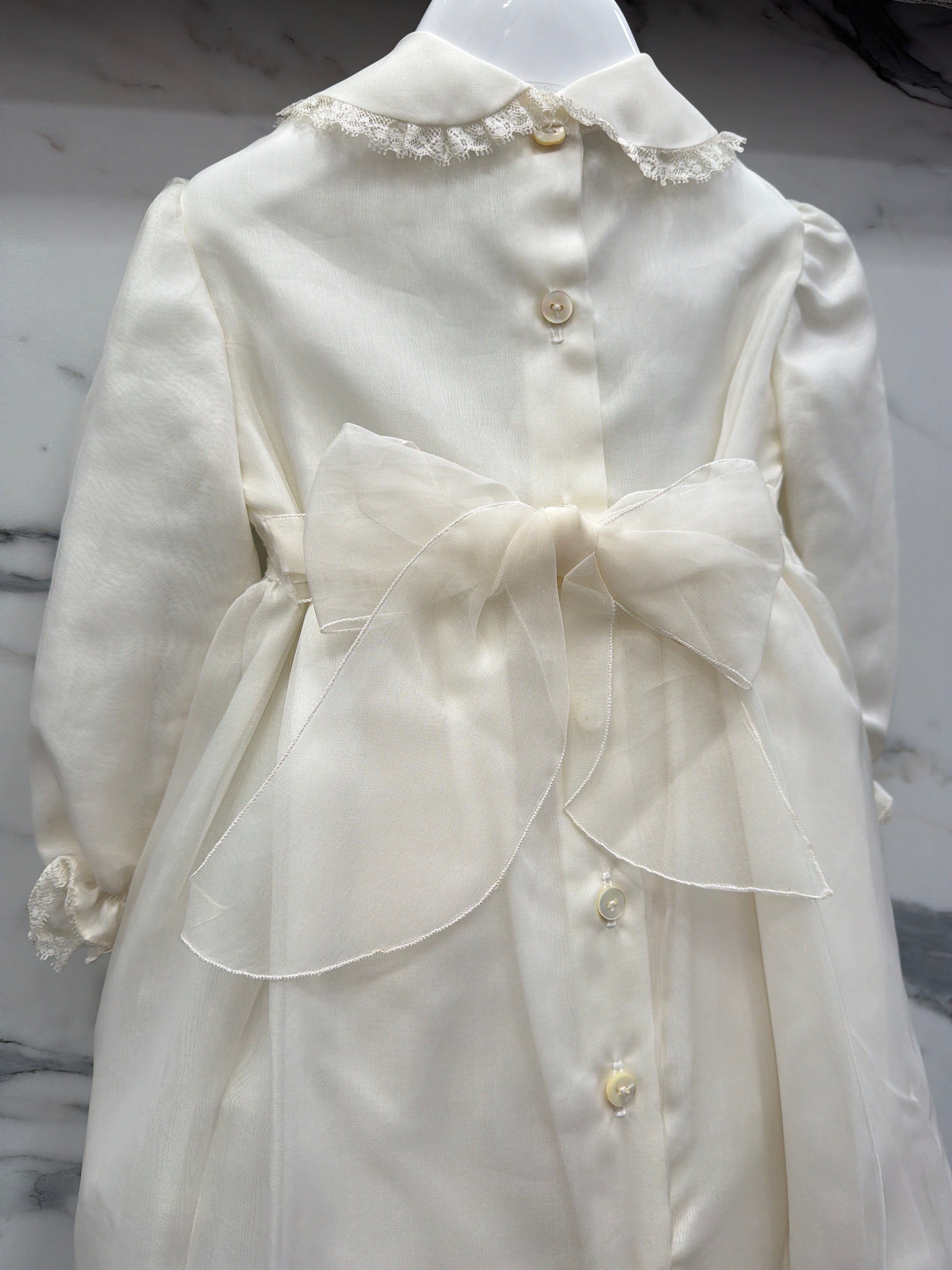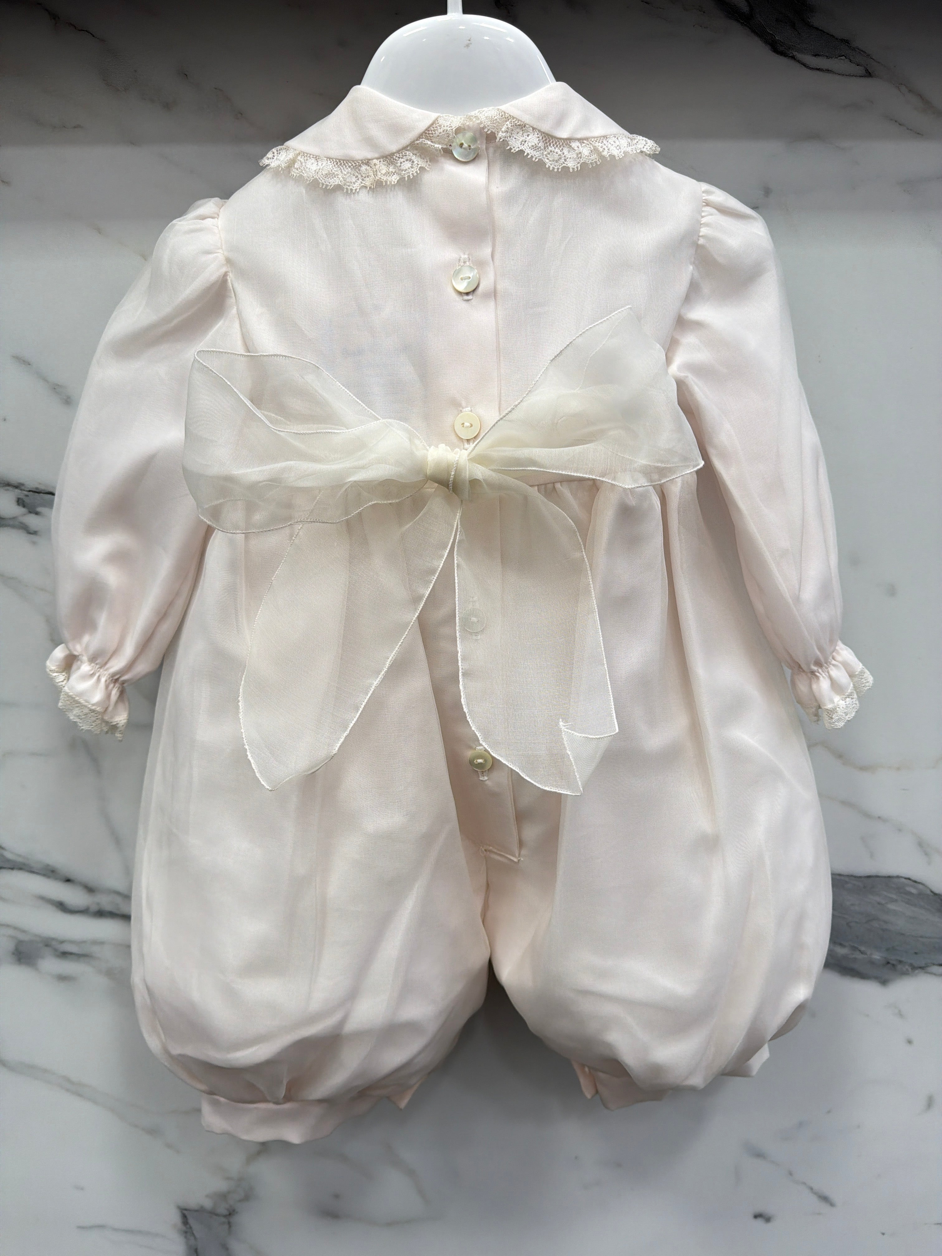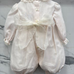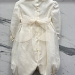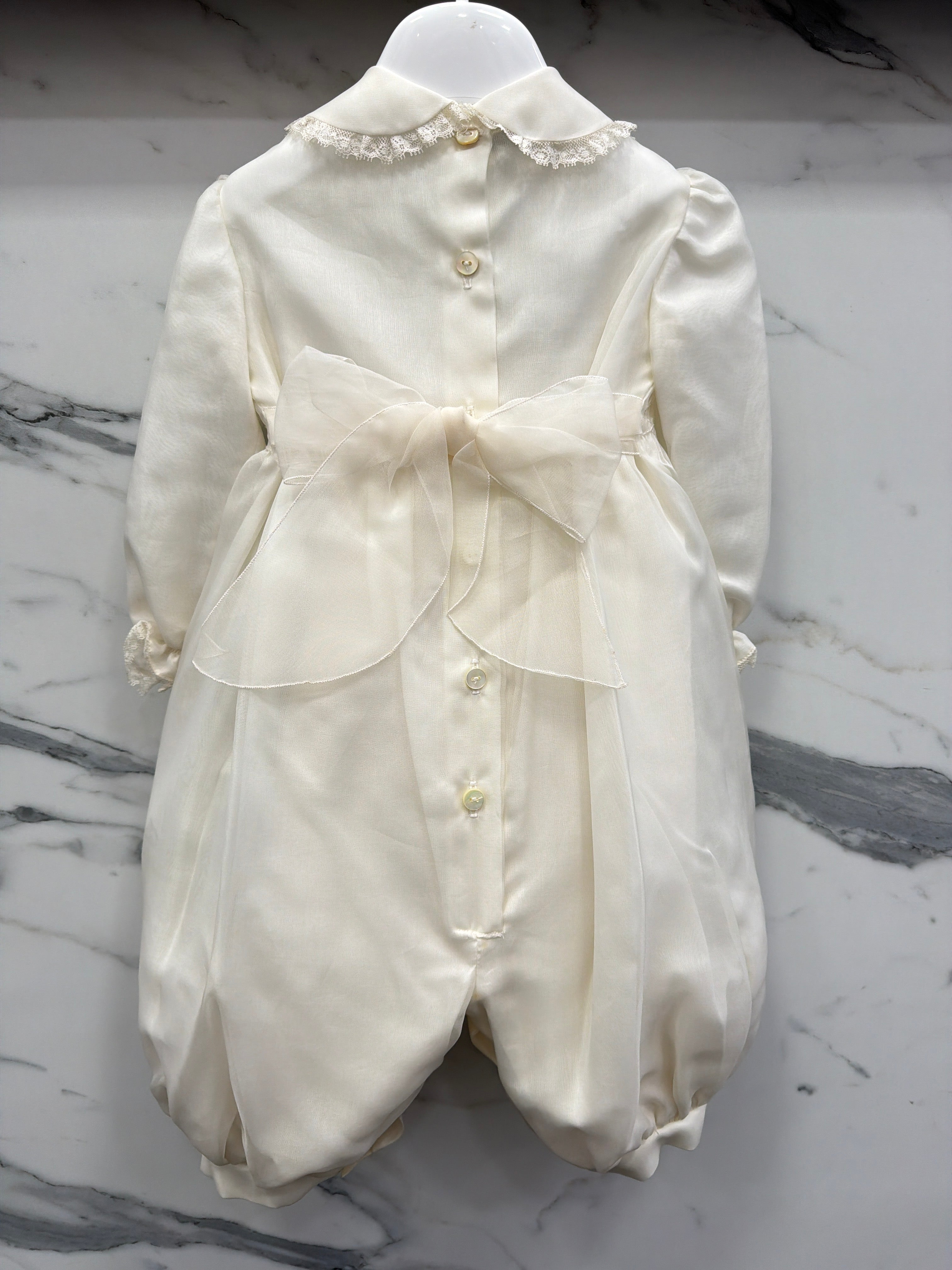 Elegant baptismal romper in silk organdis and lace.