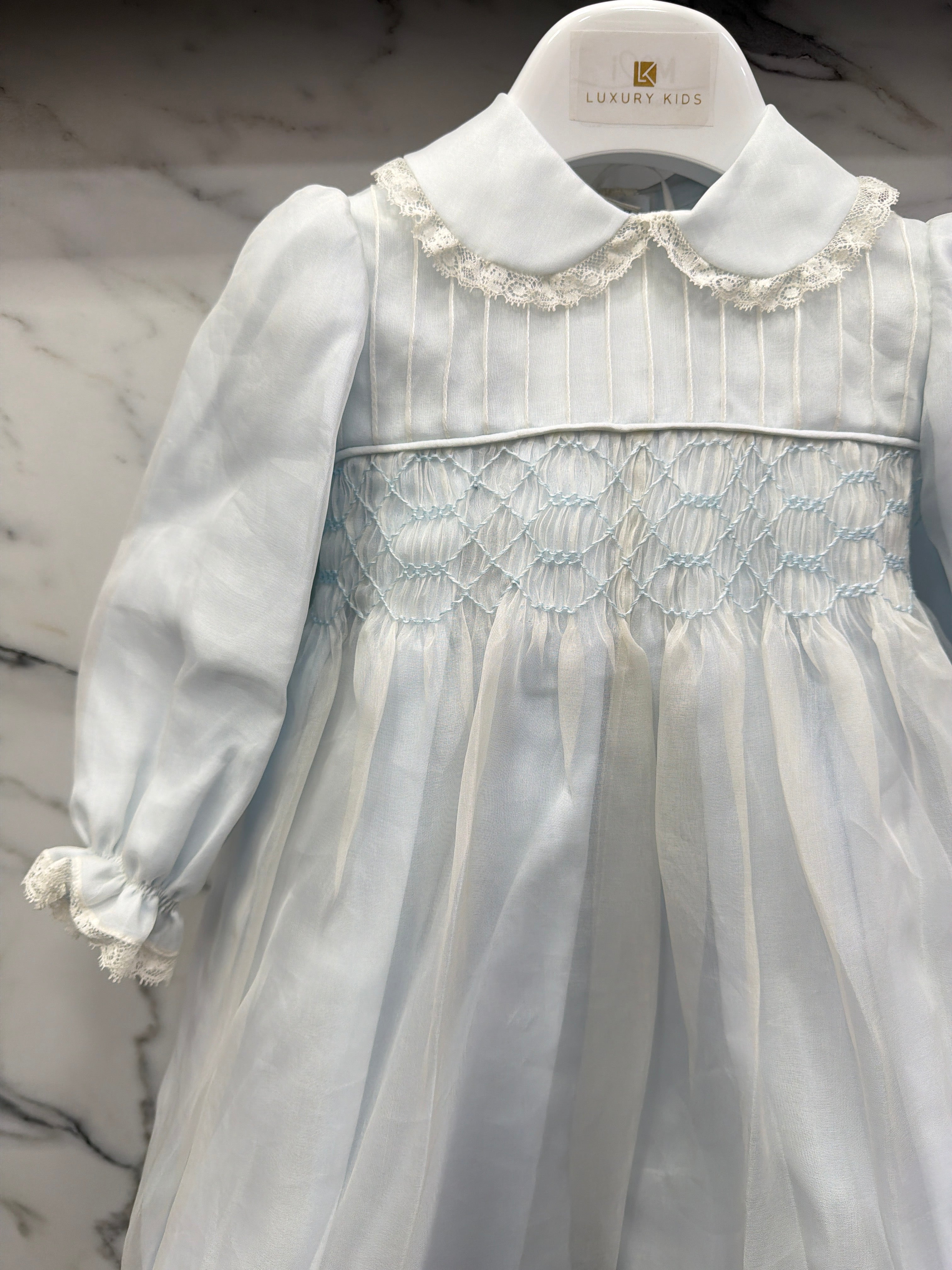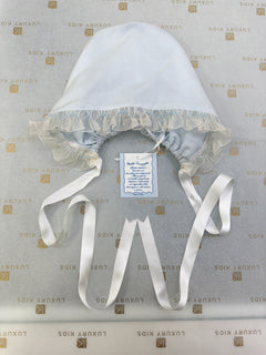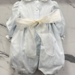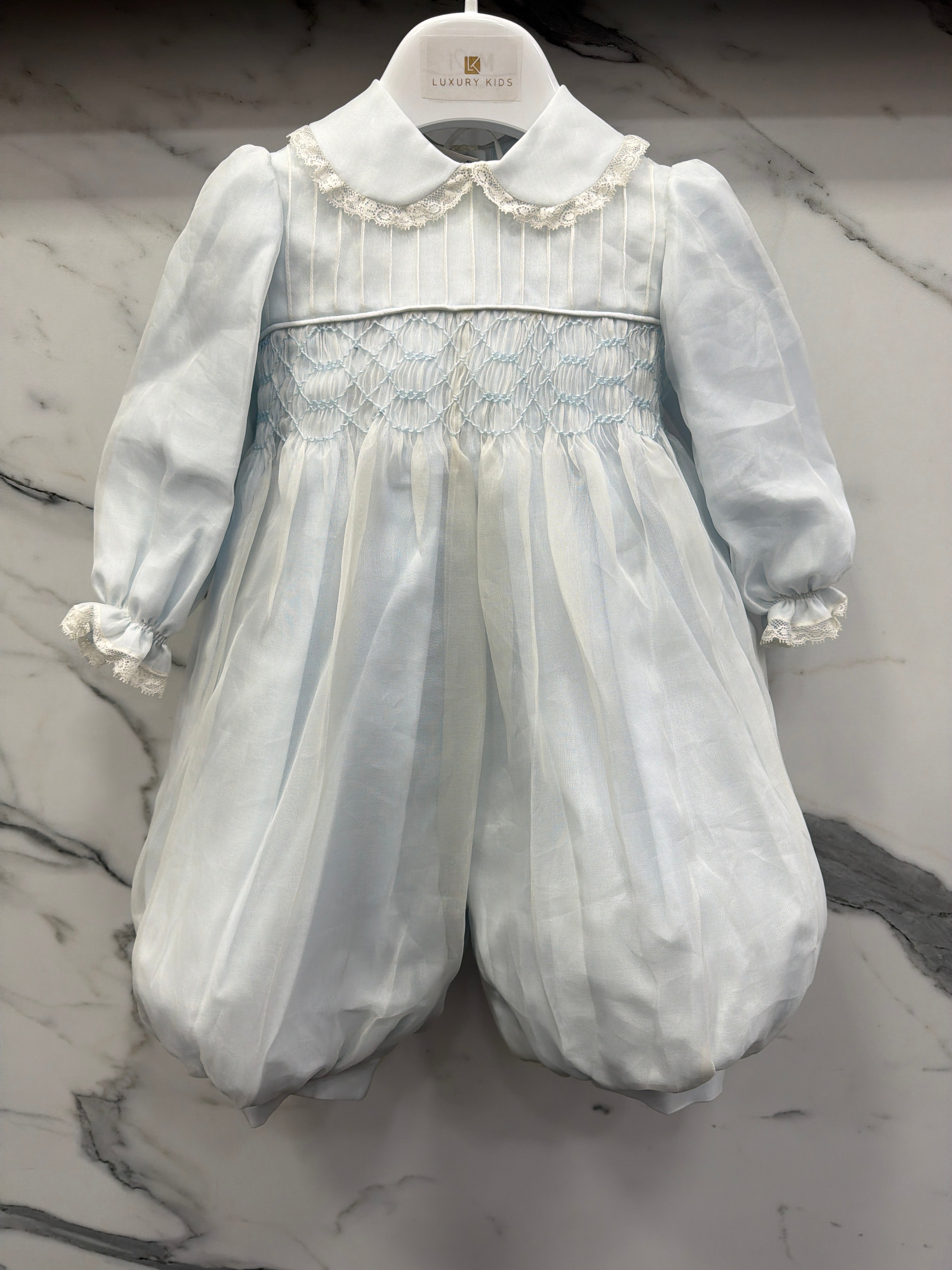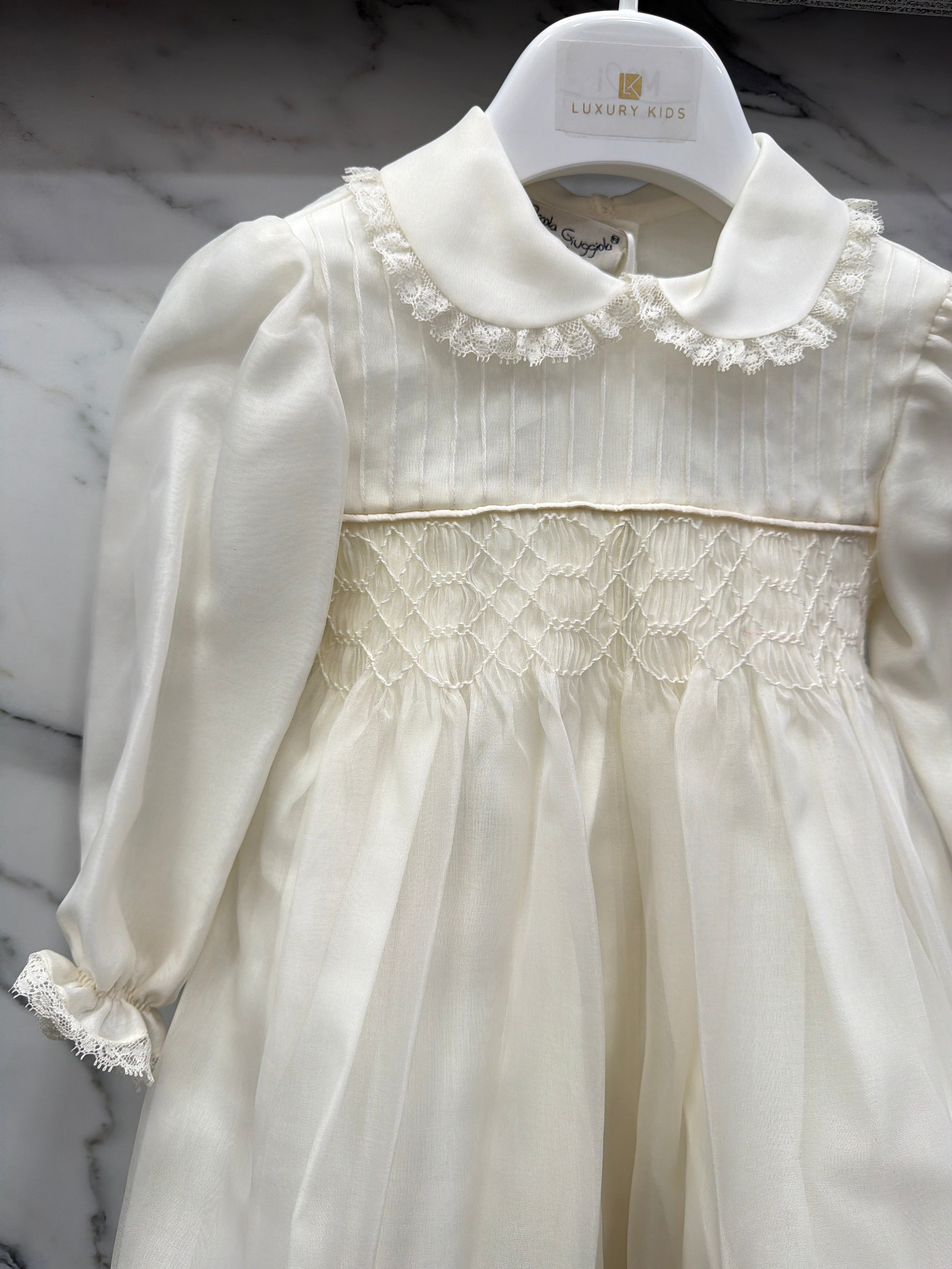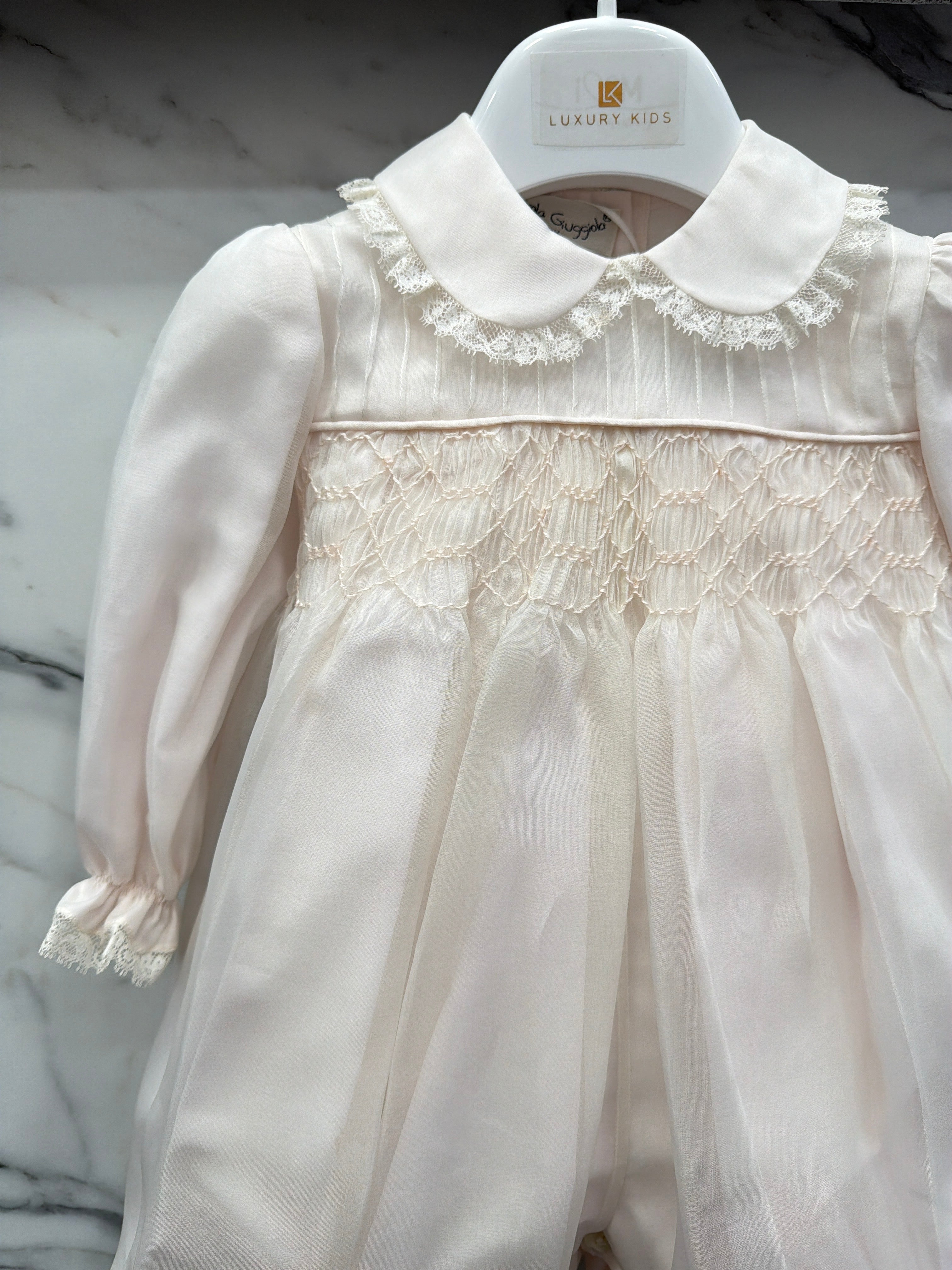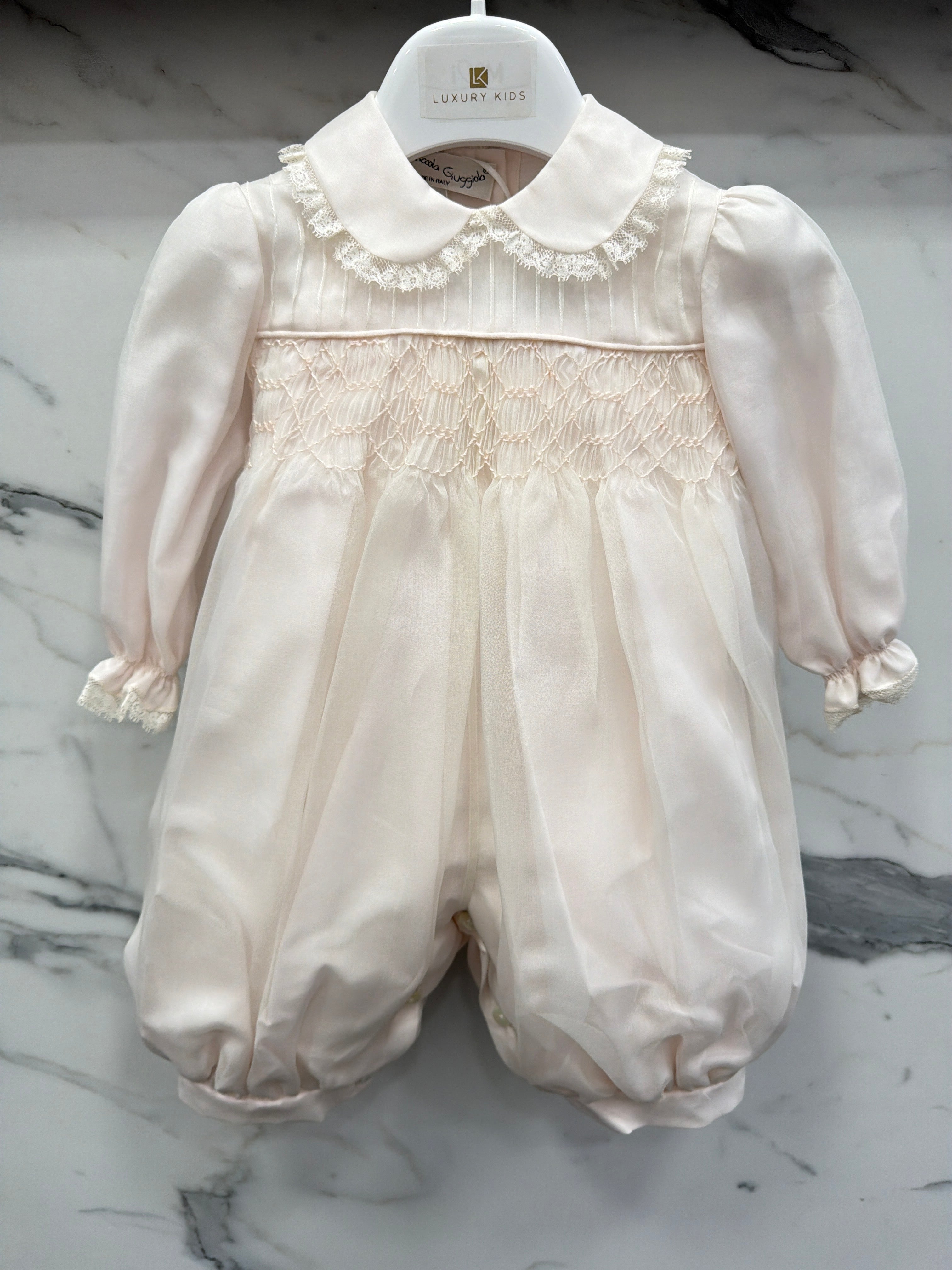 Elegant baptismal romper in silk organdis and lace.