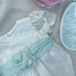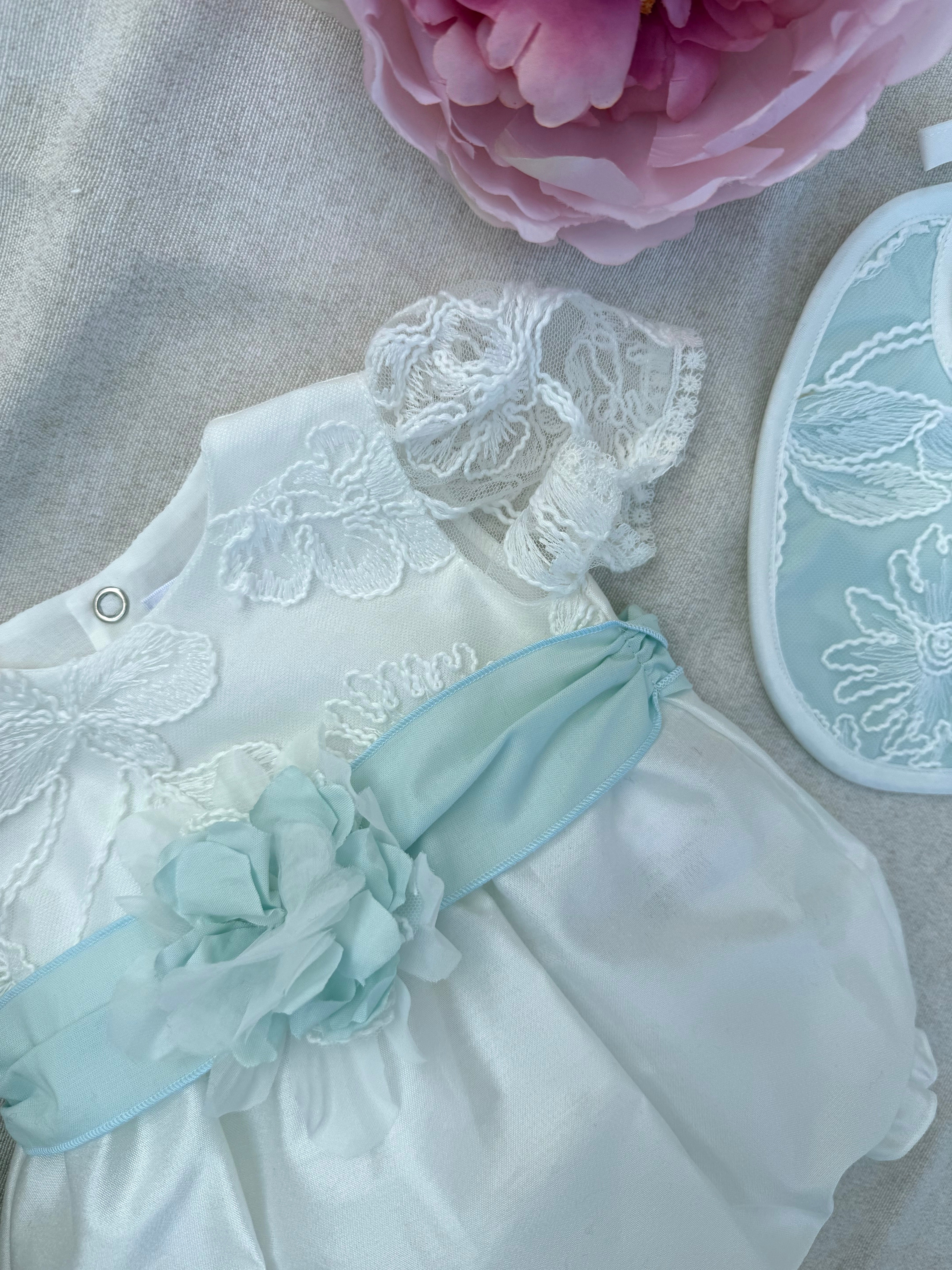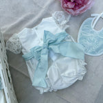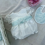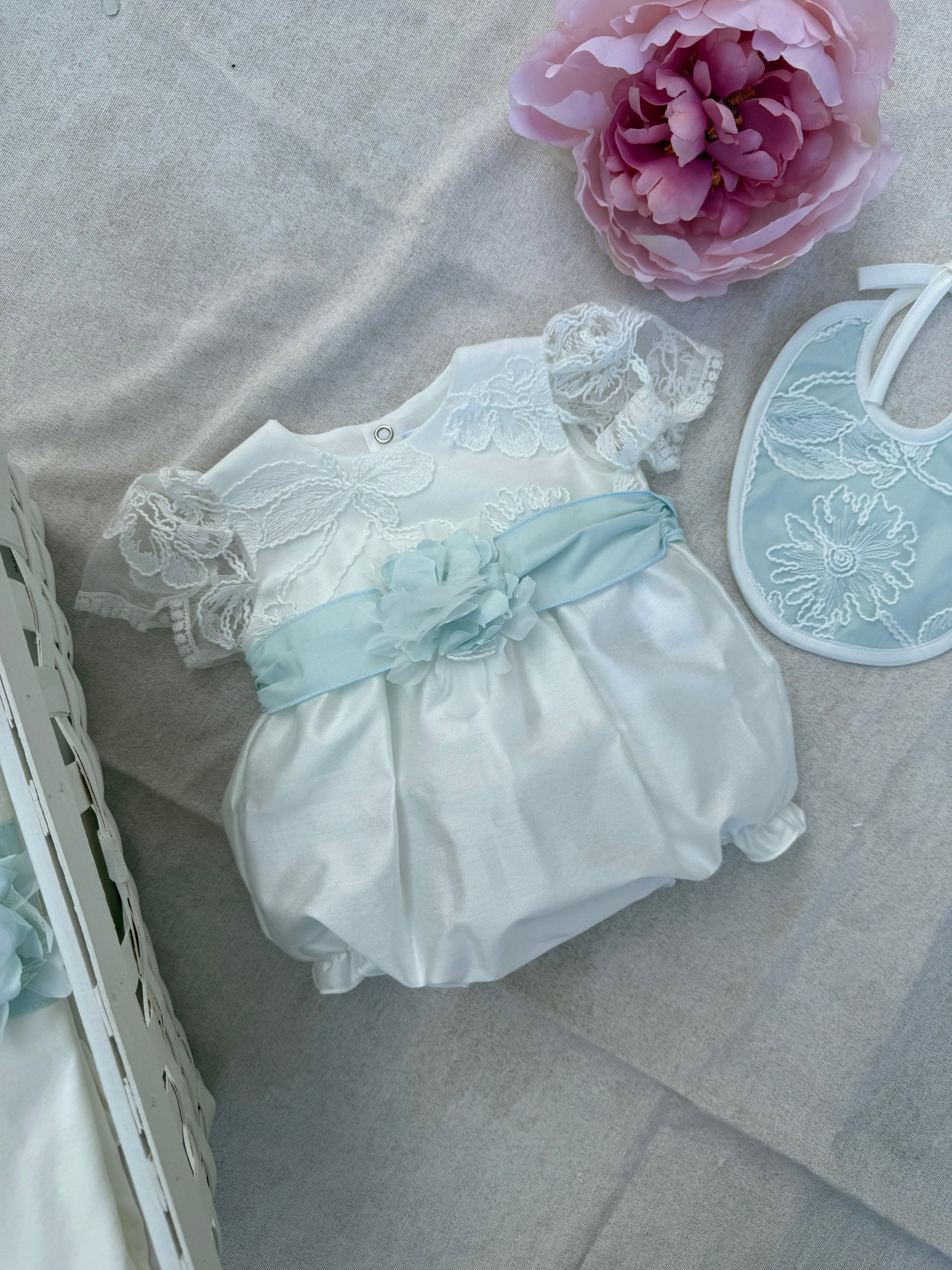 Immergi la tua neonata nel comfort e nell'eleganza con il Pagliaccetto in Taffetà Con Fiore Neonata TETO E TATTA PA7390. Questo pagliaccetto mezza manica in morbido taffetà è abbellito sul corpetto da pizzo e dalla cintura verde tiffany, con un grazioso fiore al centro e un fiocco sul retro. l'apertura con bottoni a pressione rendono questo pagliaccetto facile da indossare e pratico per i cambi di pannolino.